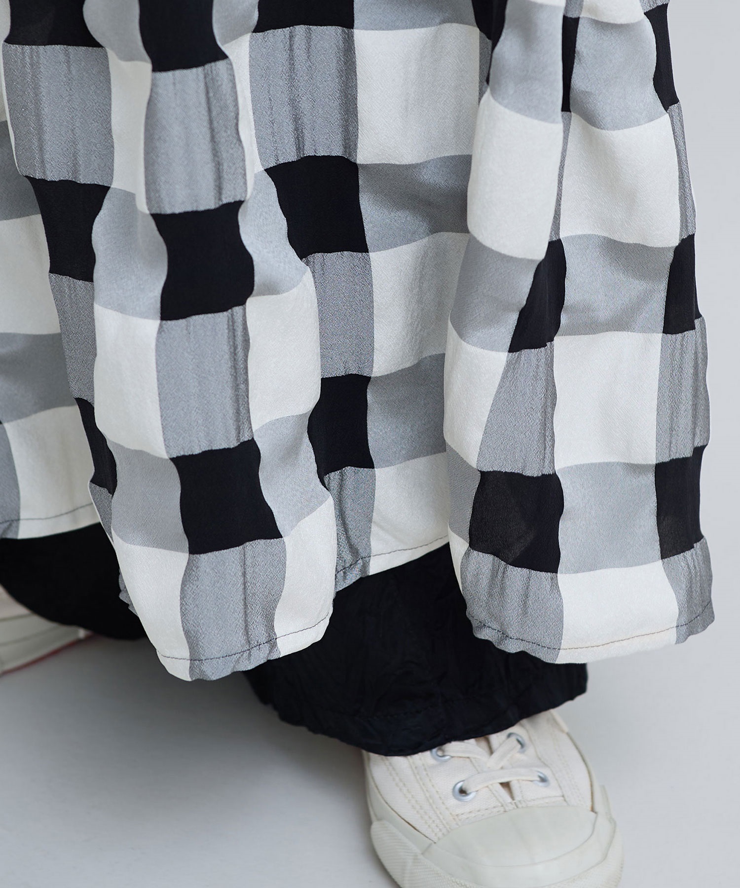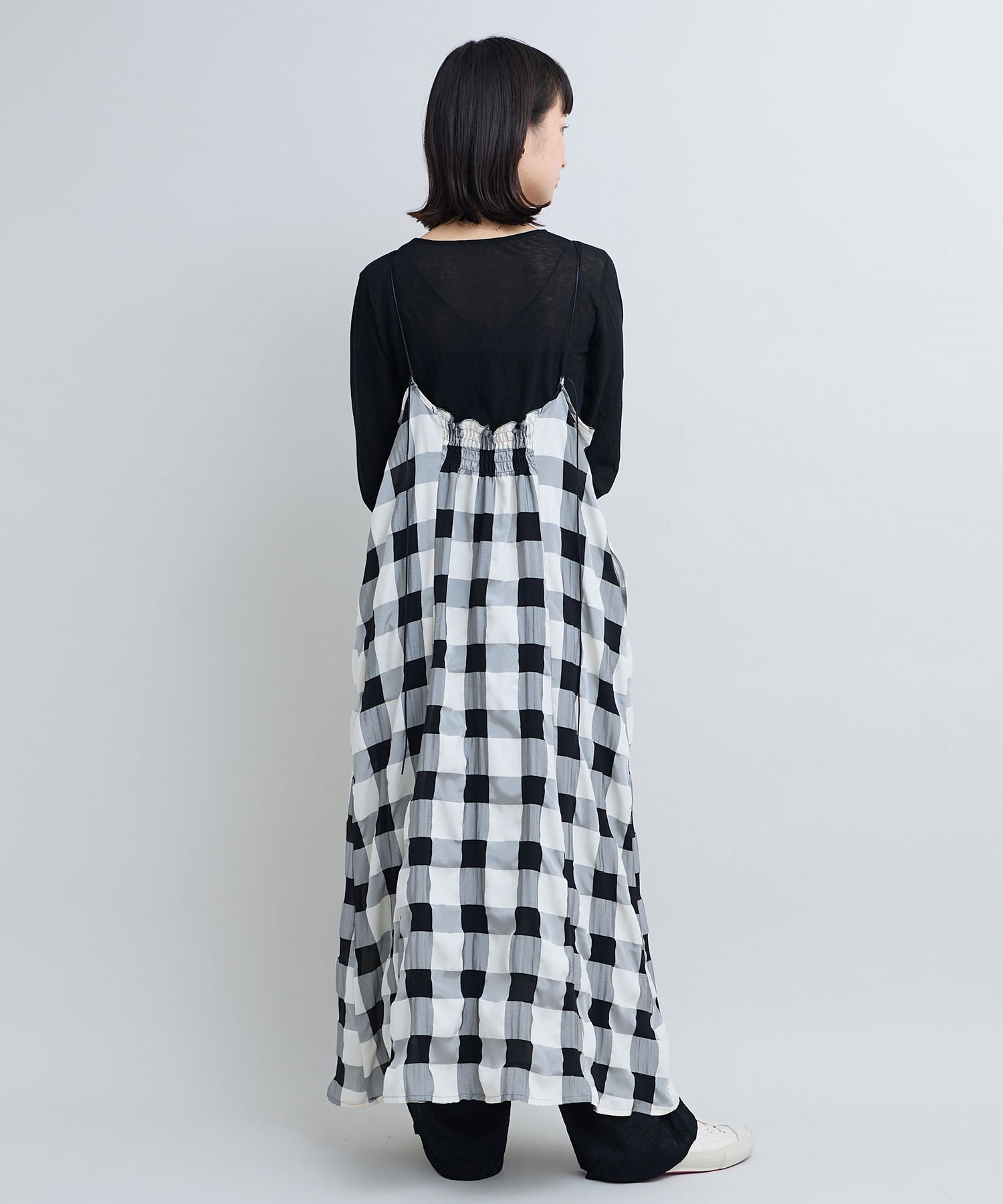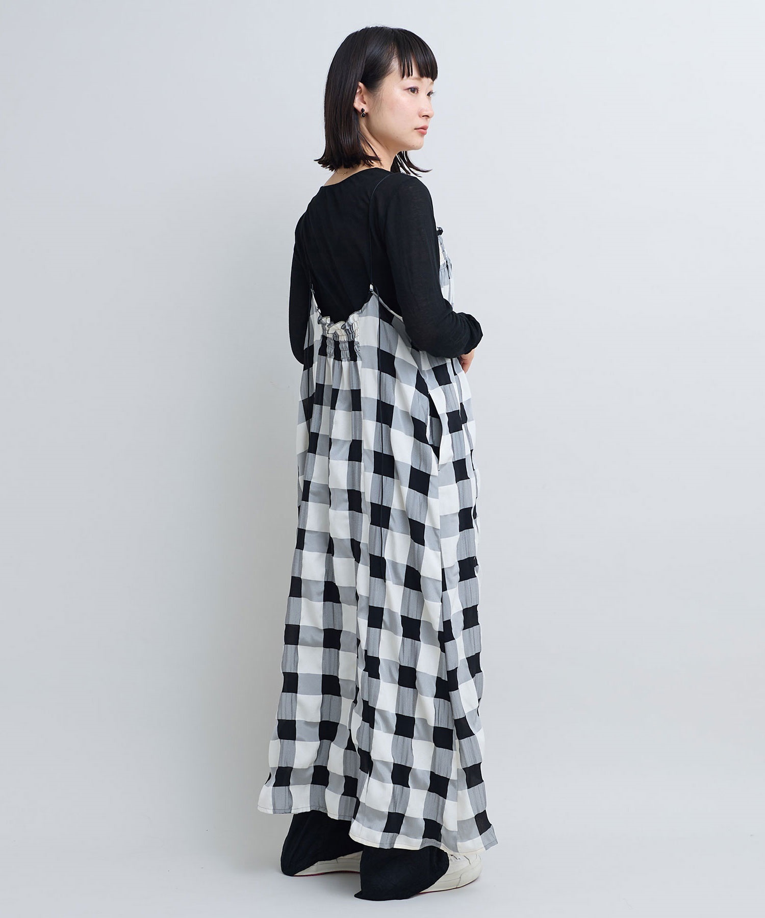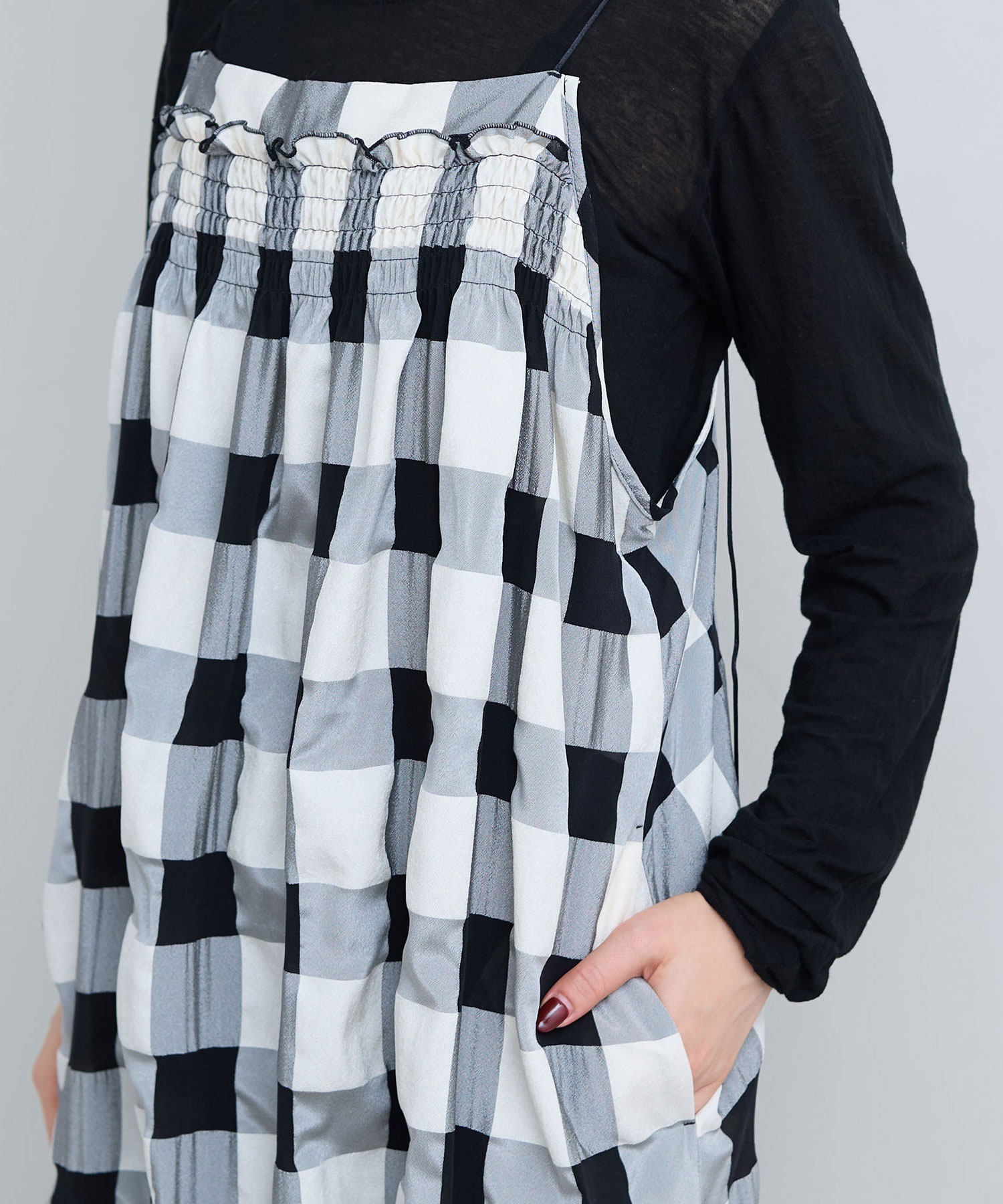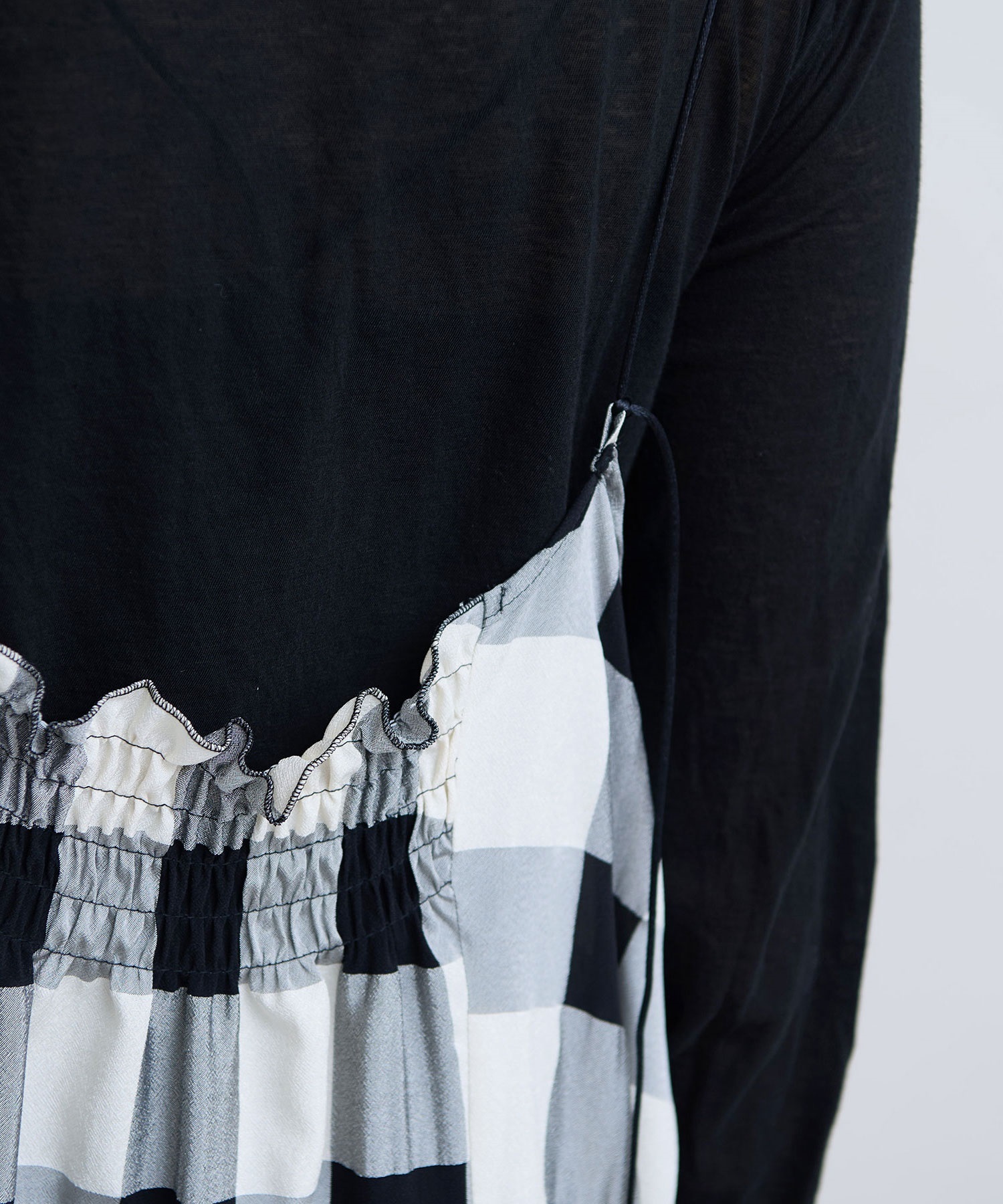 襟元に入れたシャーリングとボリューム感が印象的なワンピース。