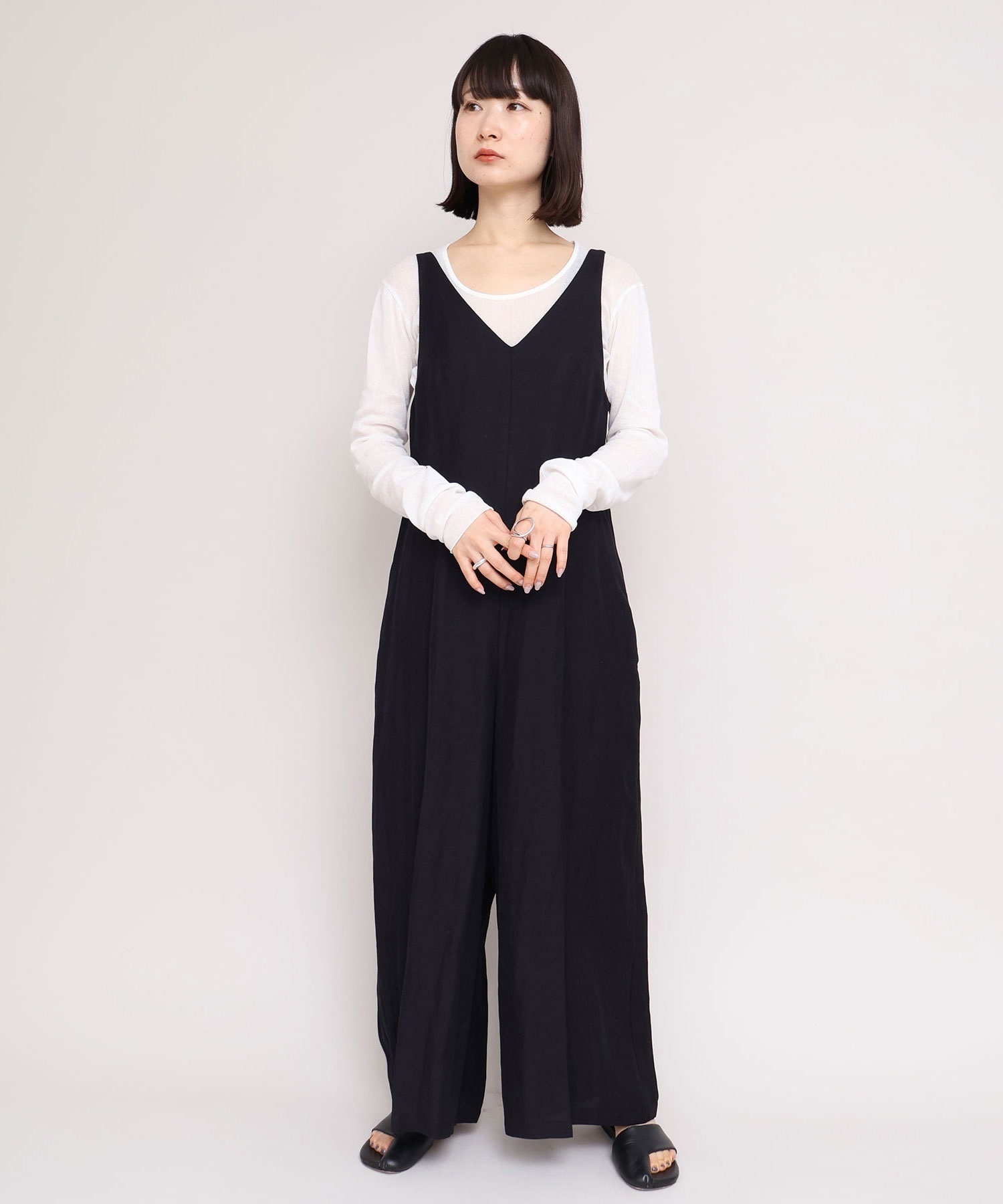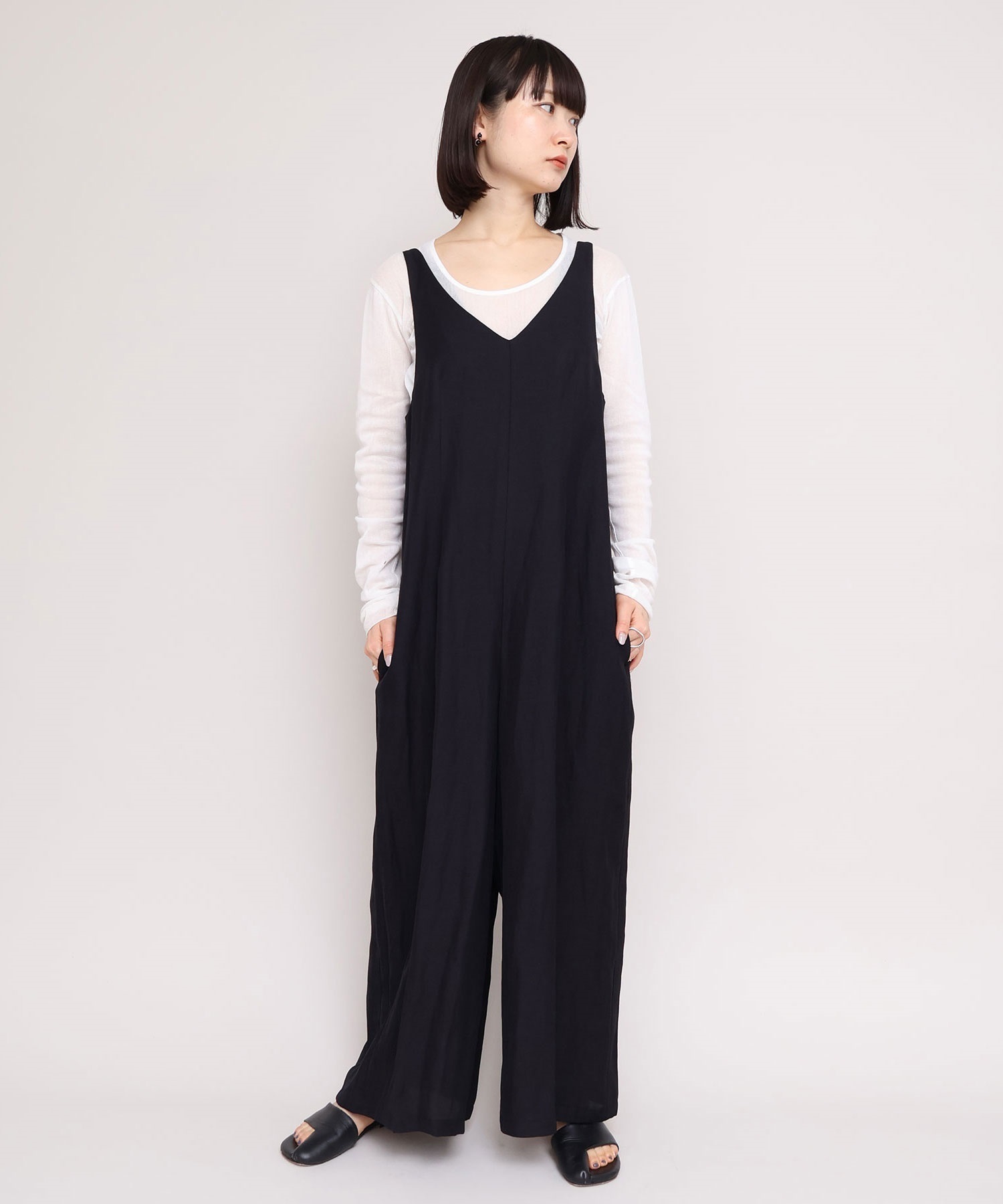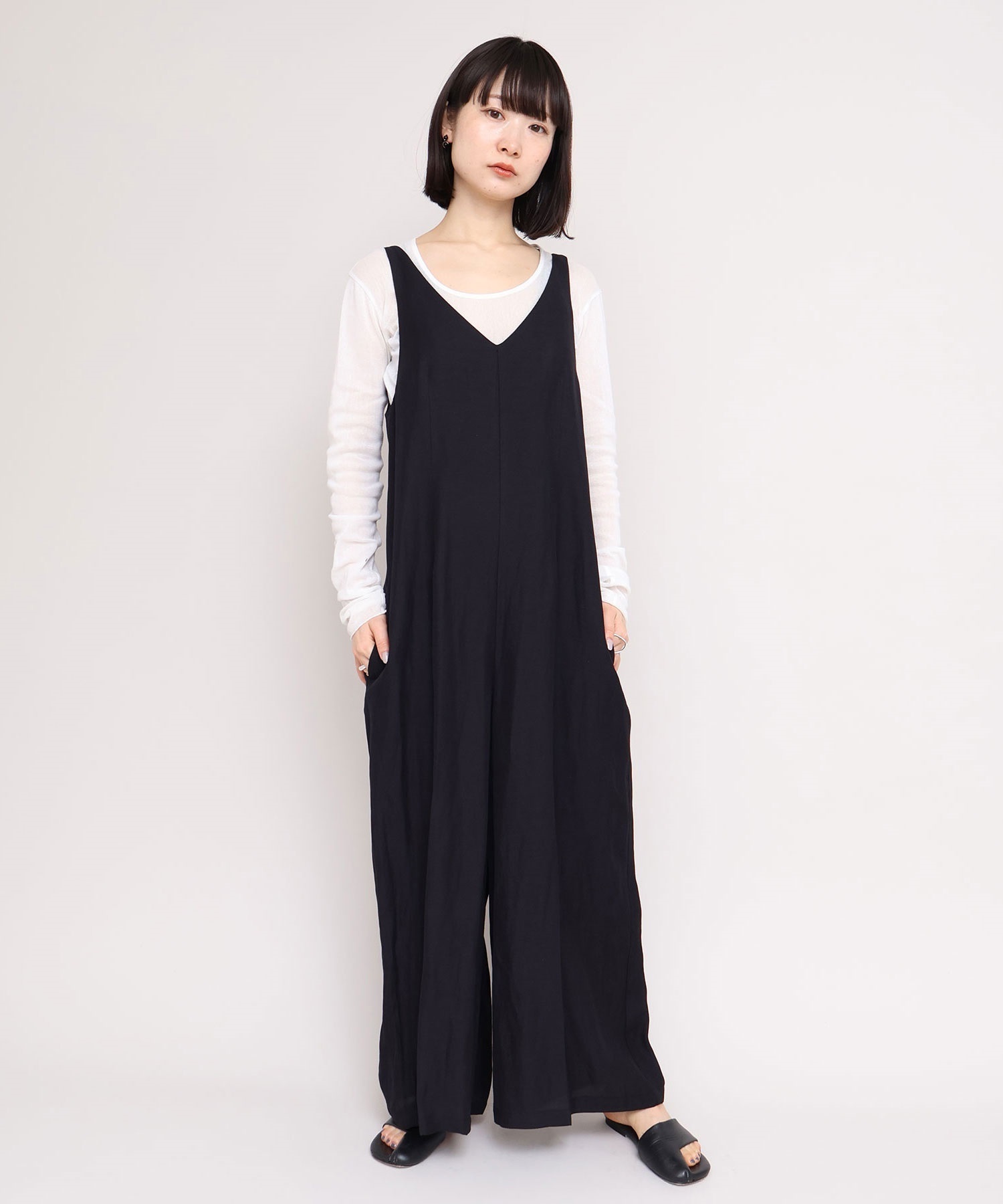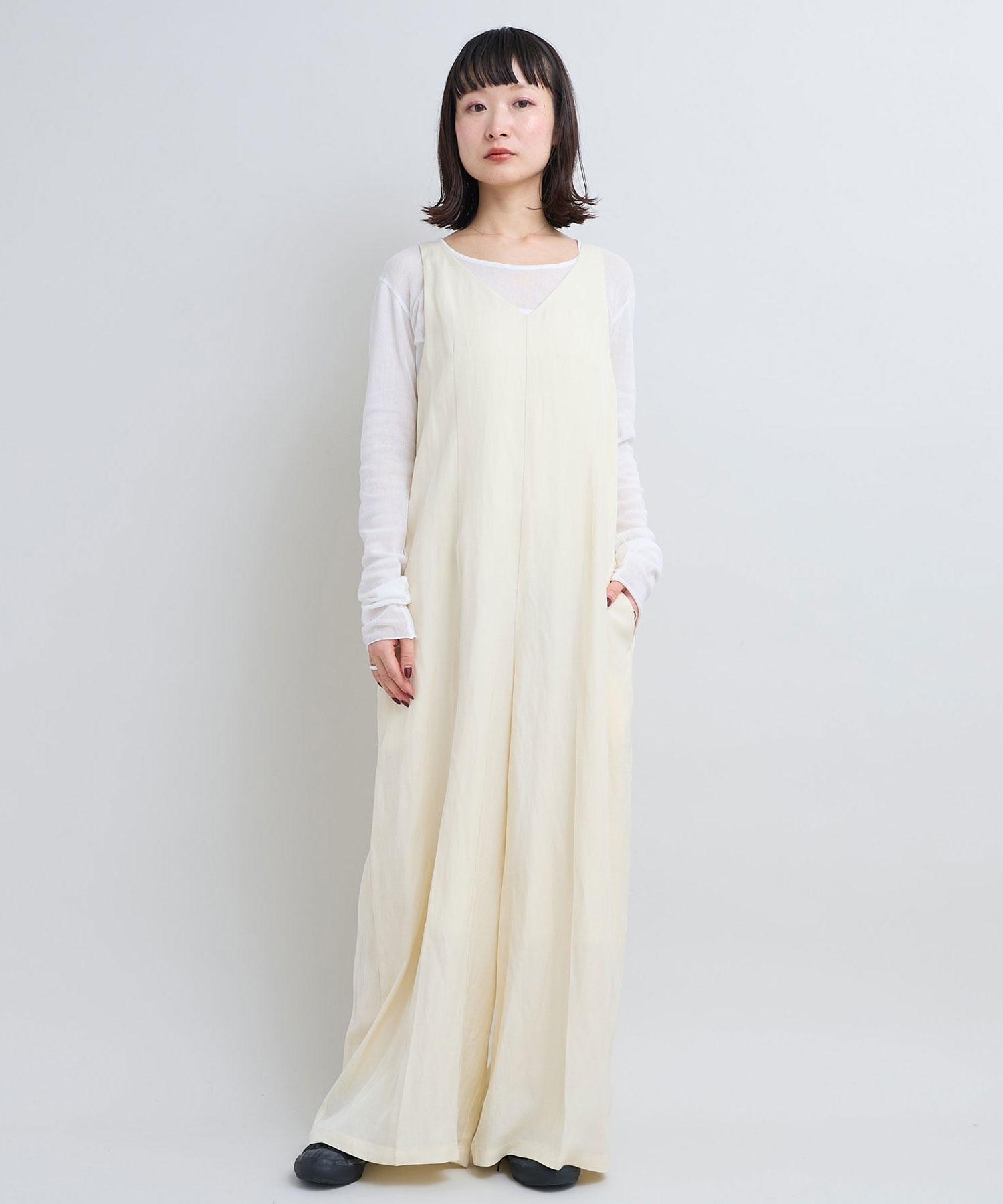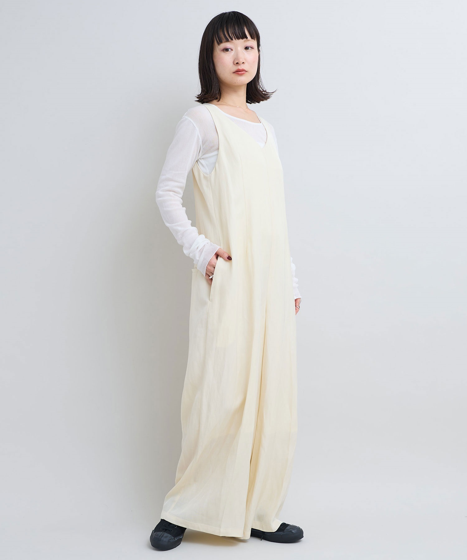 サロペットはVネックと細い肩線で女性らしさをプラス。