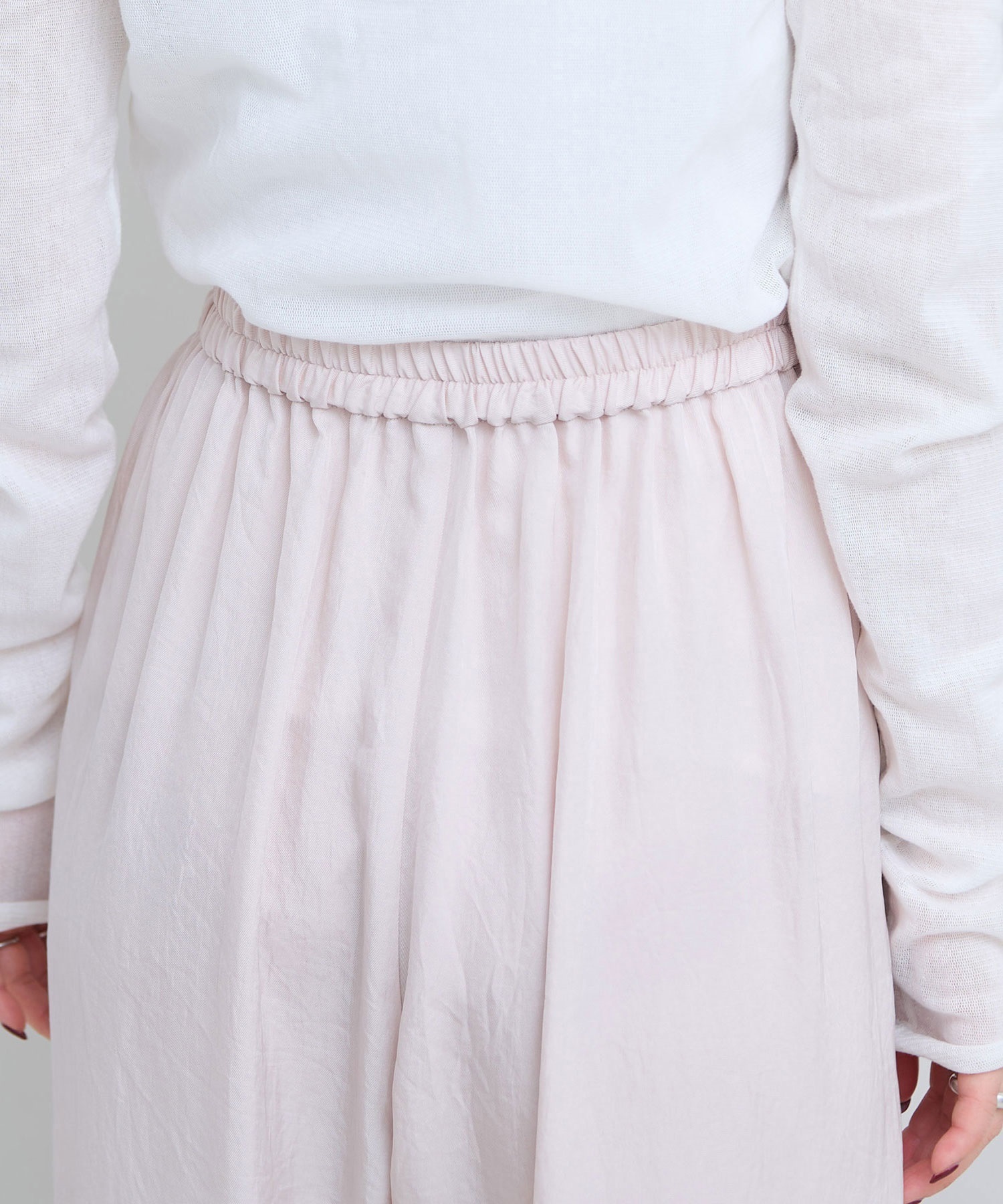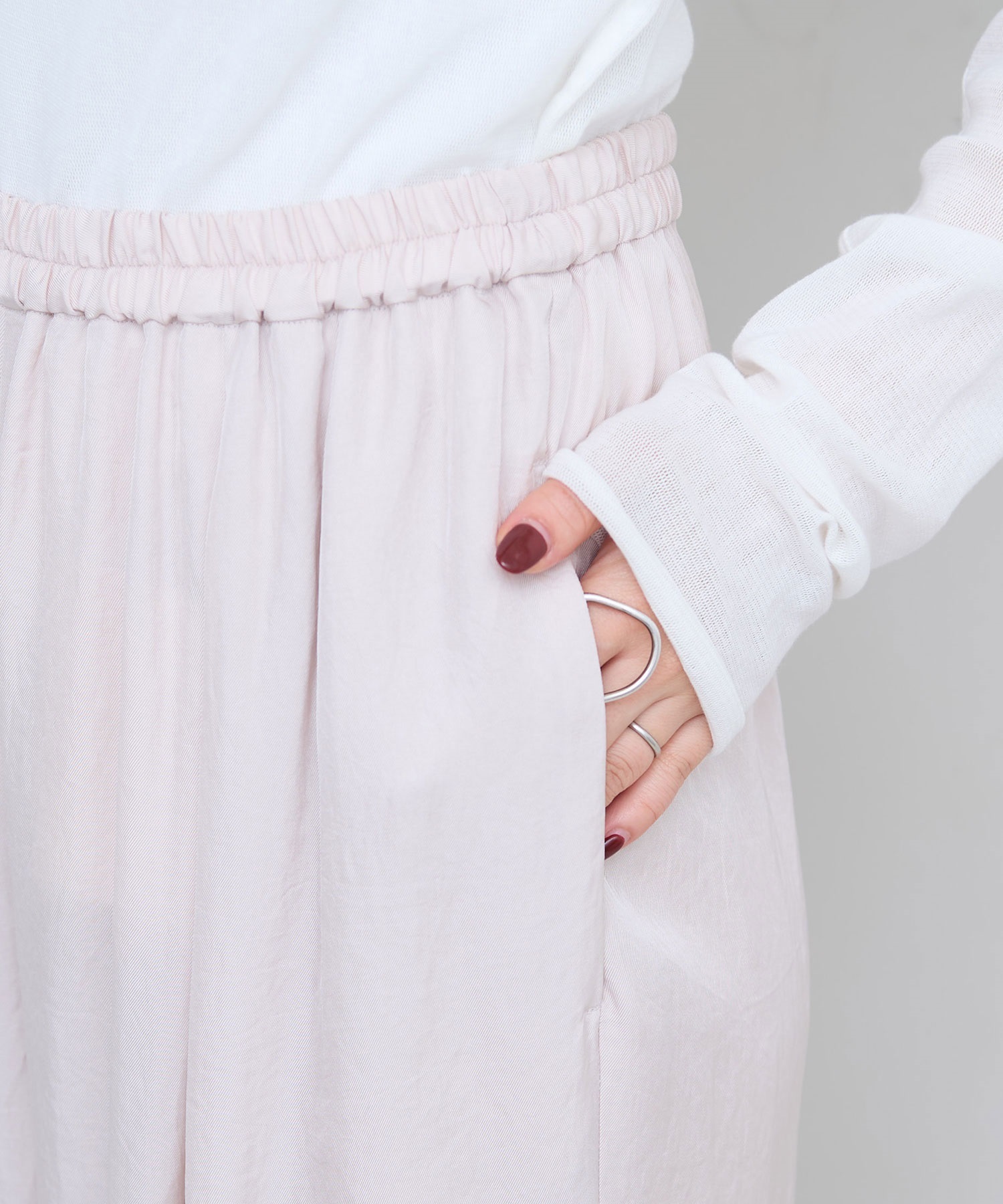 くすんだベージュに近い、絶妙なくすみピンクはポイントになりつつも優しい印象でコーディネートをまとめてくれるカラーです。