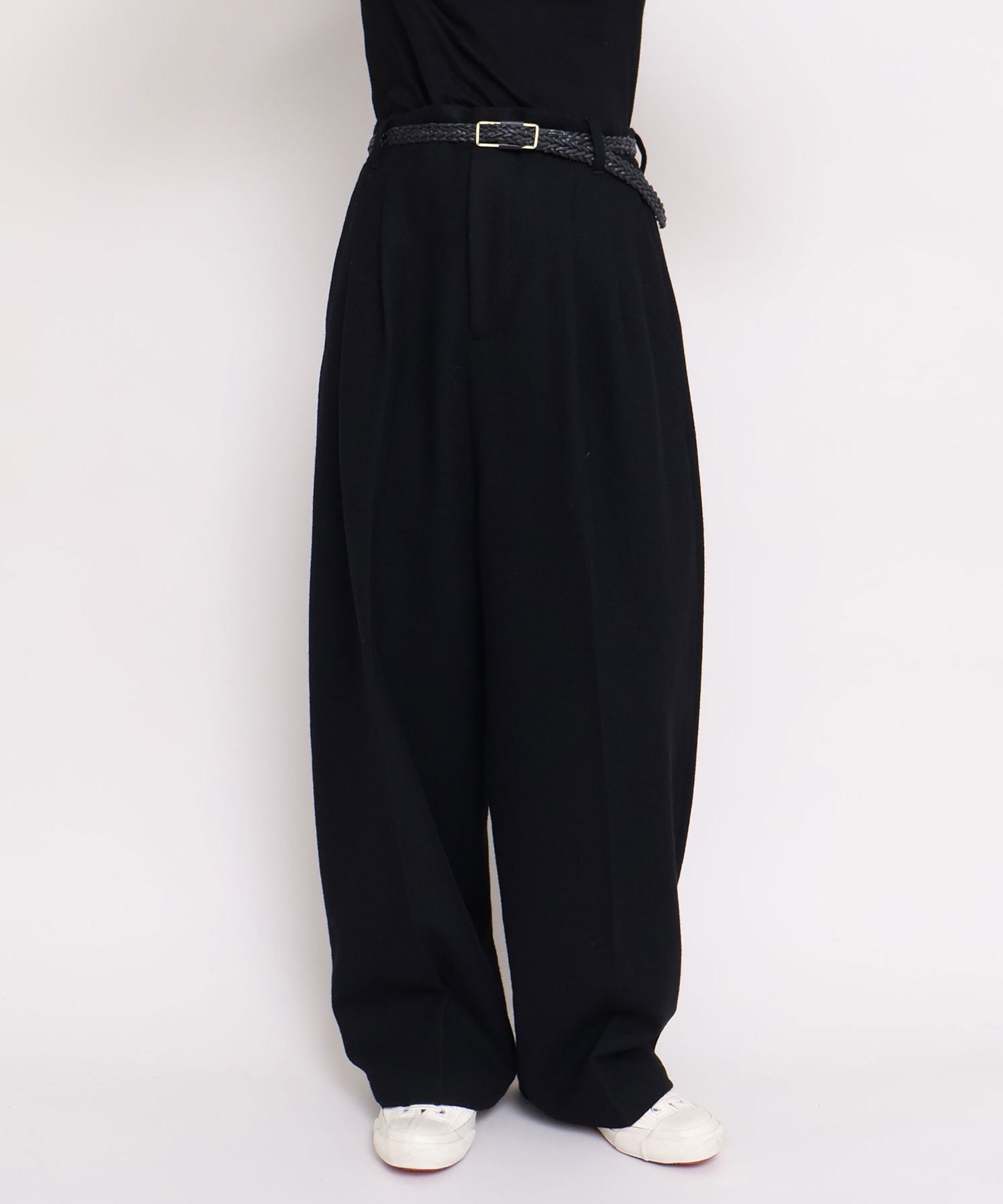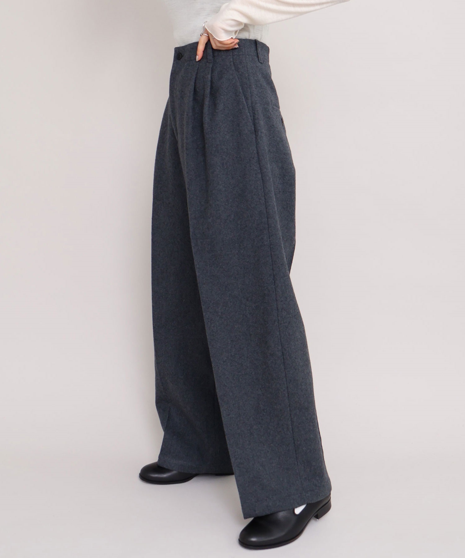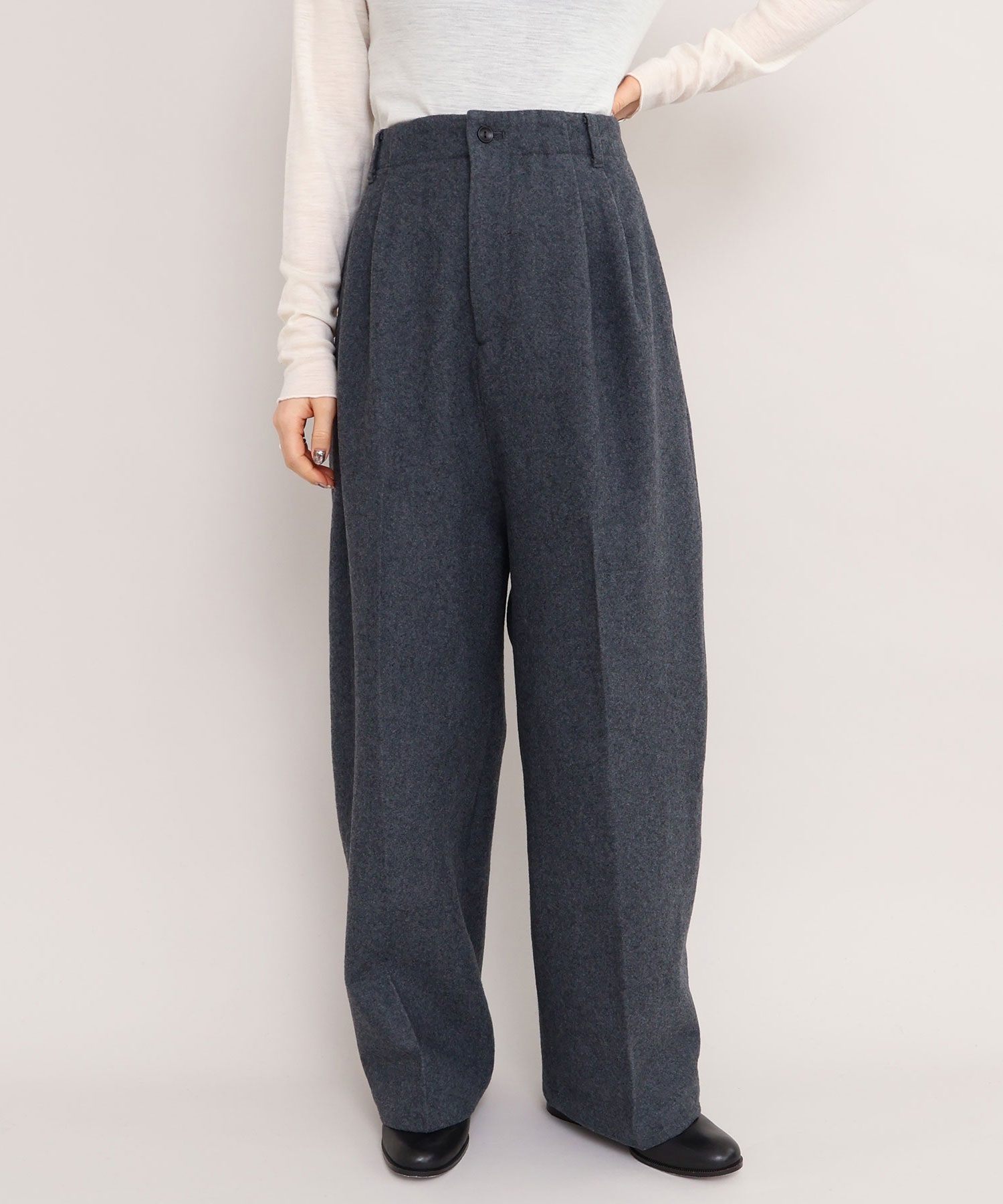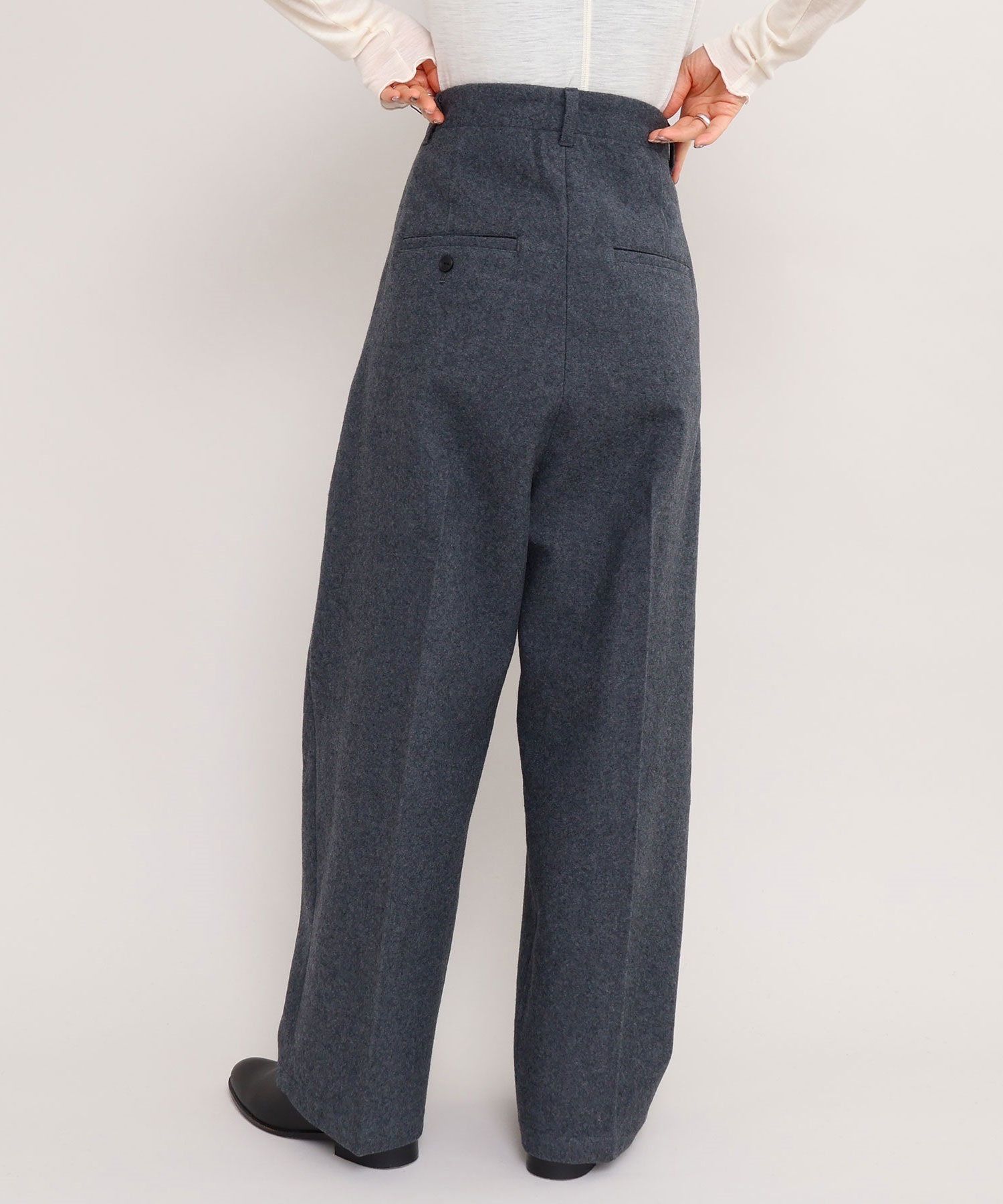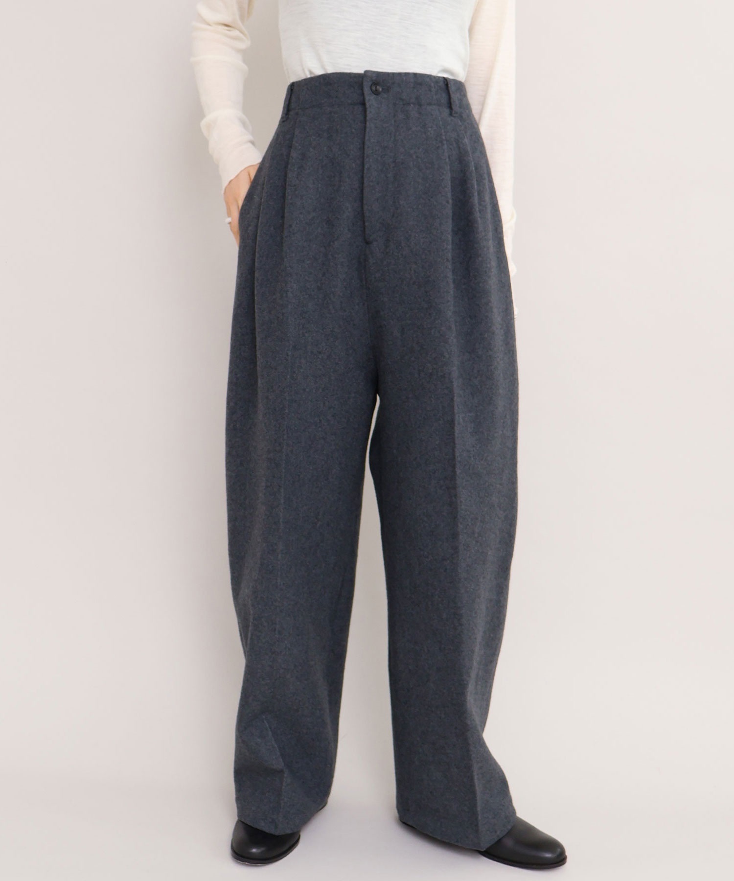 強縮をかけてぎゅっと縮絨させ、目を詰まらせることで表面感と肉厚感が加わったウール素材を使用した2タックテーパードパンツ。
