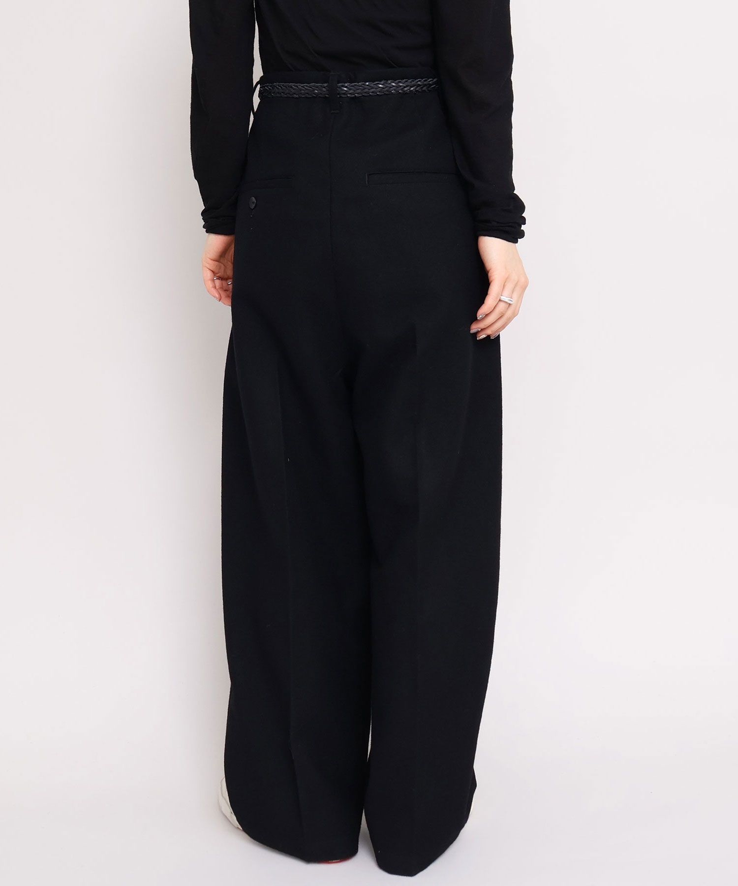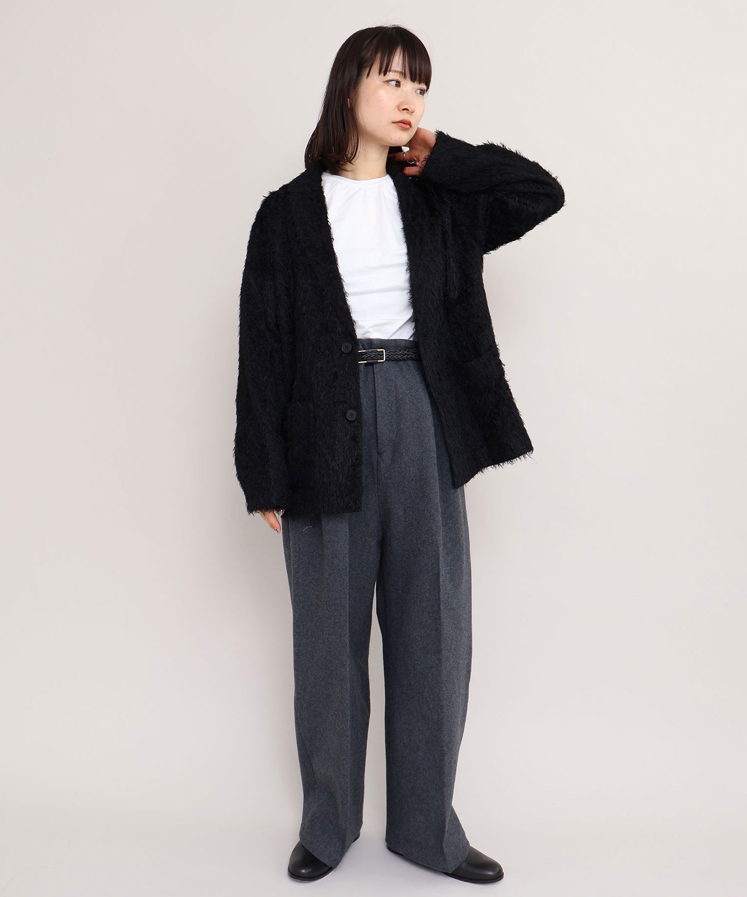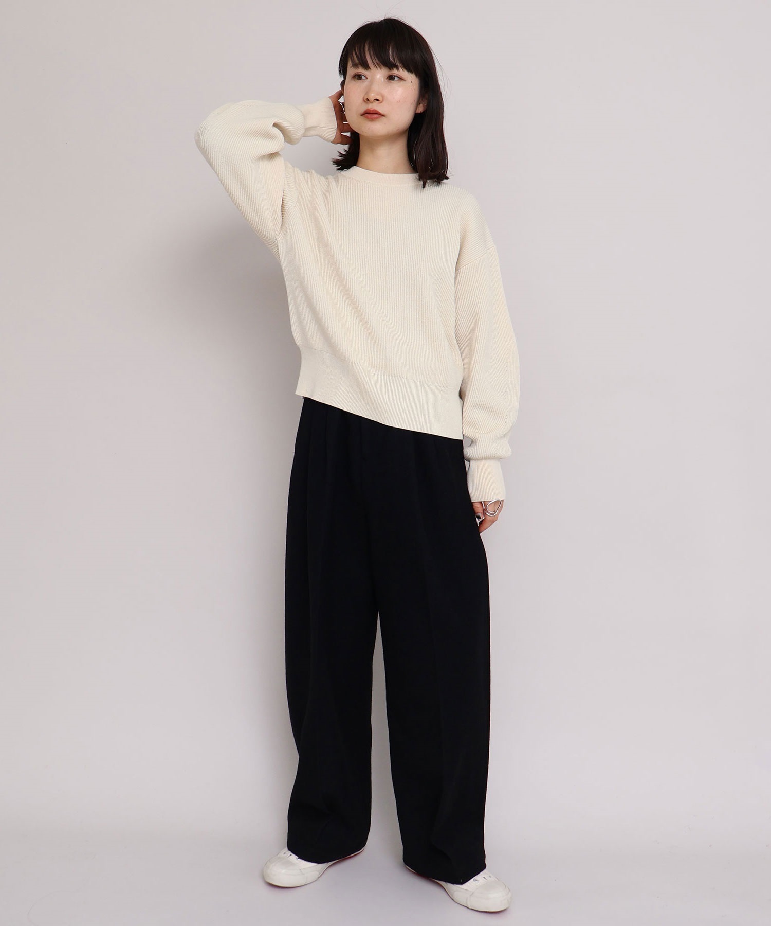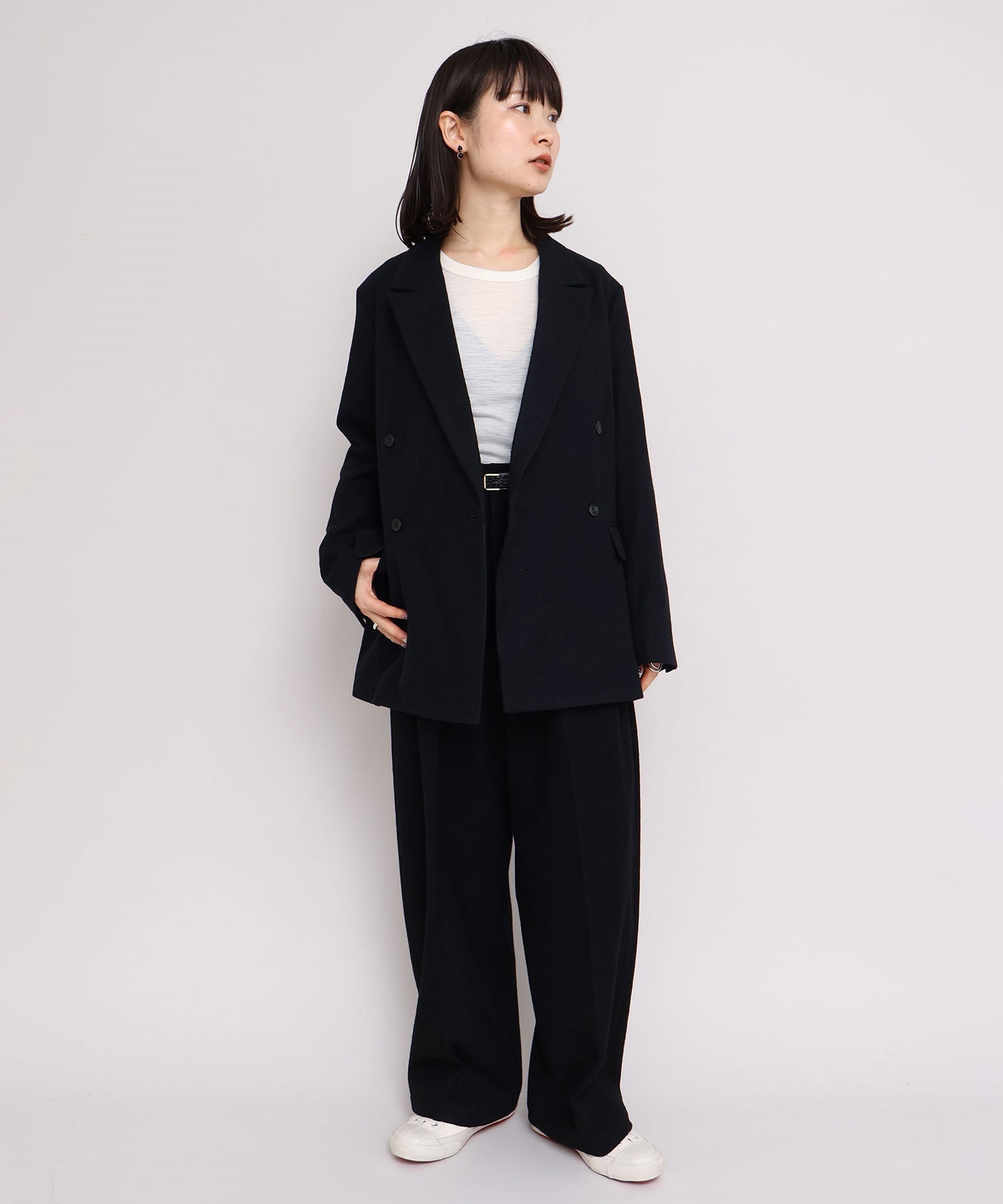 パンツはワイドですがややテーパードにし、すっきりと着れるシルエットに。