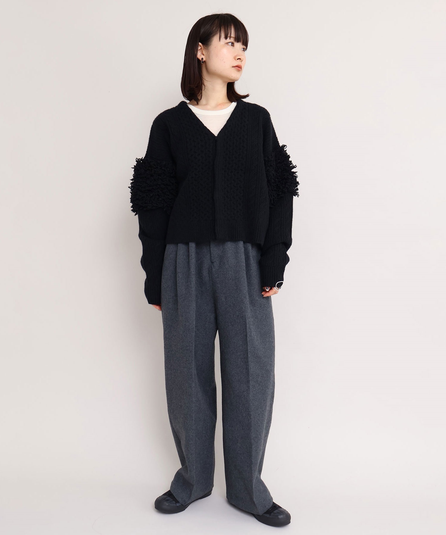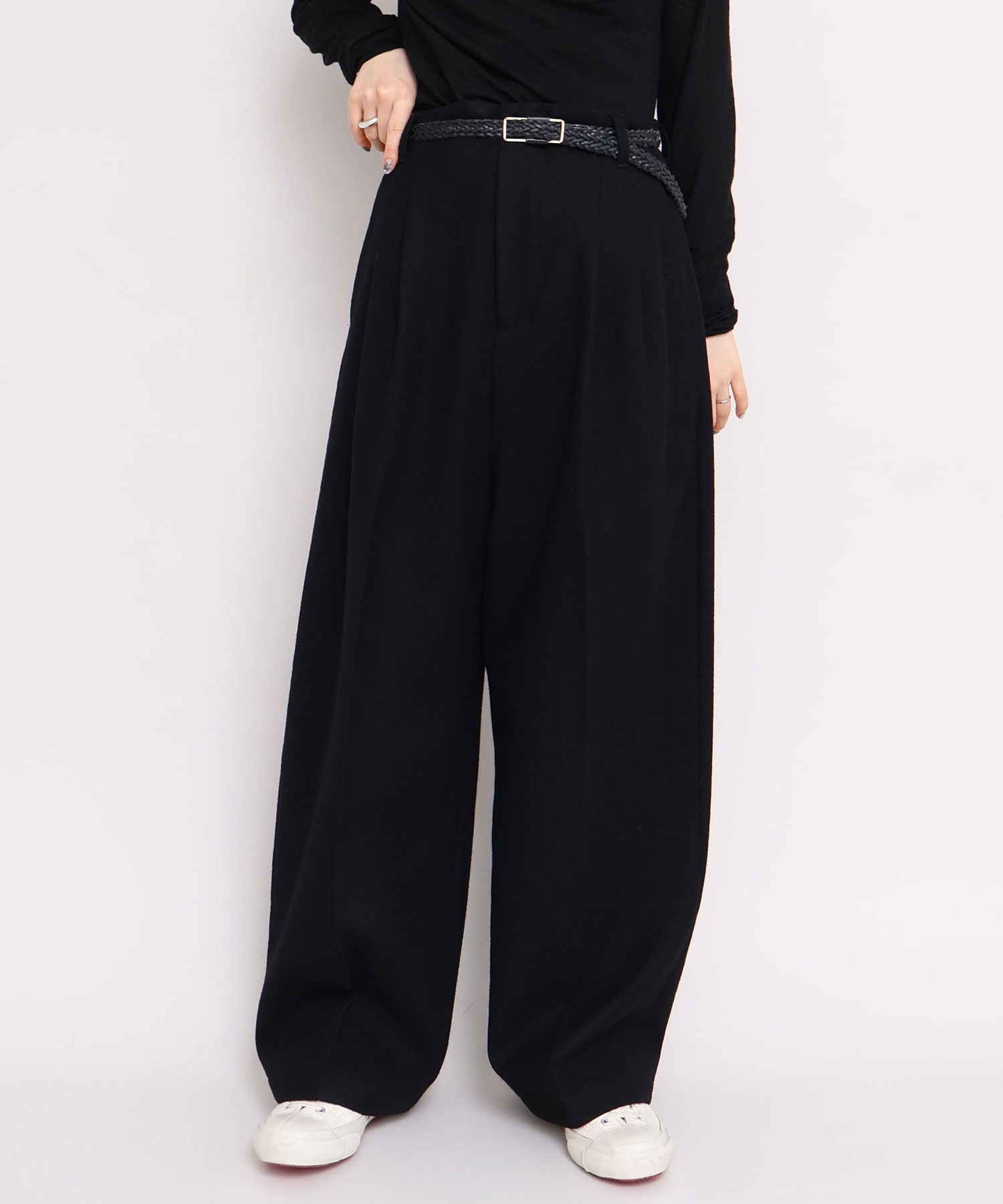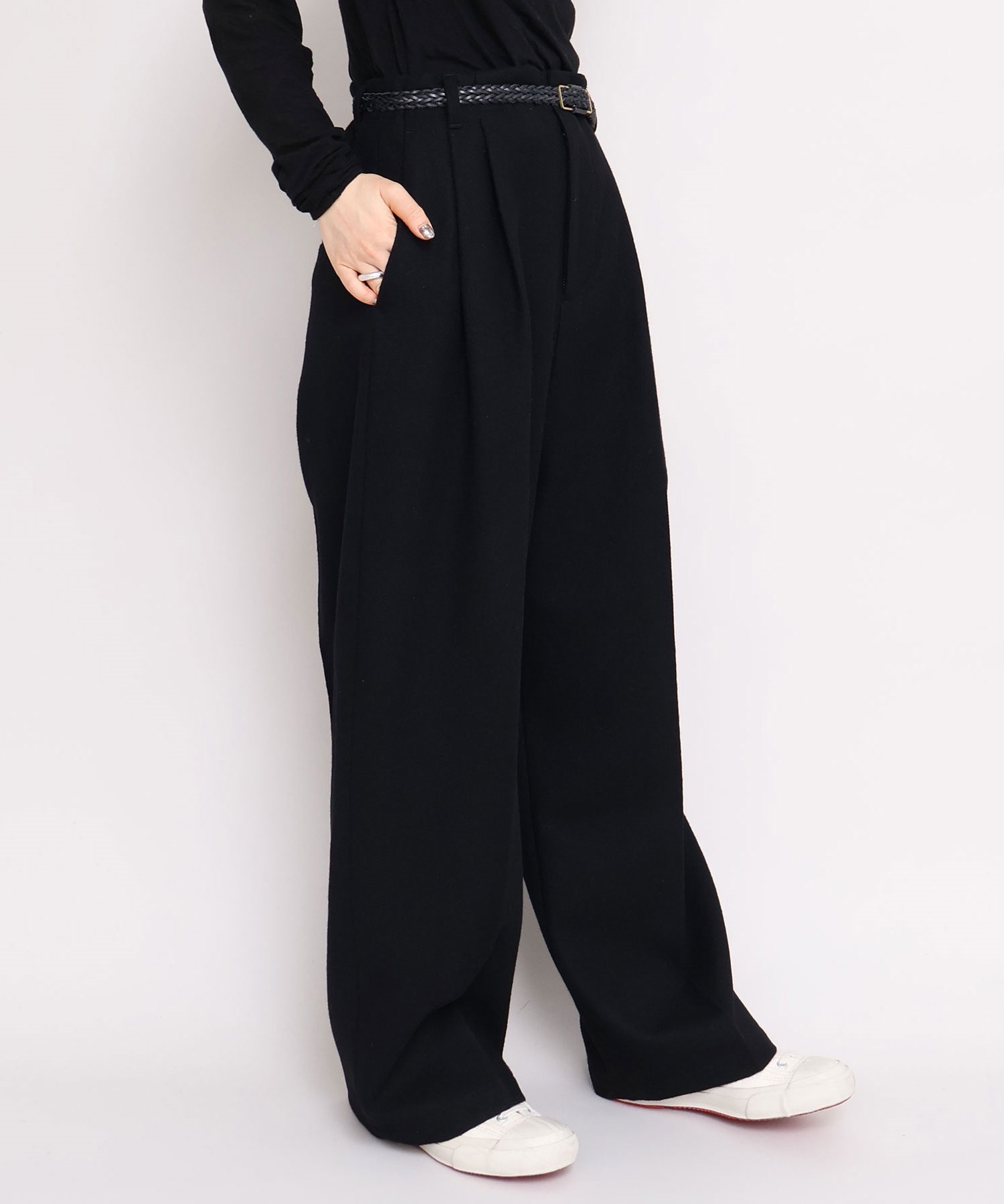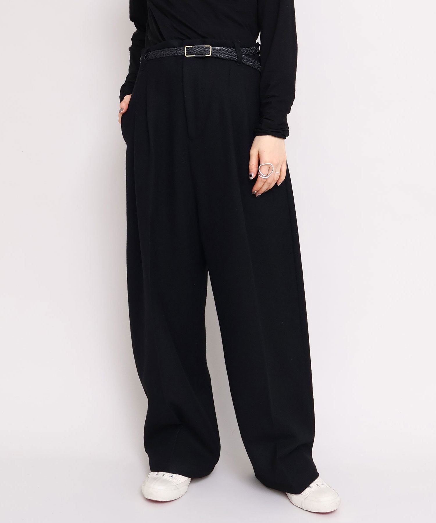 パンツはワイドですがややテーパードにし、すっきりと着れるシルエットに。
