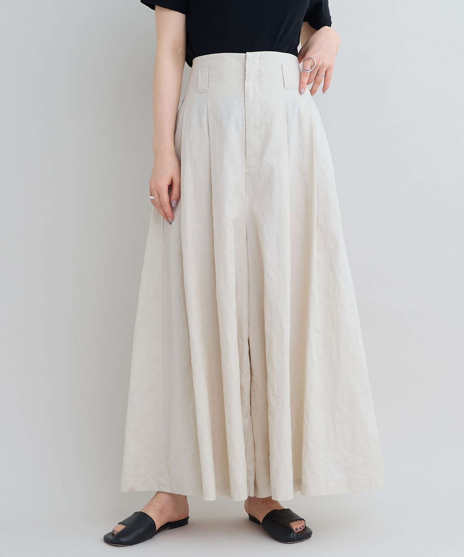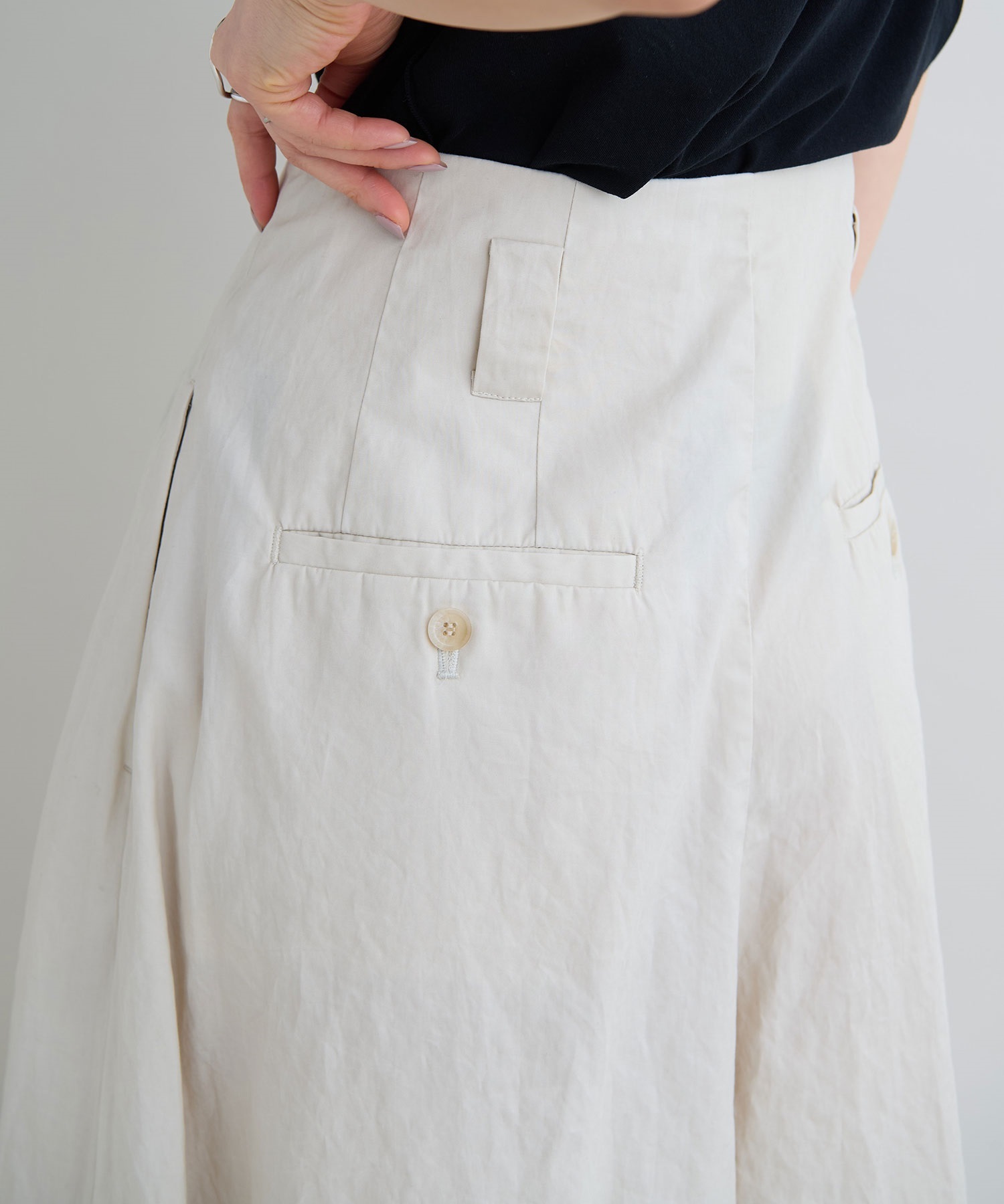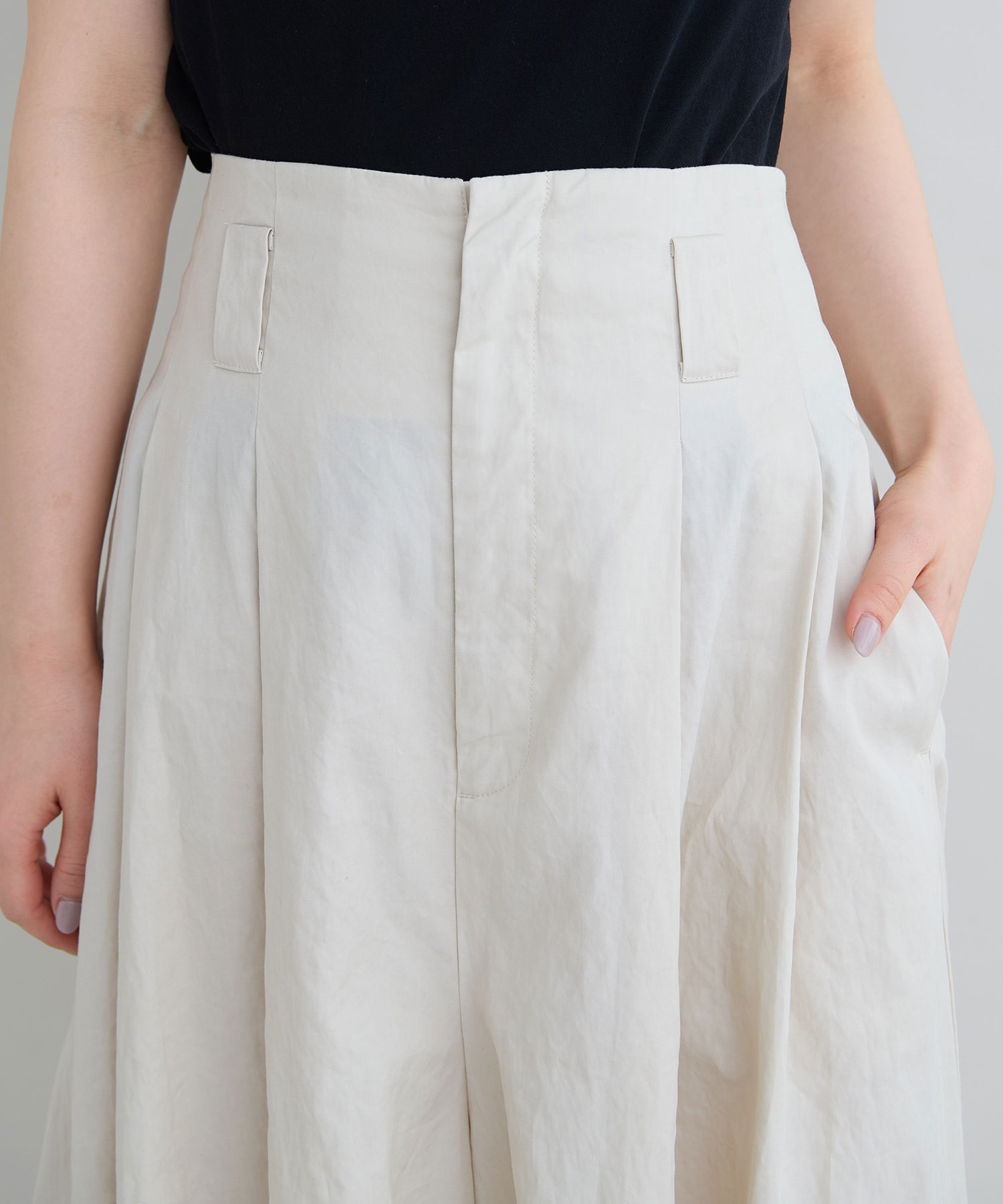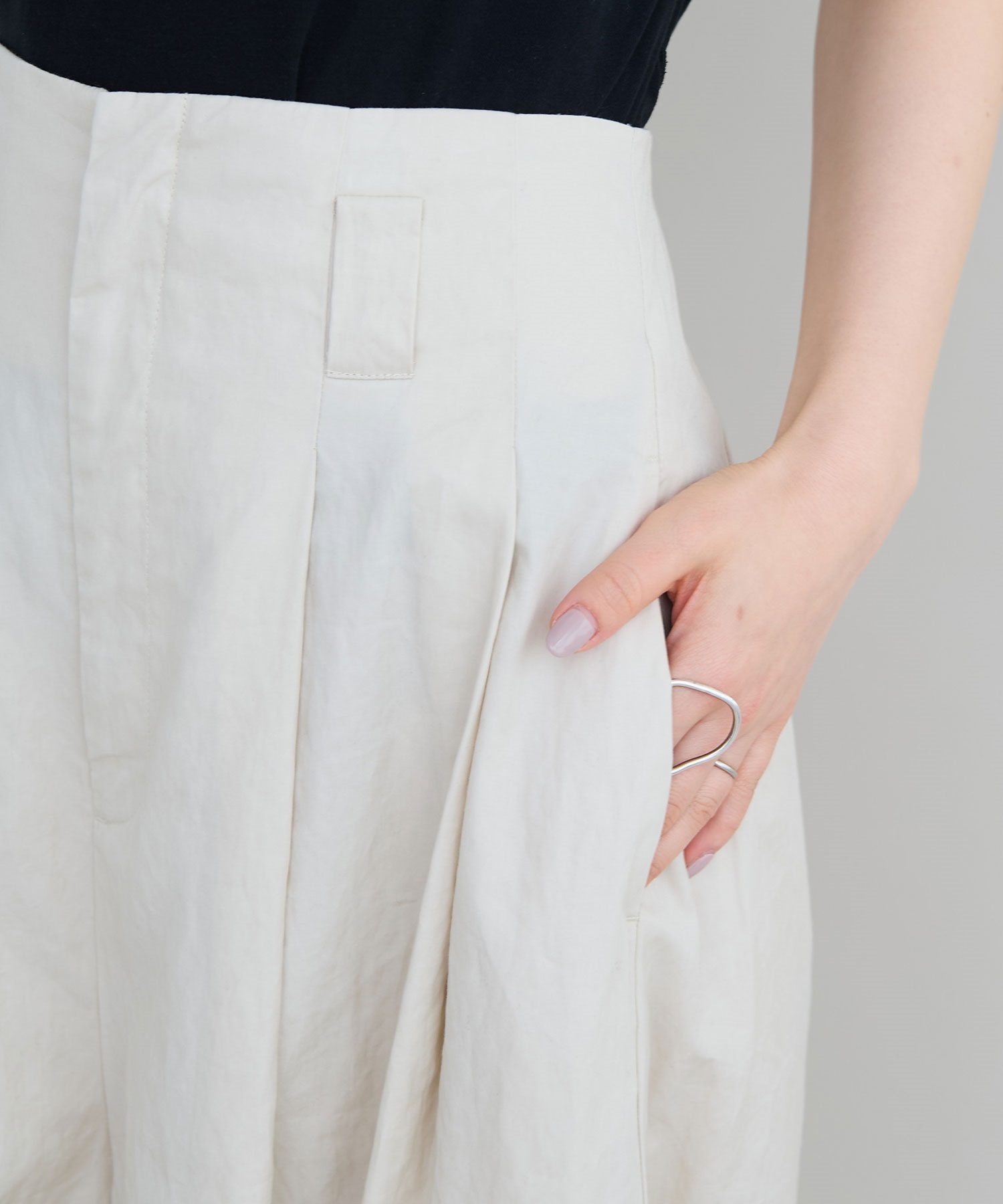 スカートのように見えするほどたっぷりのボリュームを入れつつ、ウエスト周りはハイウエストでスタイルアップするシルエットに。