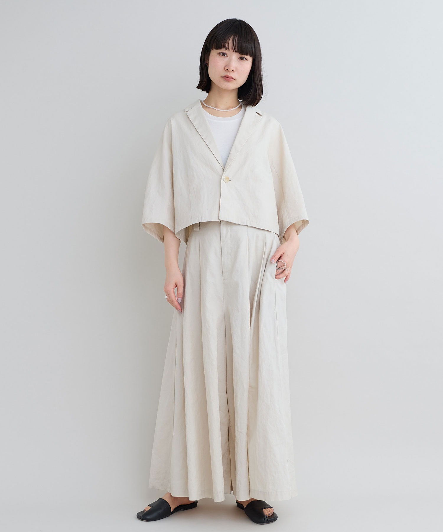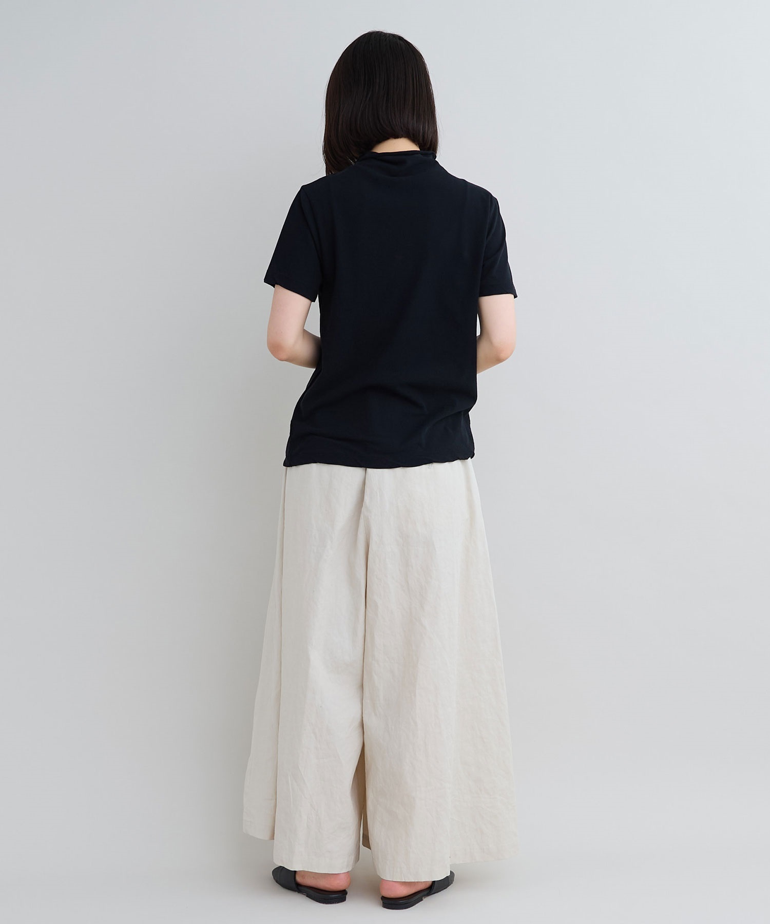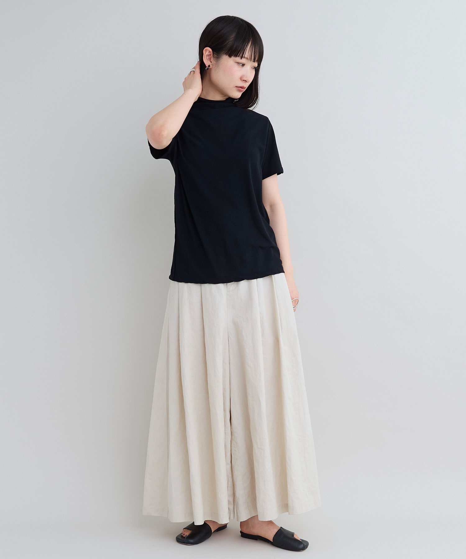 素材の軽さとハリを生かした9分丈ワイドキュロットパンツ。