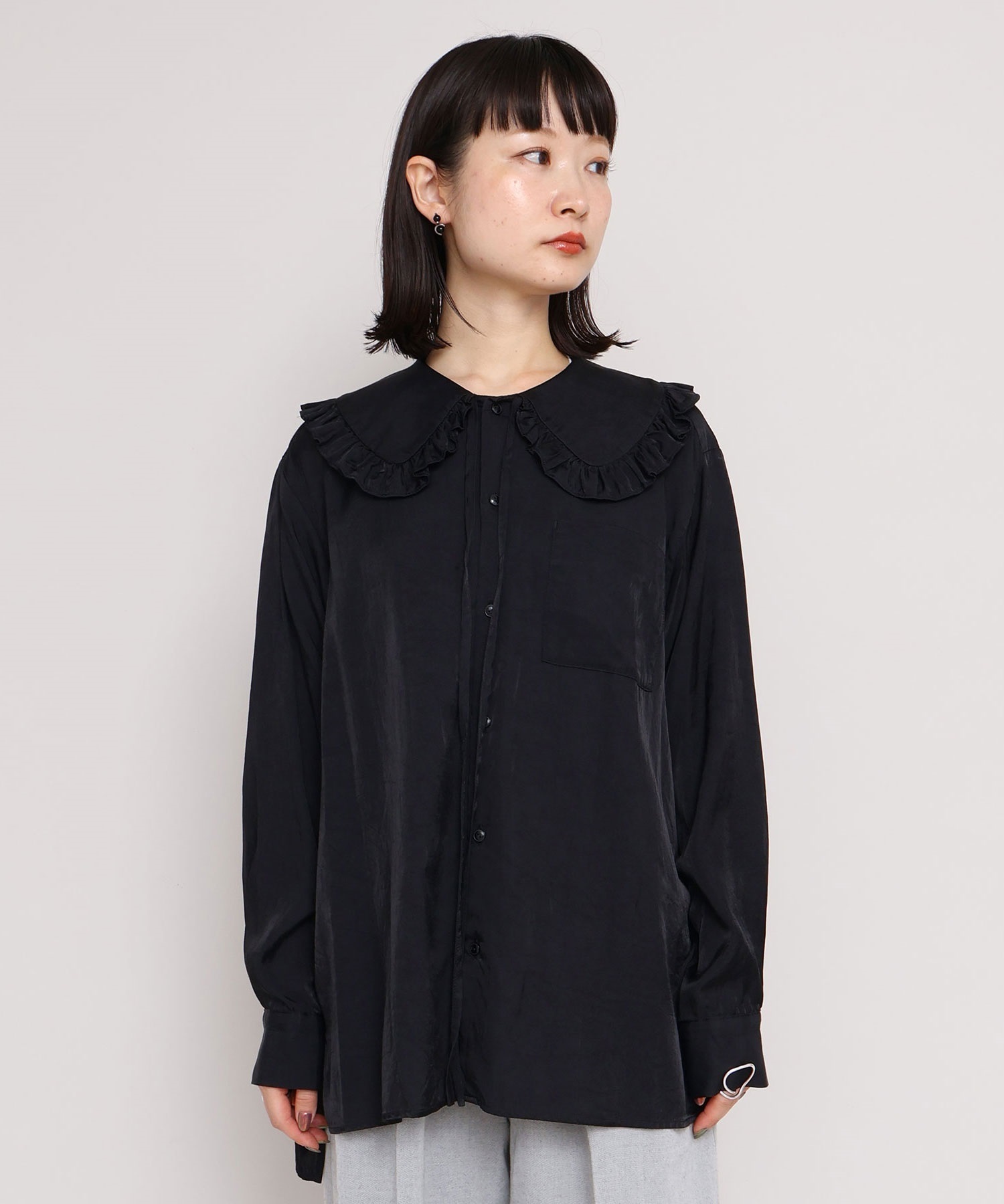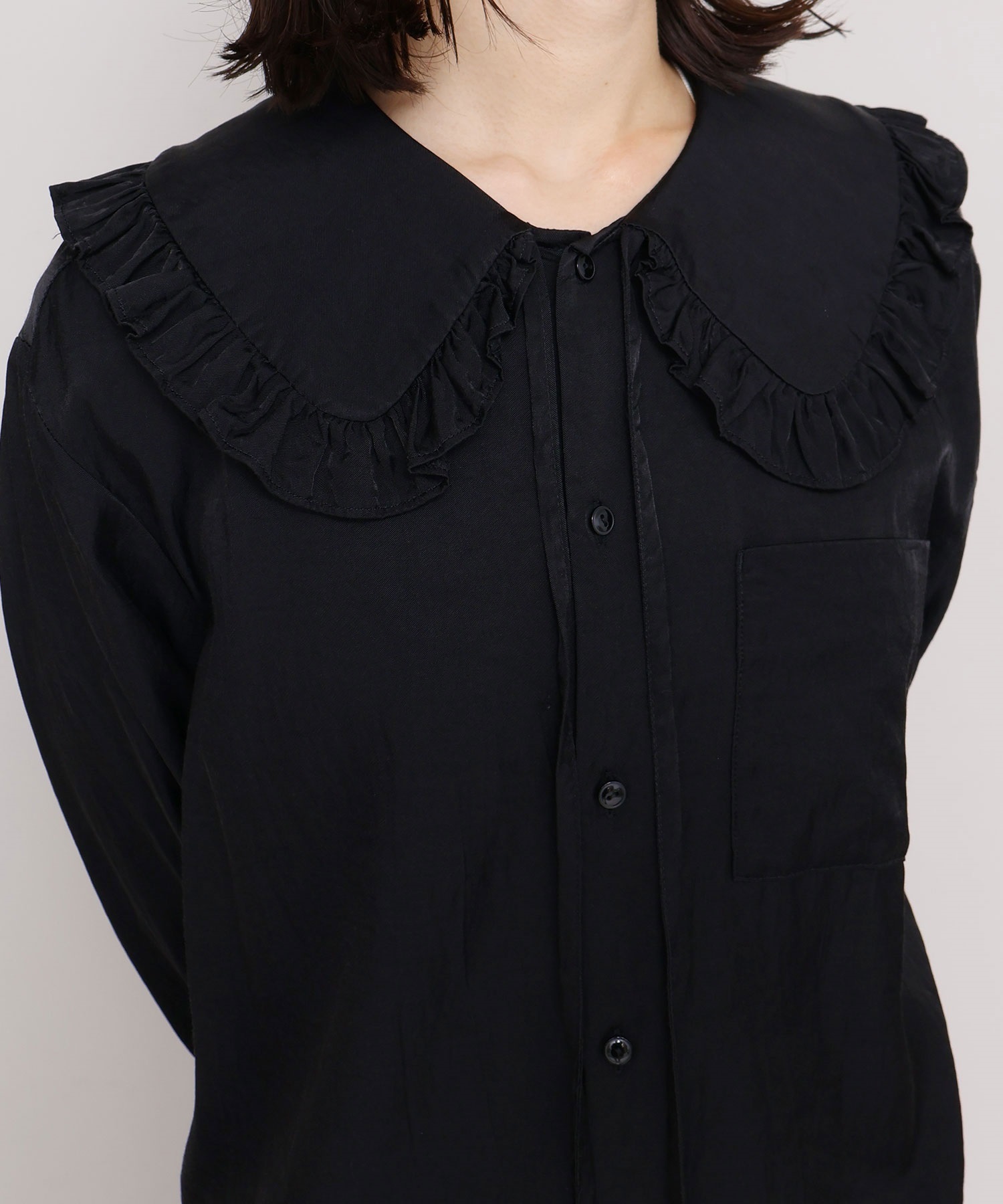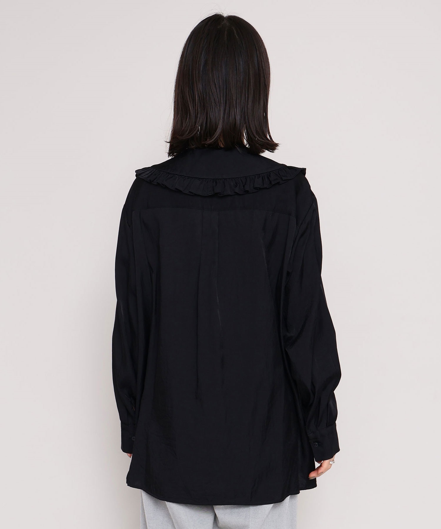 柔らかな光沢感のサテン生地を使用したフリルカラーブラウス。