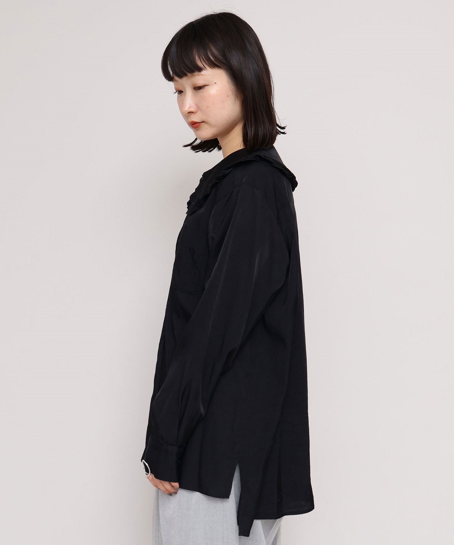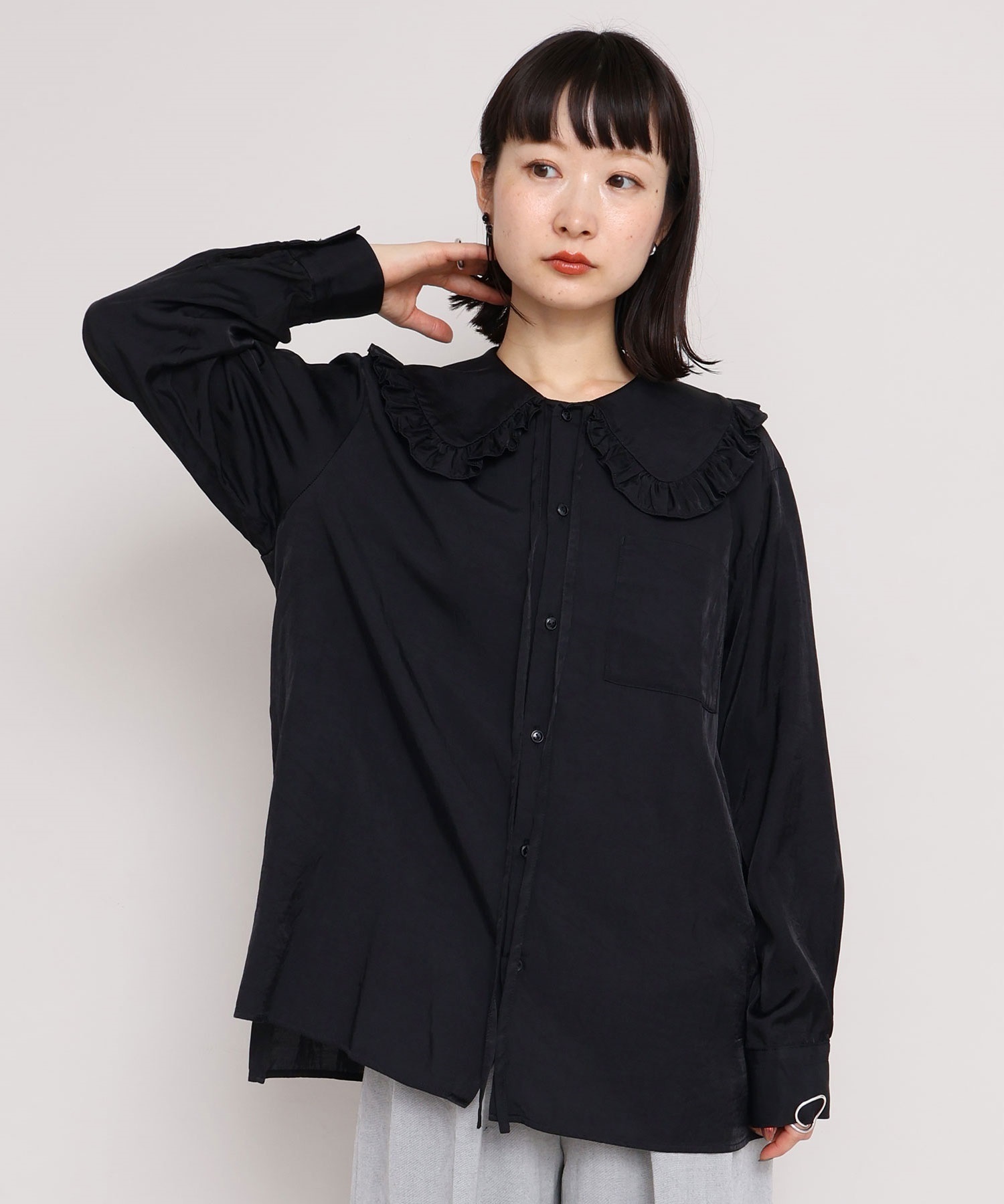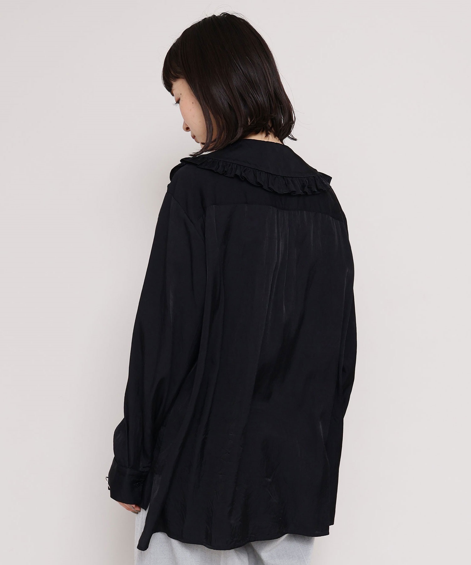 柔らかな光沢感のサテン生地を使用したフリルカラーブラウス。