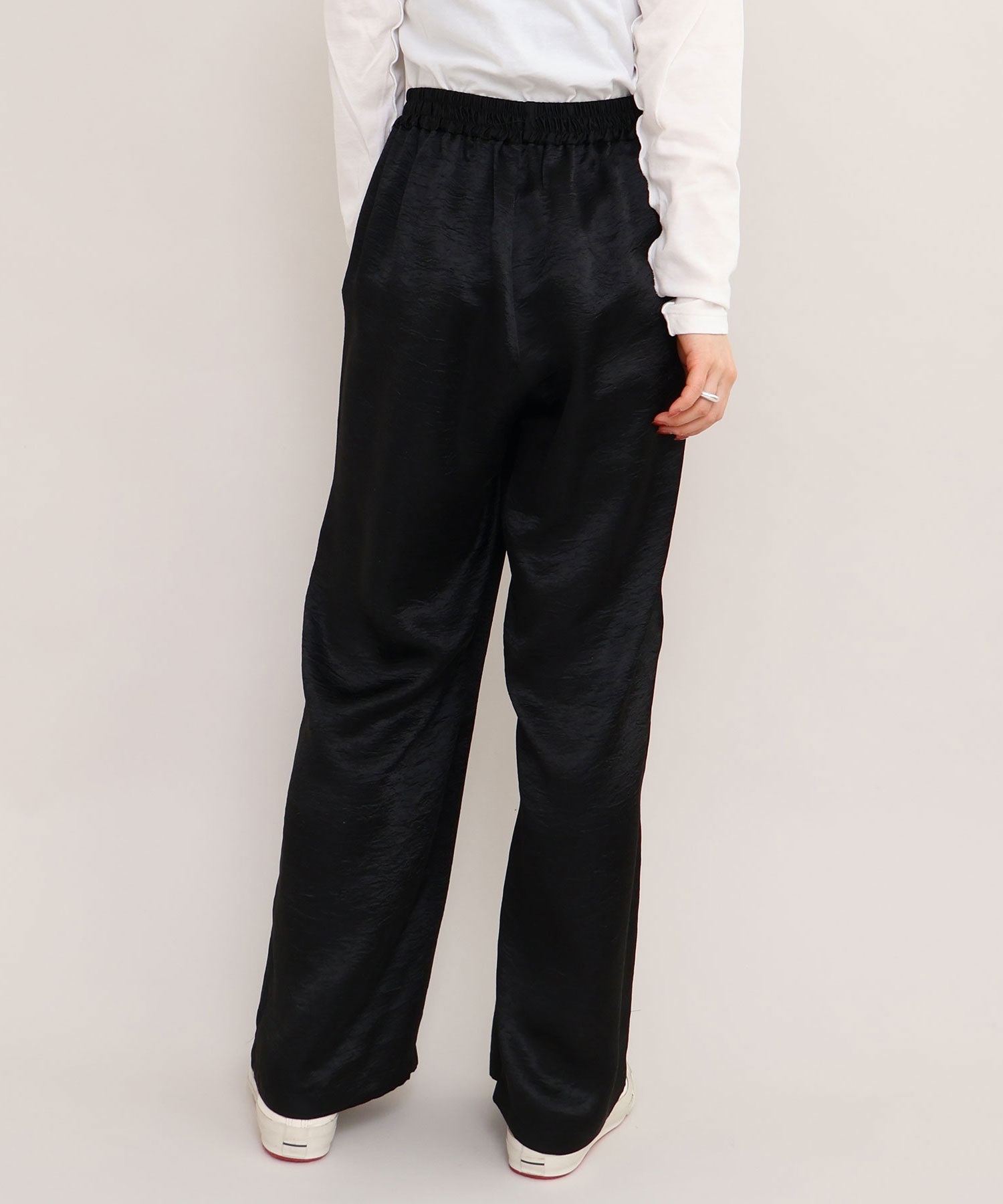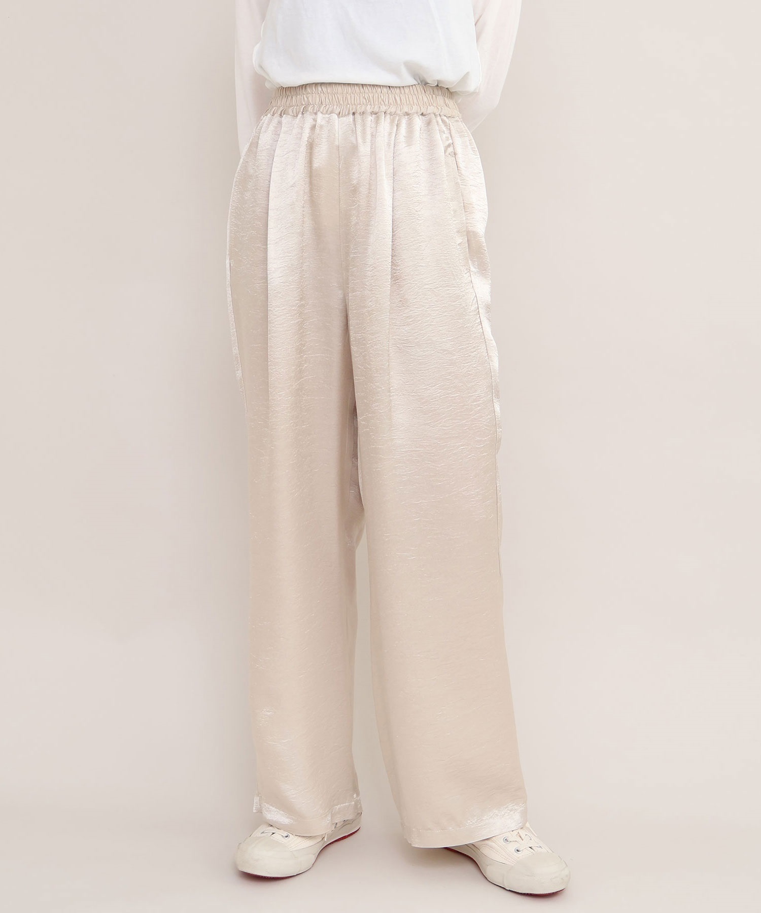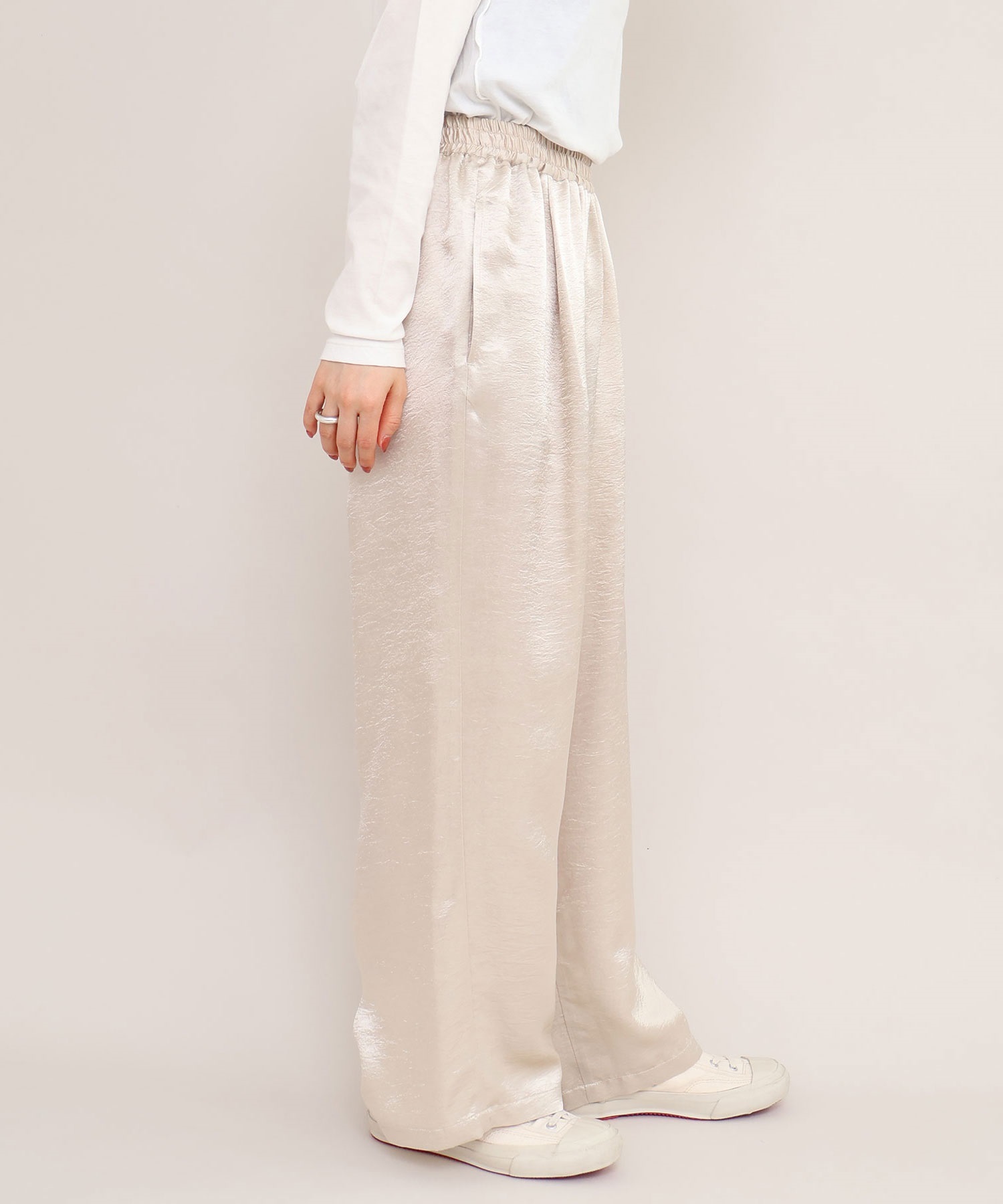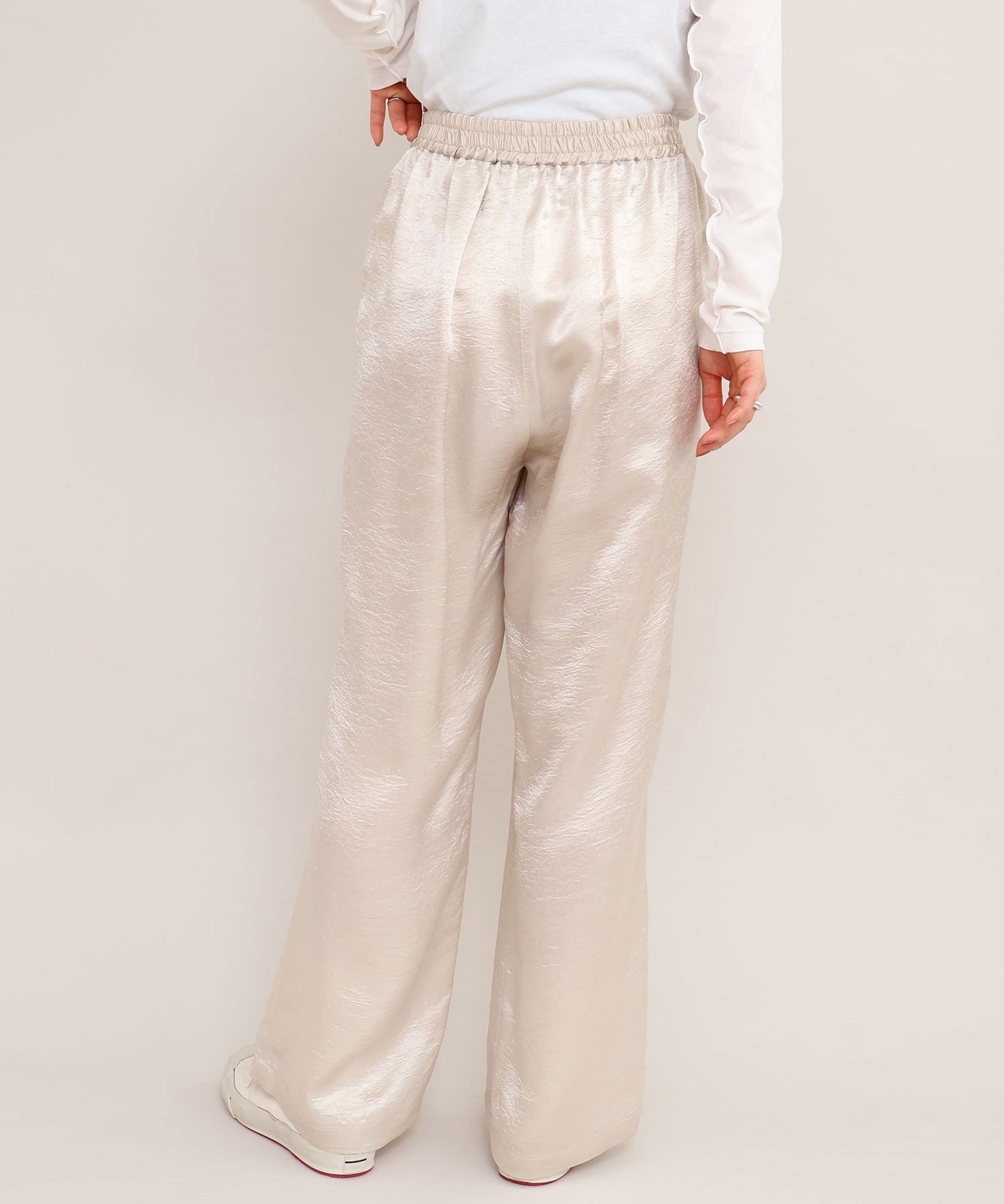 イージーにはけるサテンパンツはアセテート100%の生地を使用。