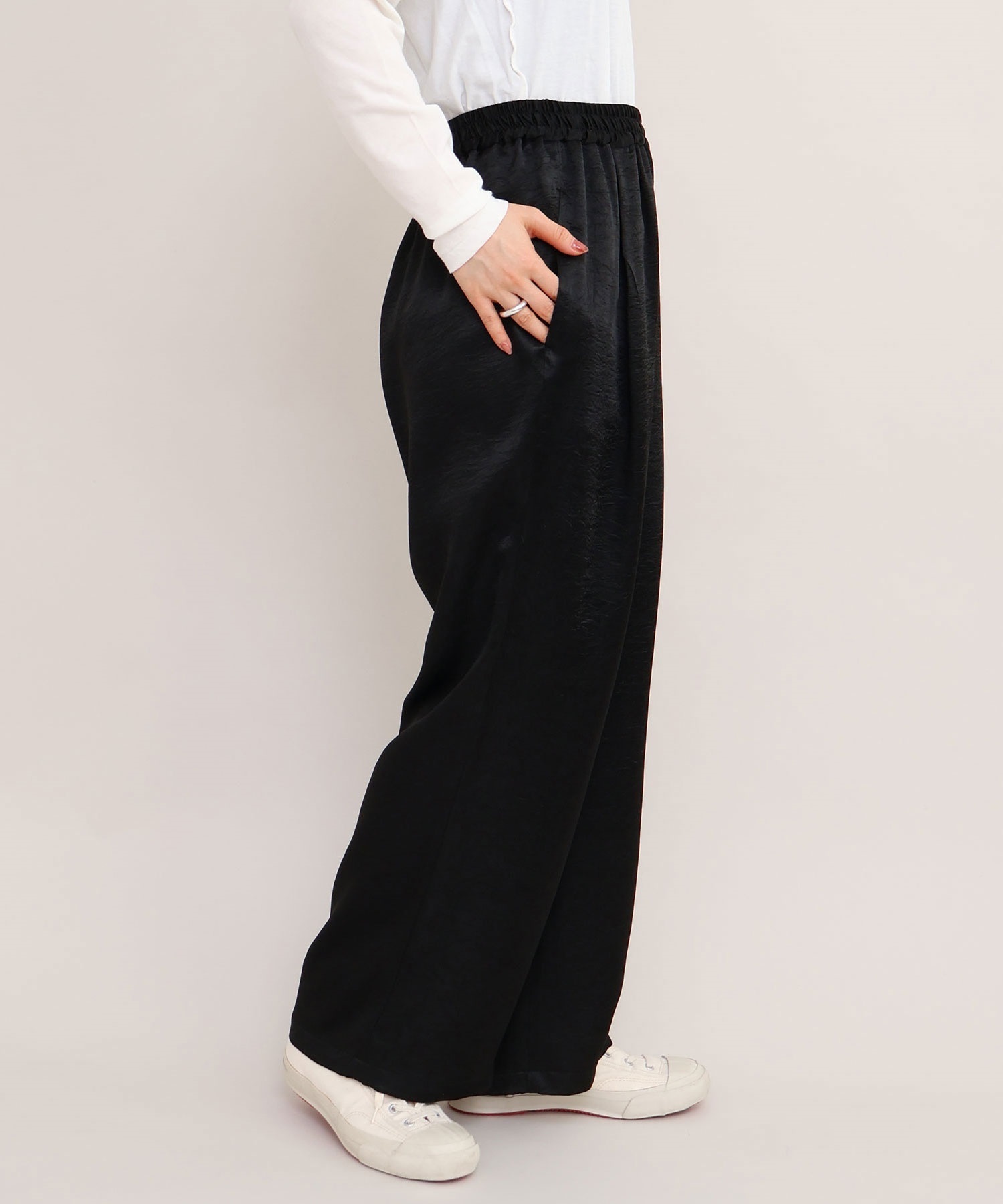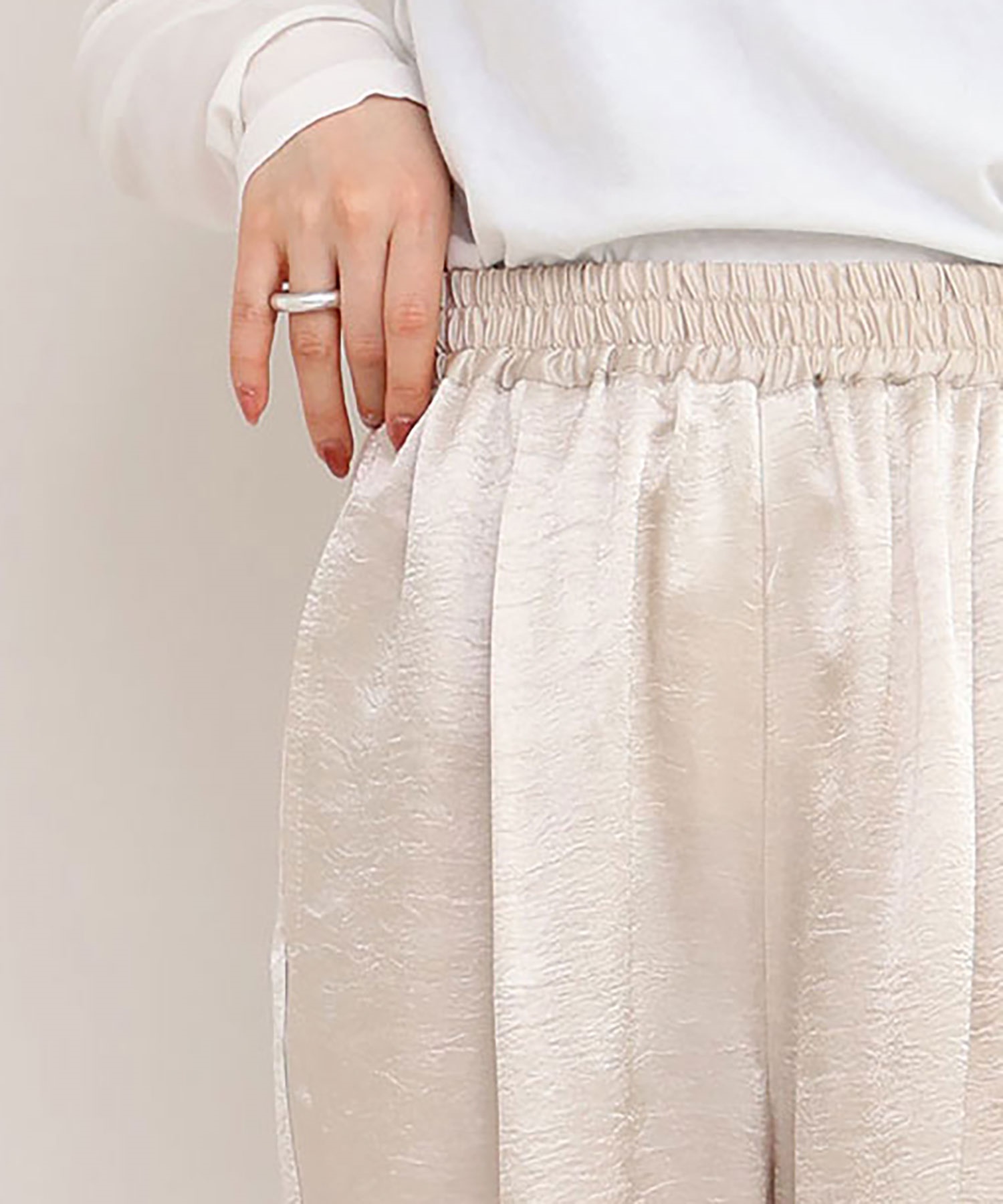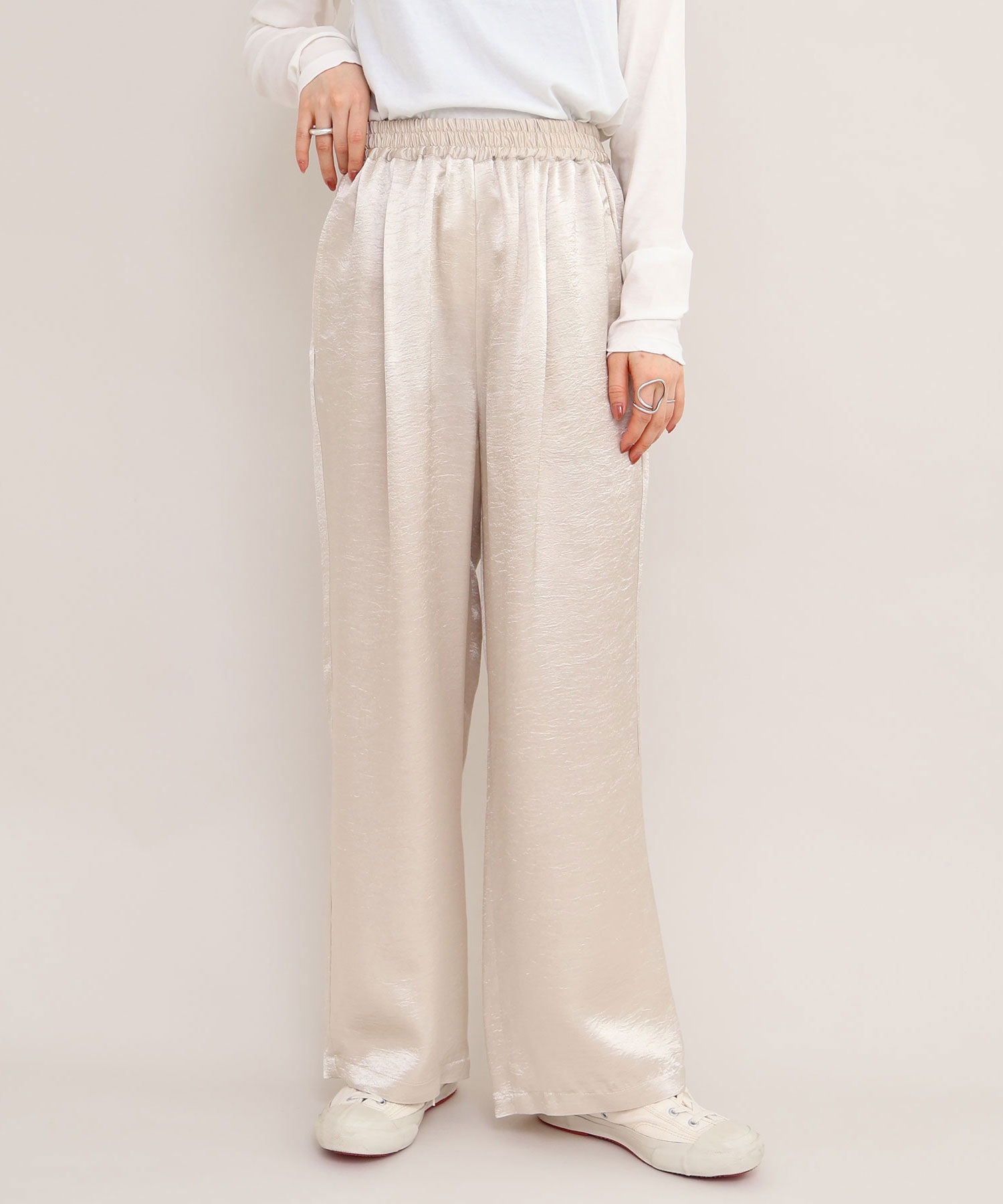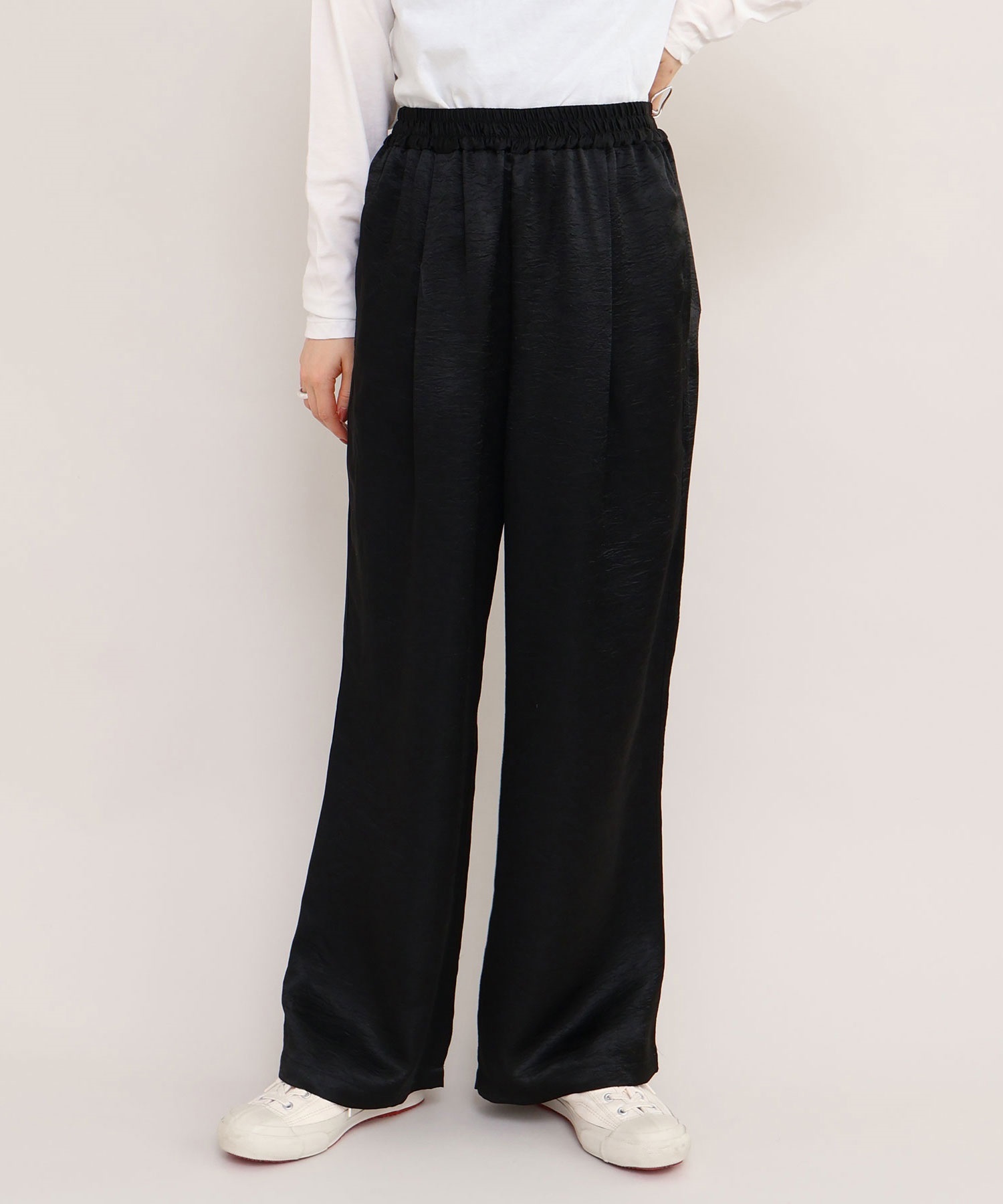 イージーにはけるサテンパンツはアセテート100%の生地を使用。