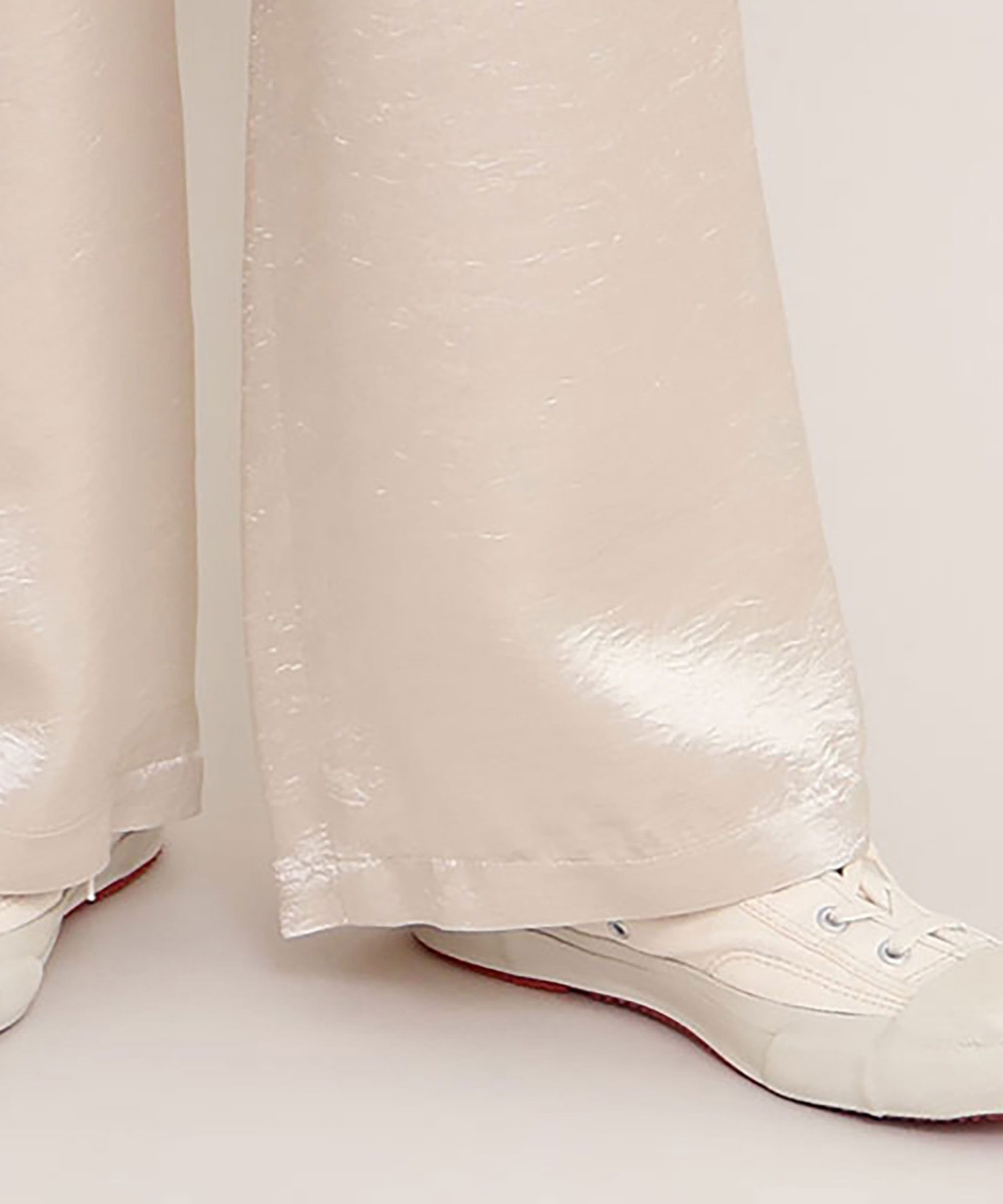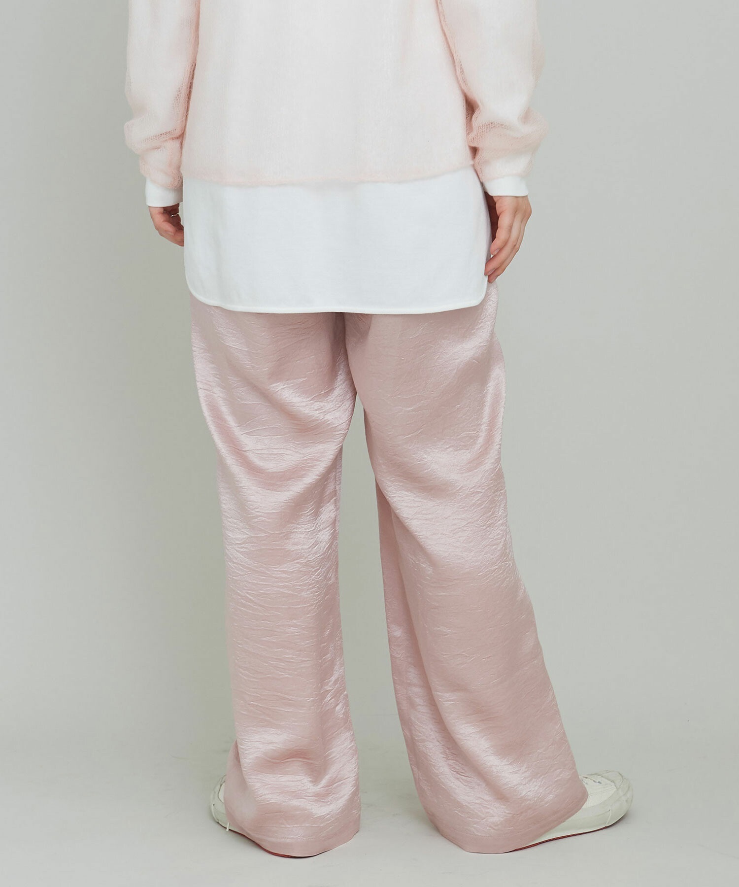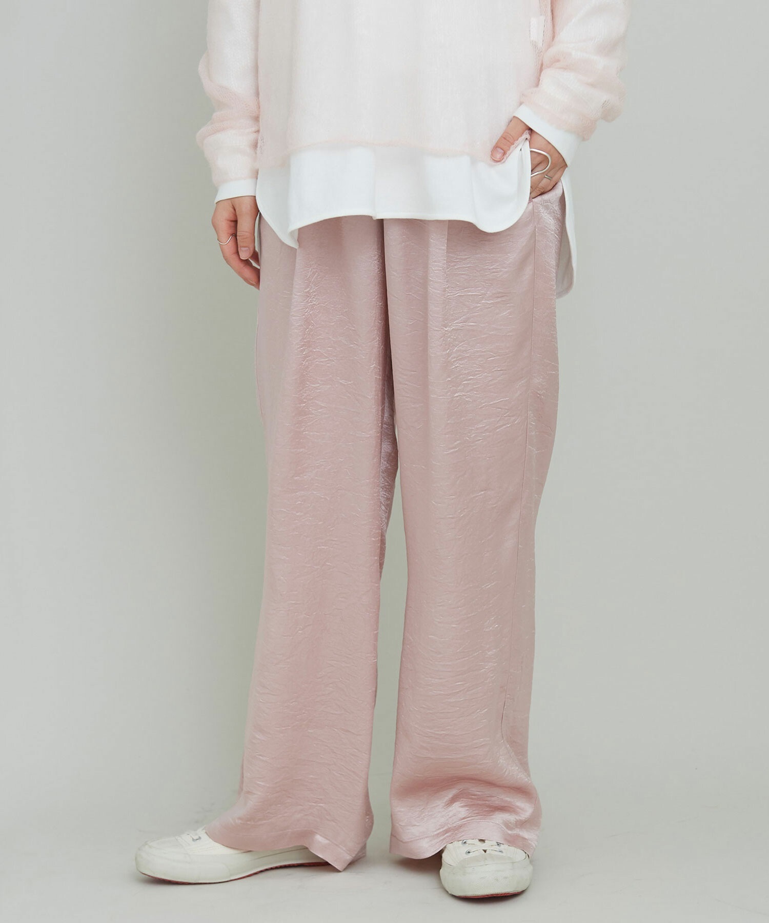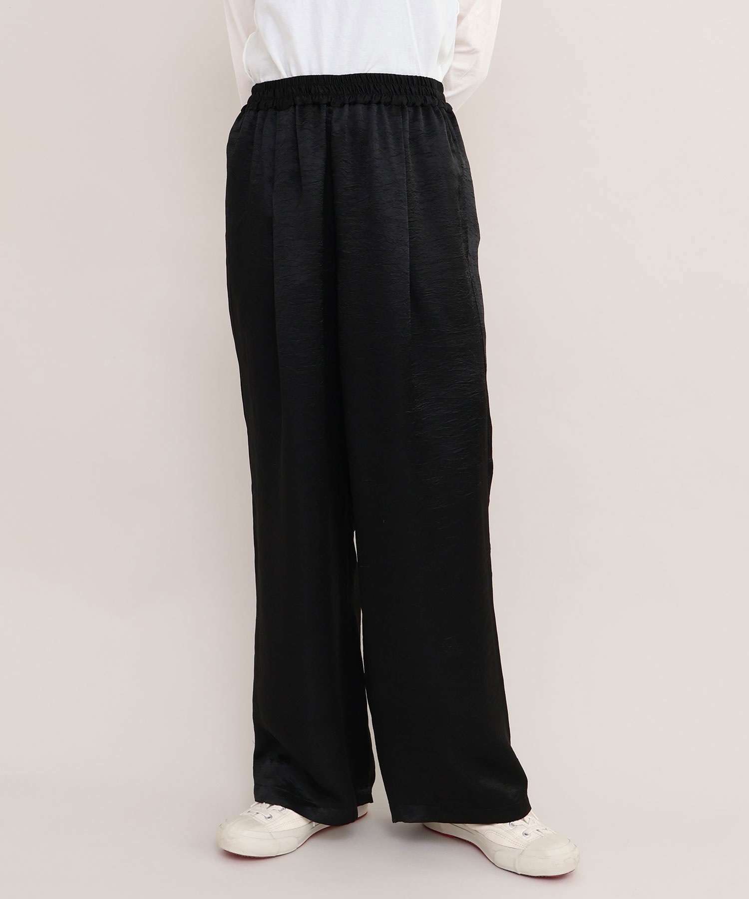 イージーにはけるサテンパンツはアセテート100%の生地を使用。