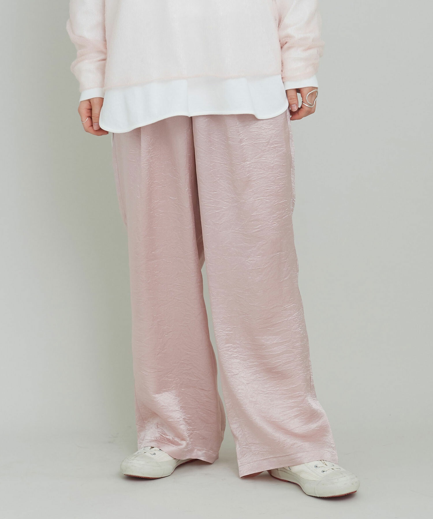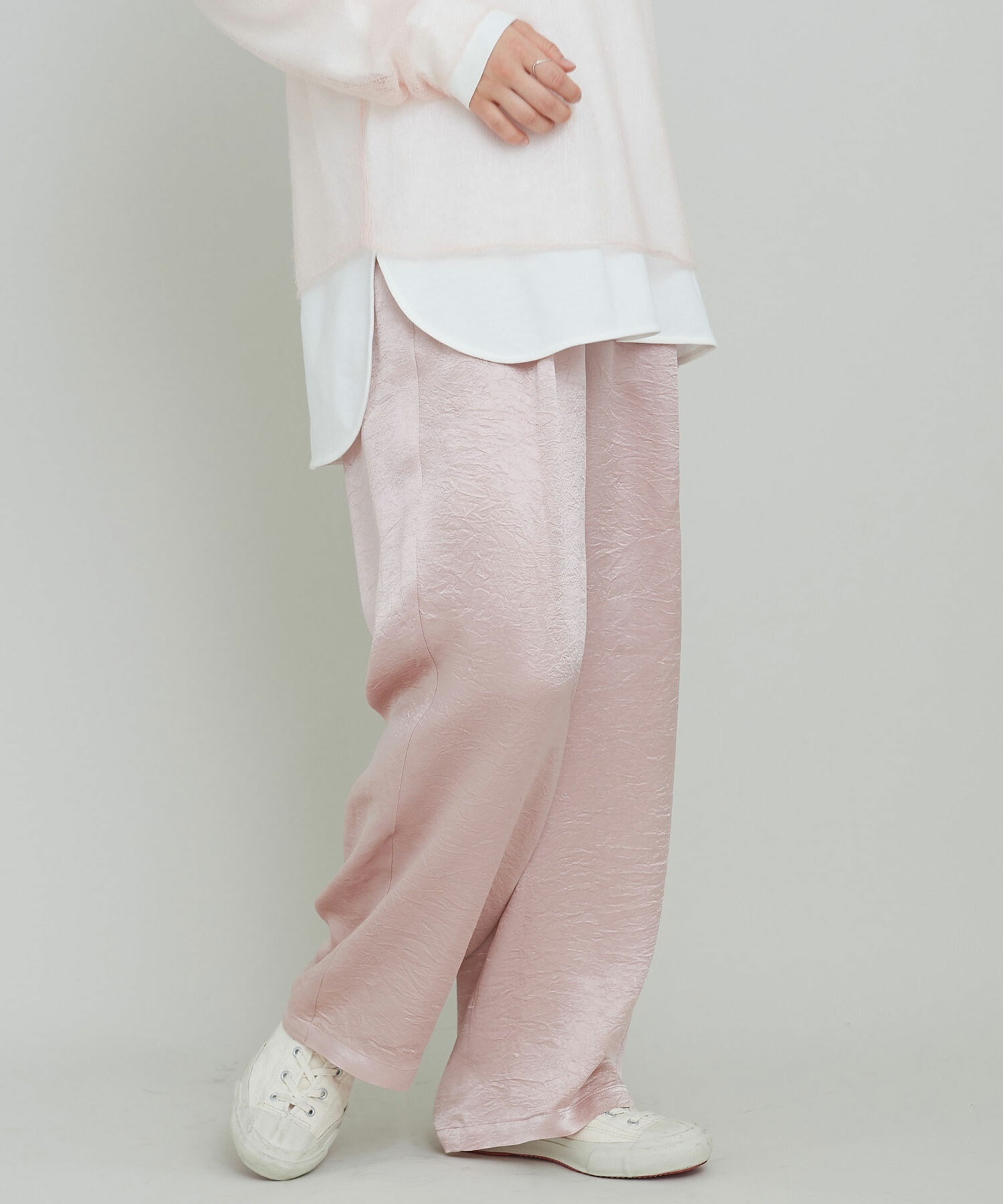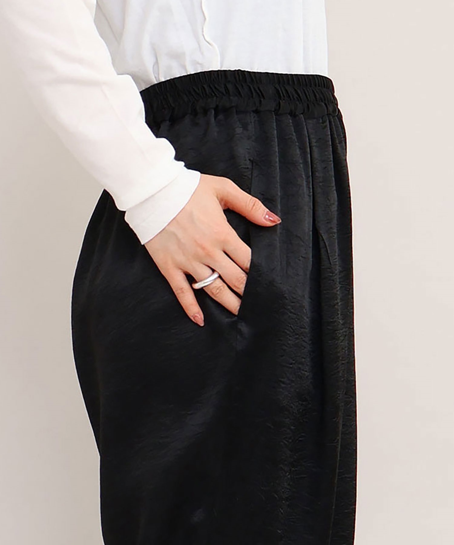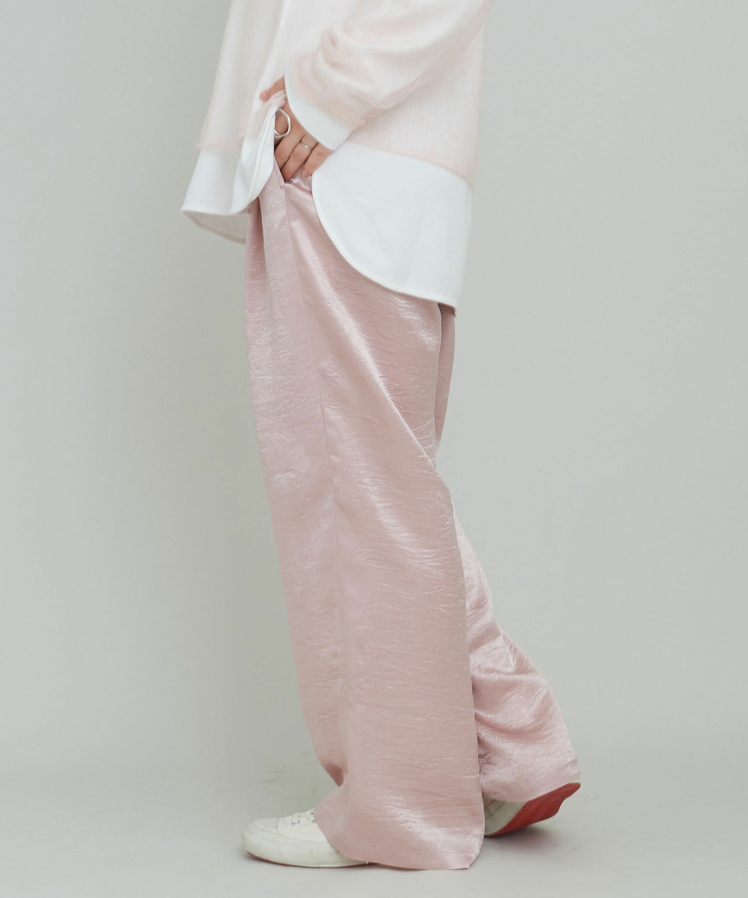イージーにはけるサテンパンツはアセテート100%の生地を使用。