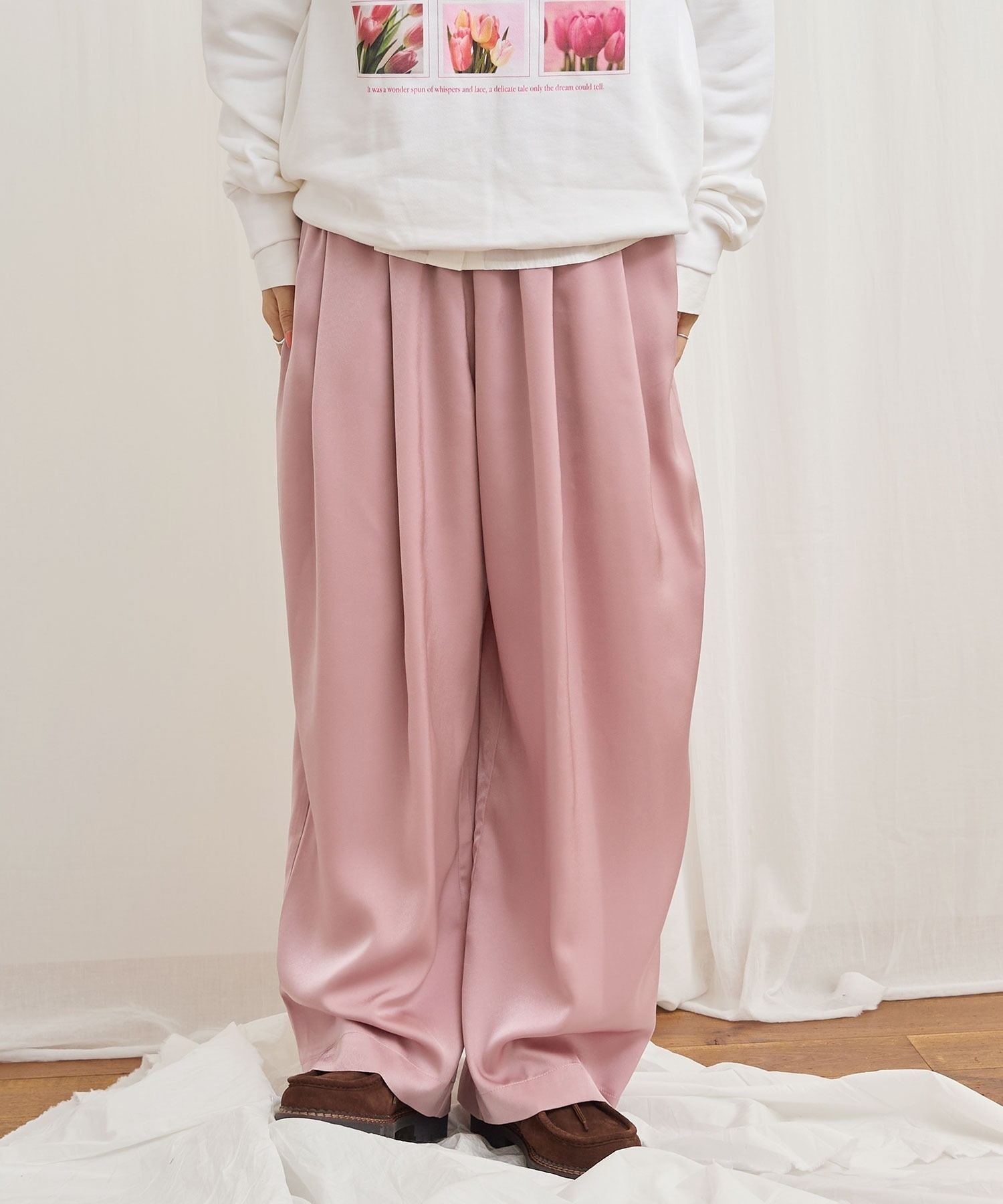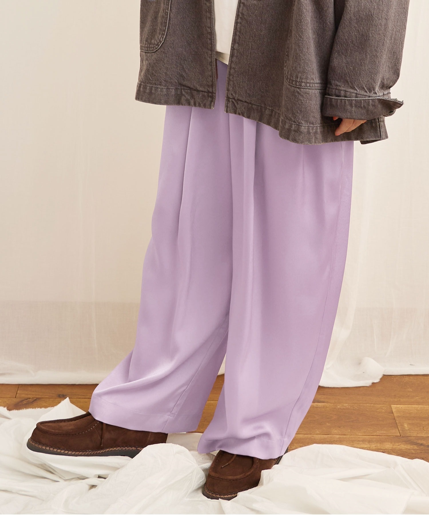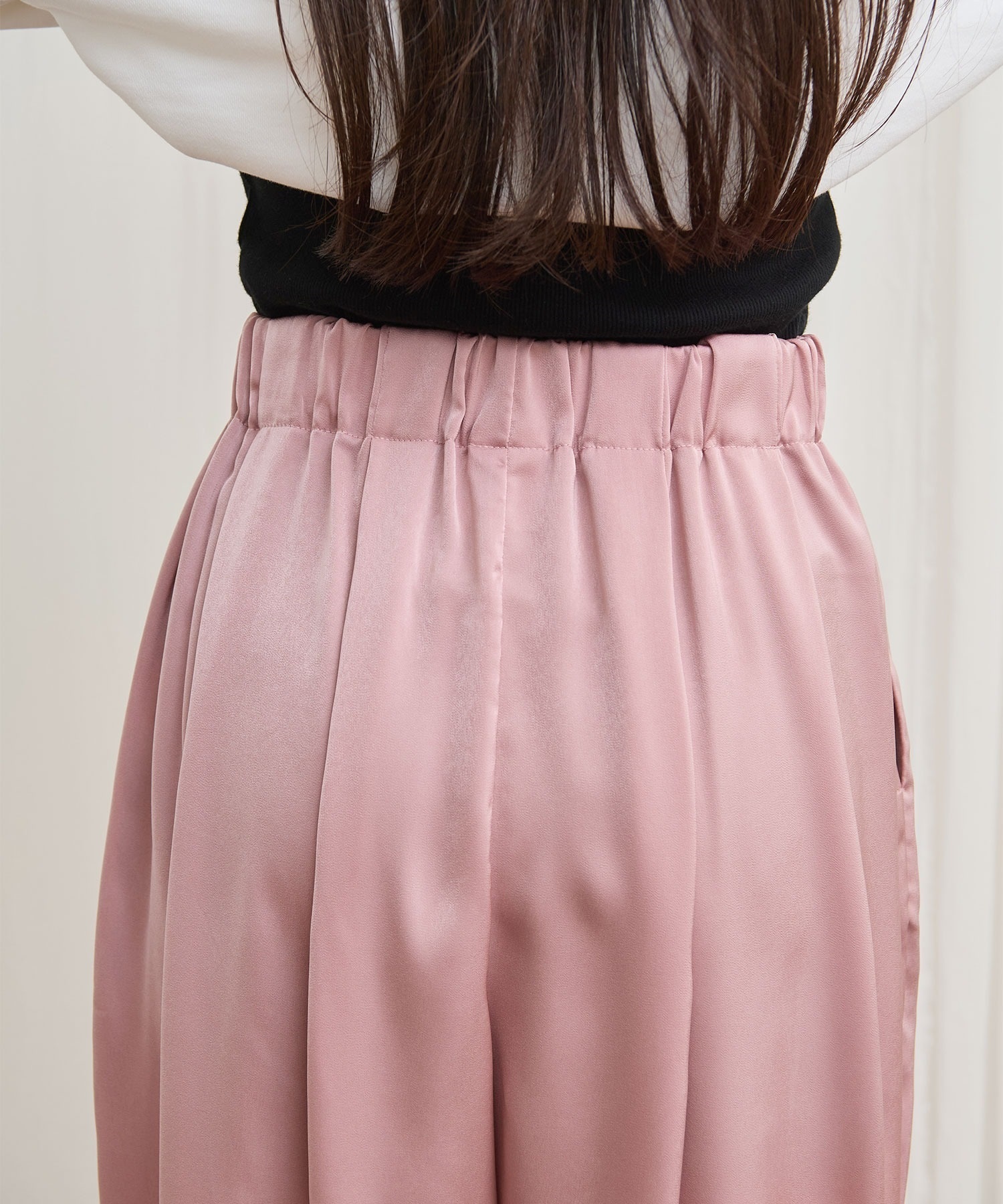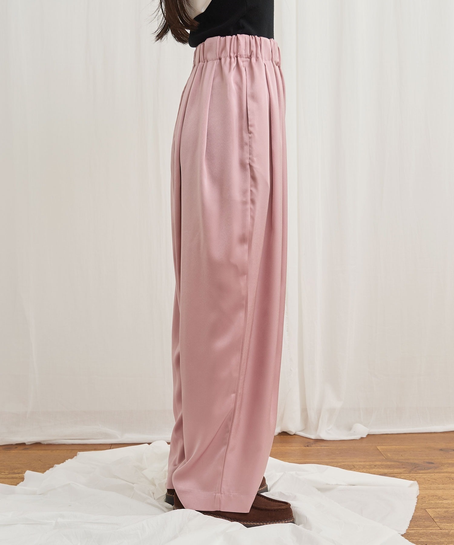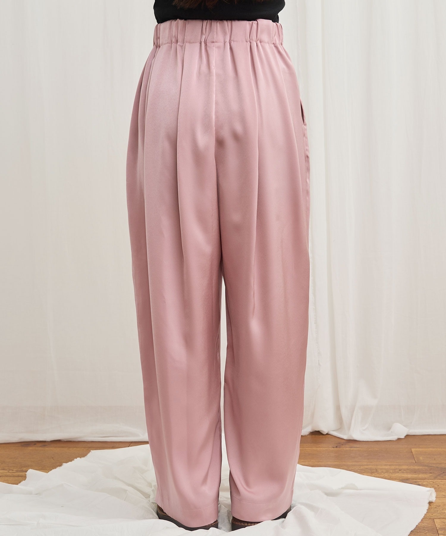 マットなツヤ感の素材に前後にタックをいれふんわりとしたシルエットにしました。