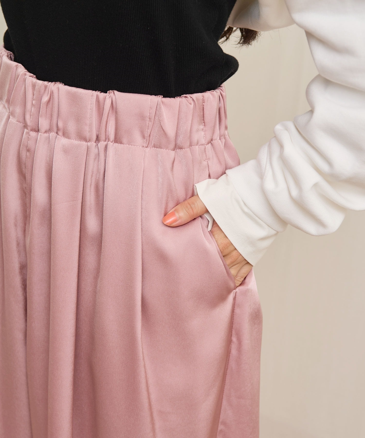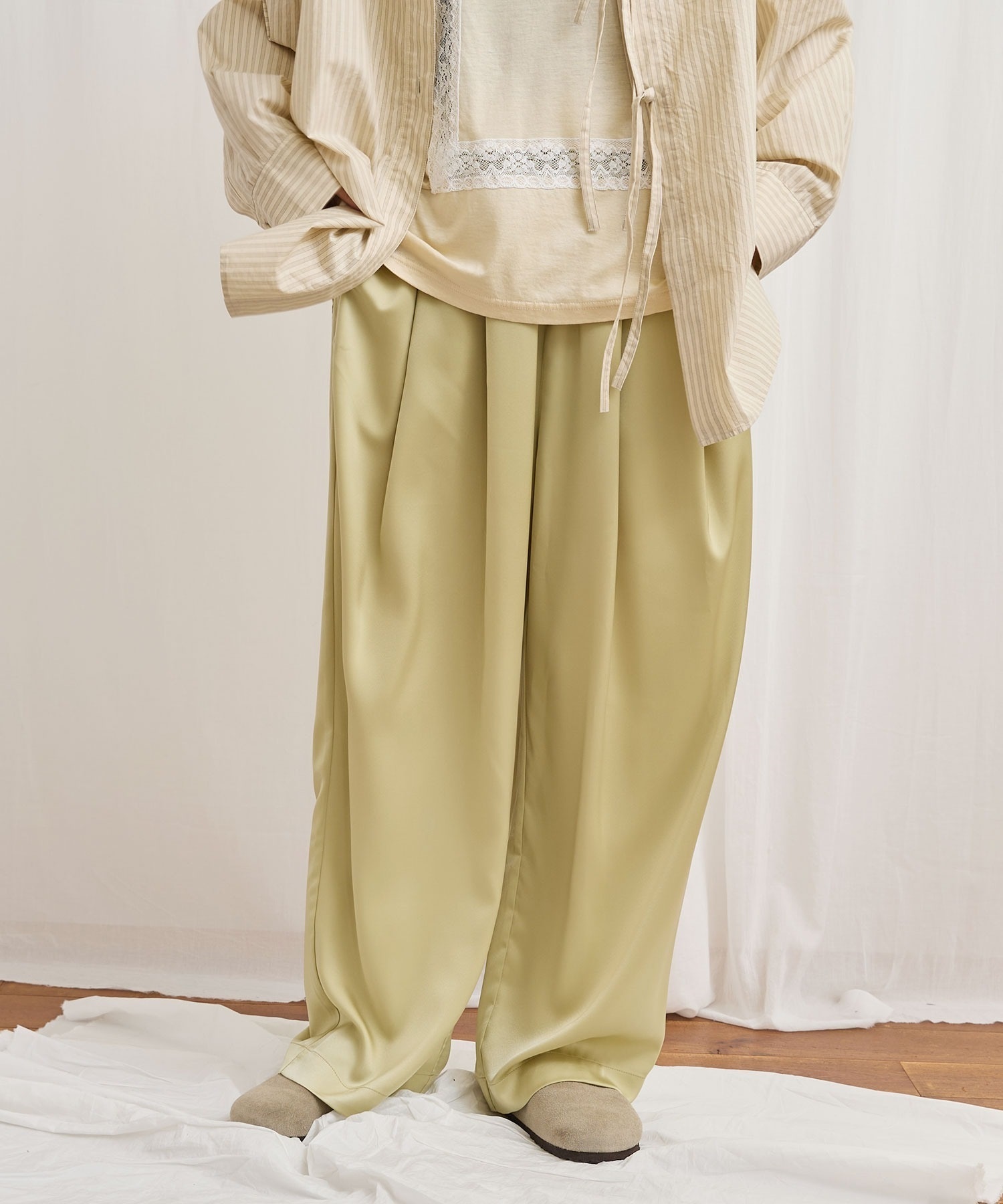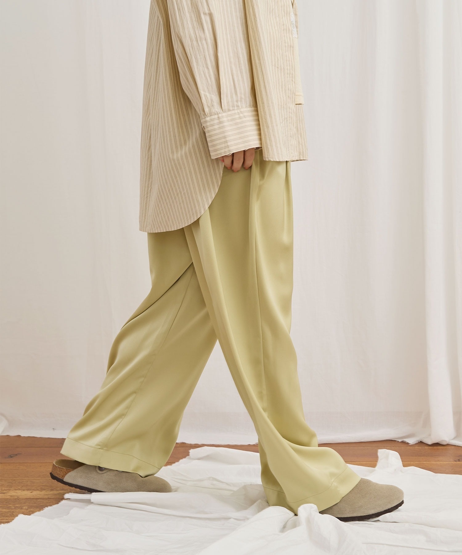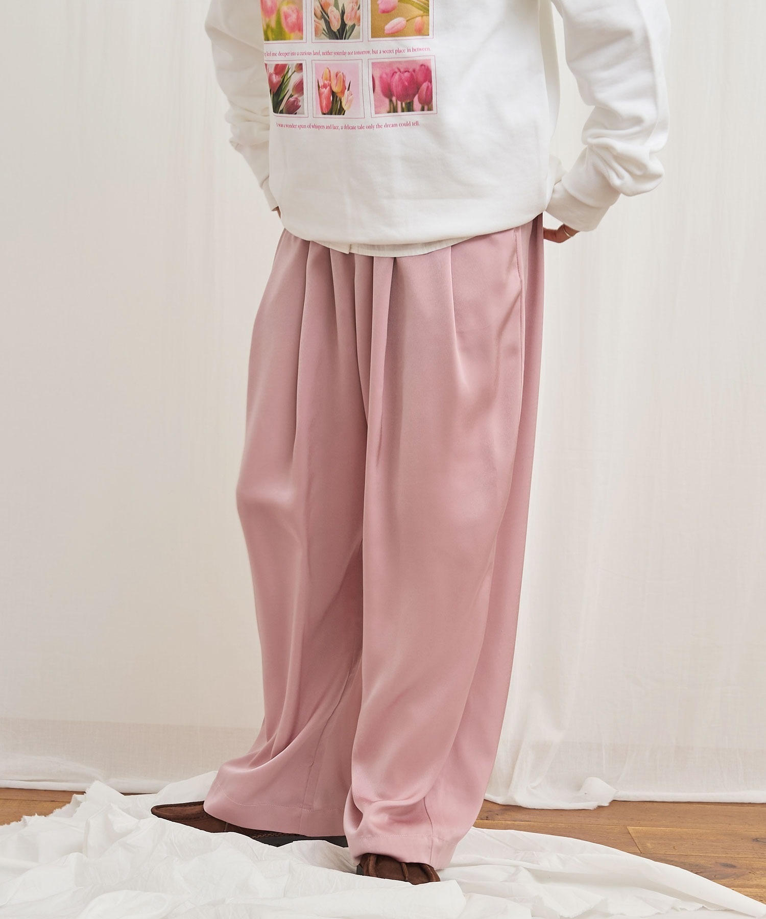 マットなツヤ感の素材に前後にタックをいれふんわりとしたシルエットにしました。