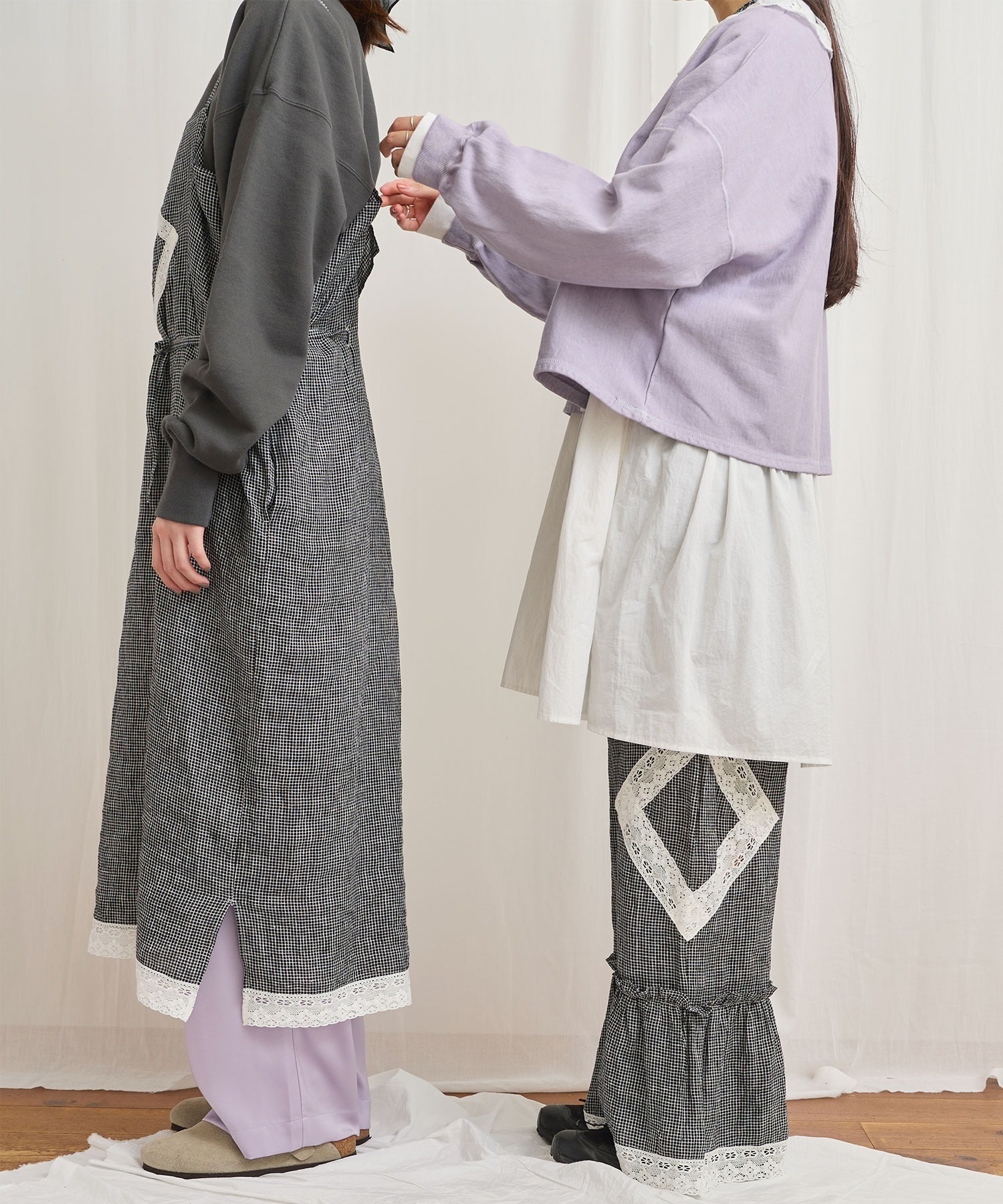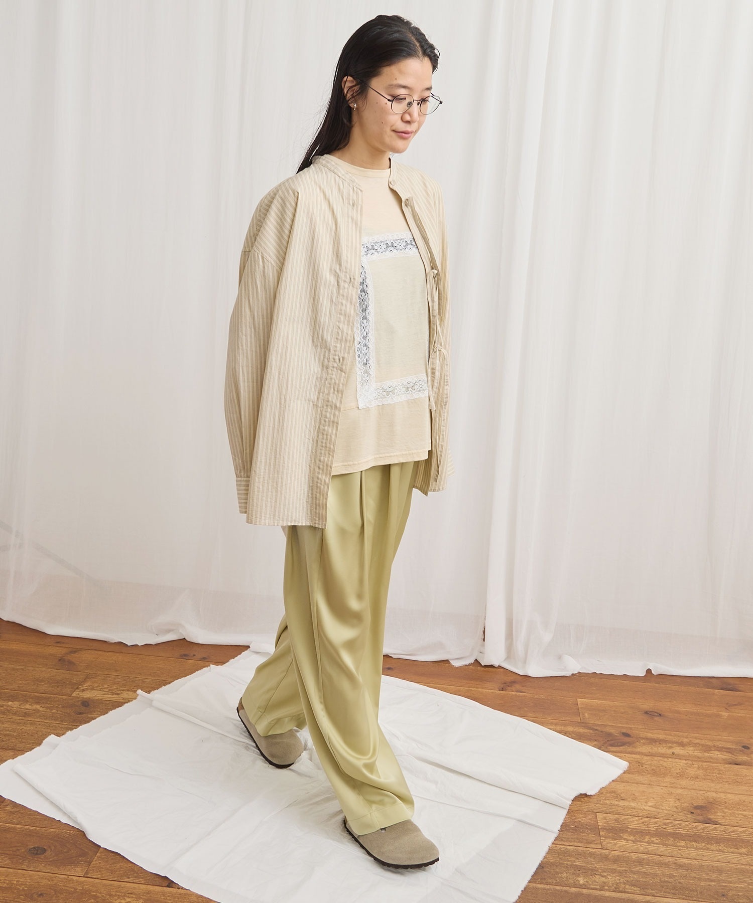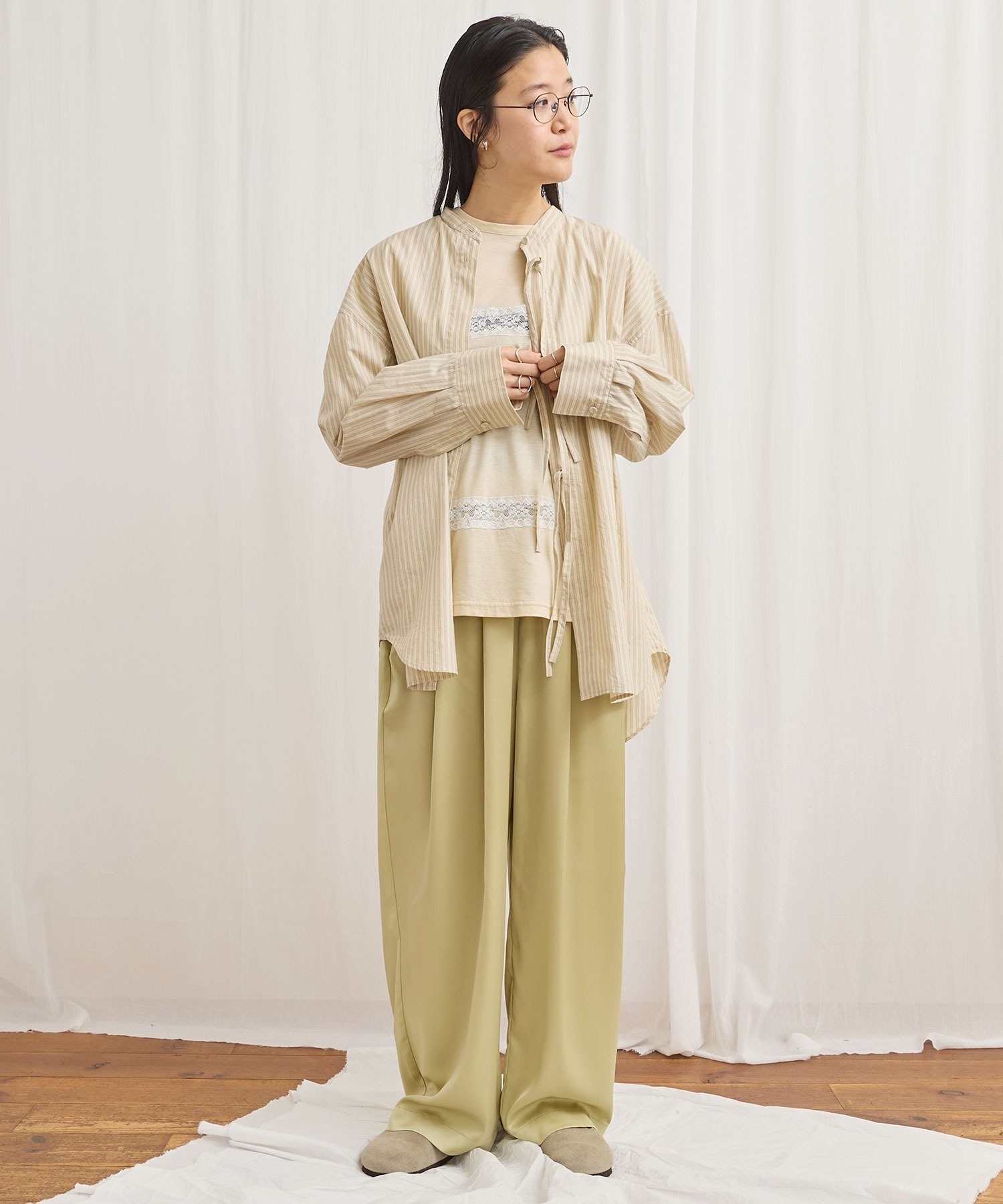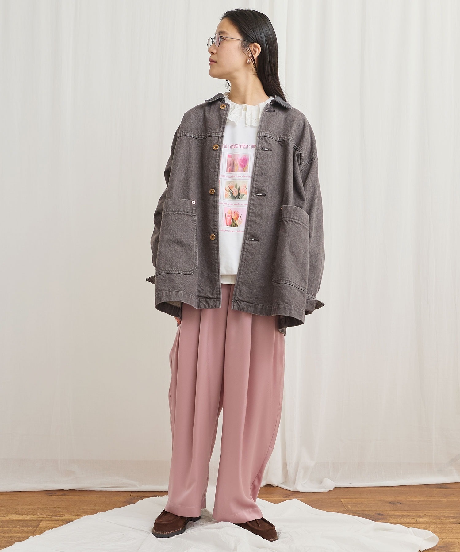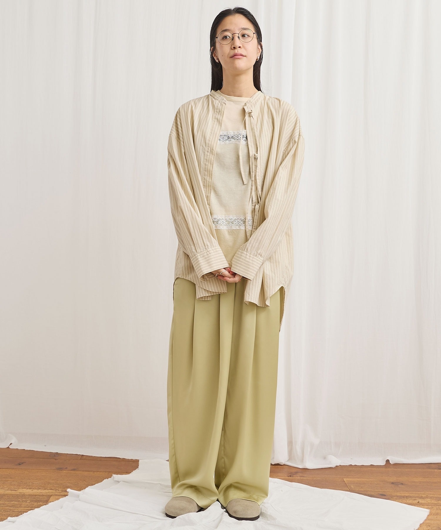 マットなツヤ感の素材に前後にタックをいれふんわりとしたシルエットにしました。