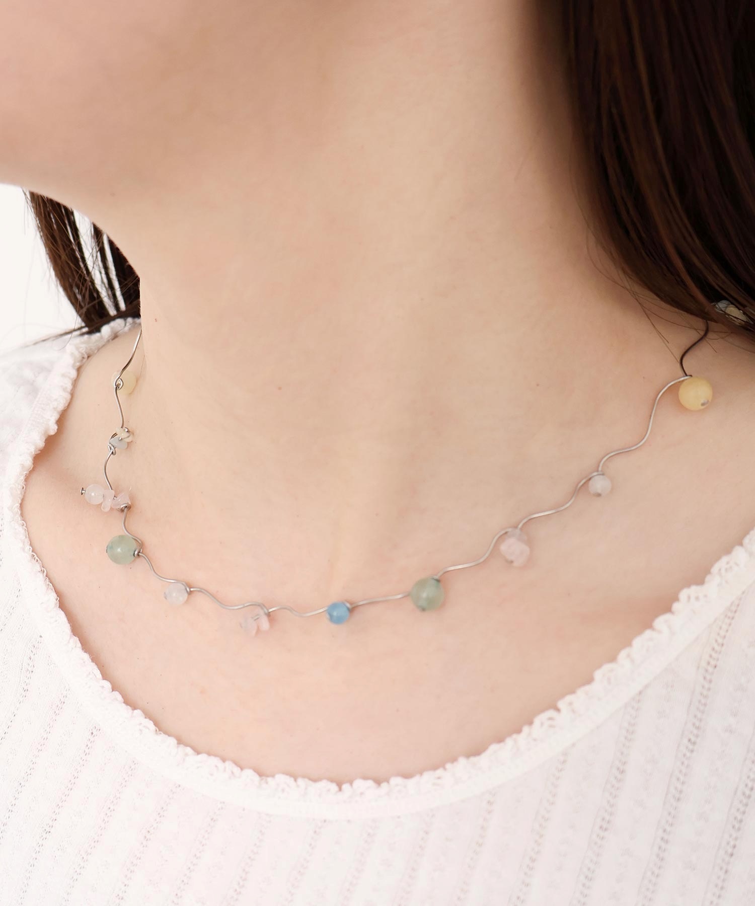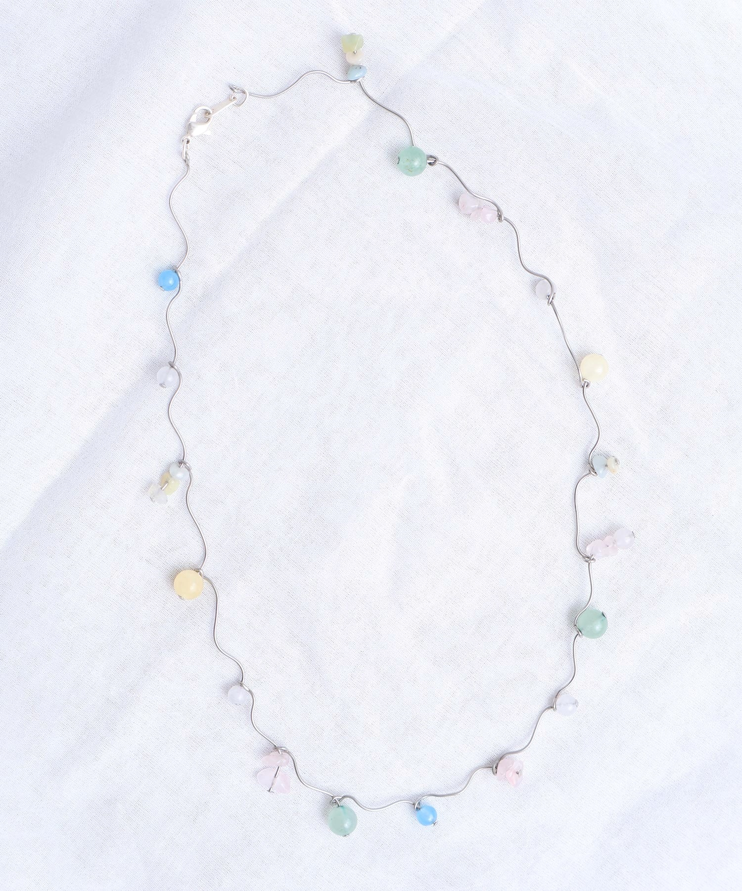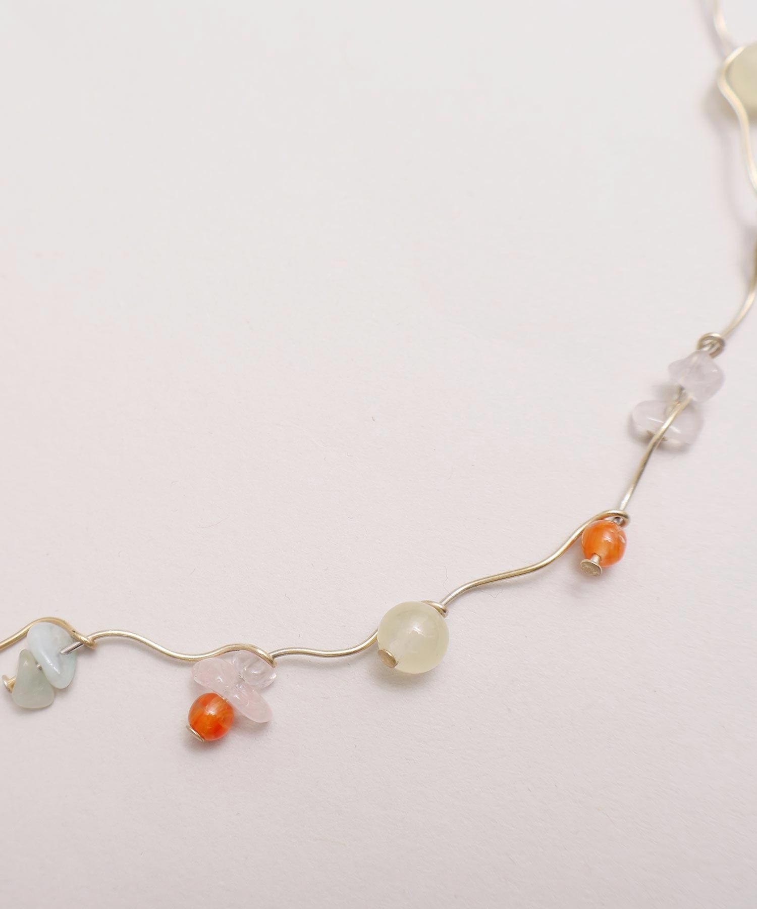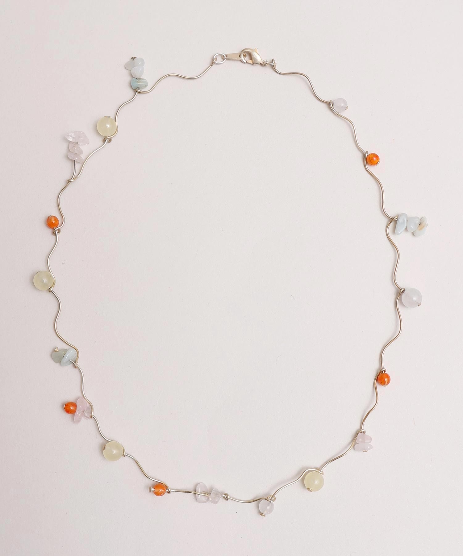 天然石とガラスビーズを組み合わせてくねくねとつながったネックレス。