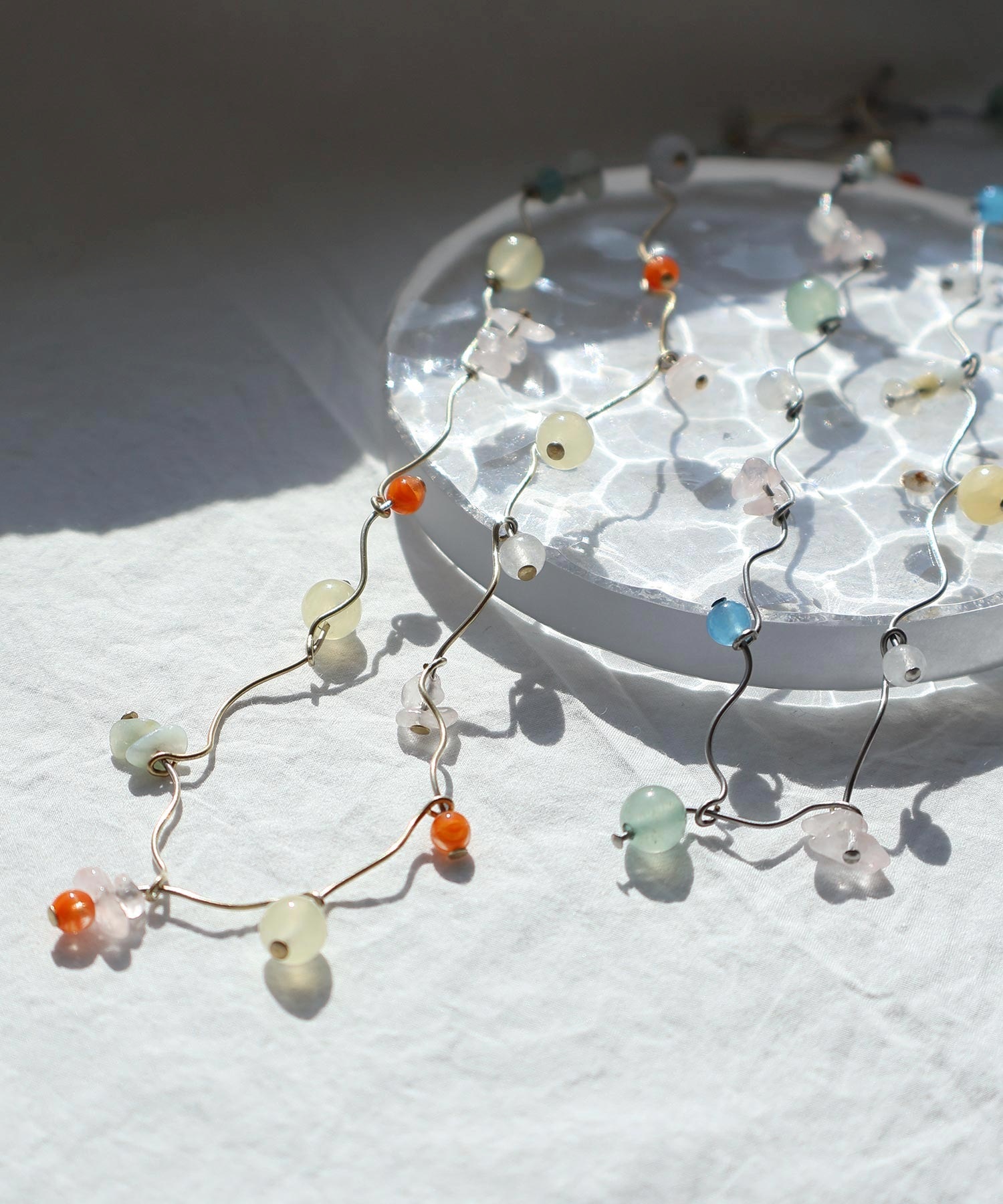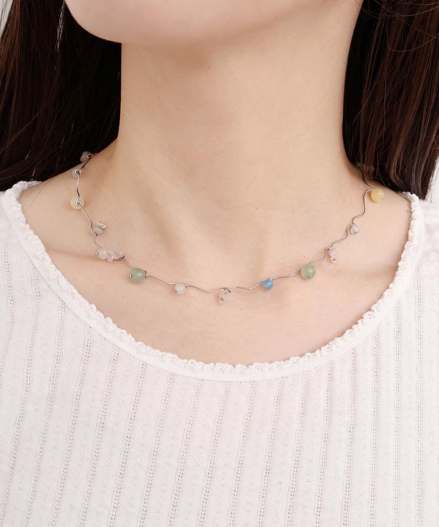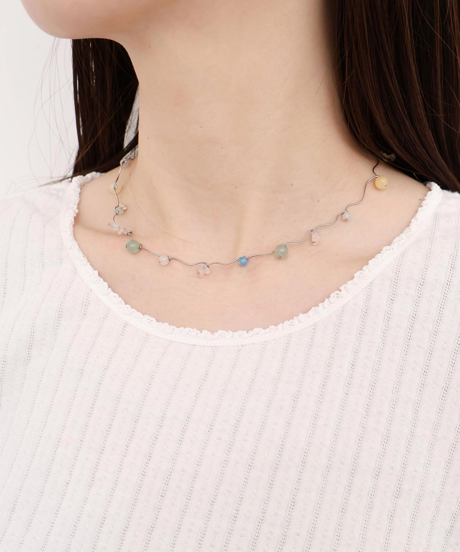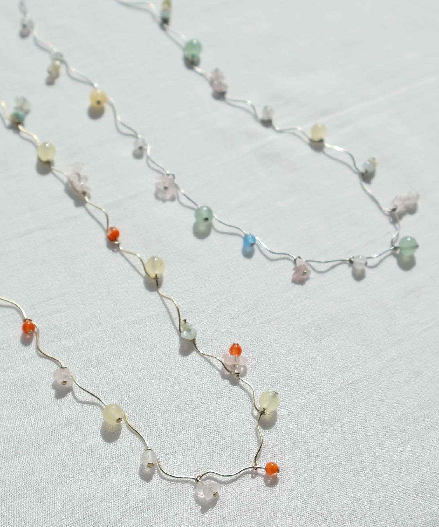 天然石とガラスビーズを組み合わせてくねくねとつながったネックレス。