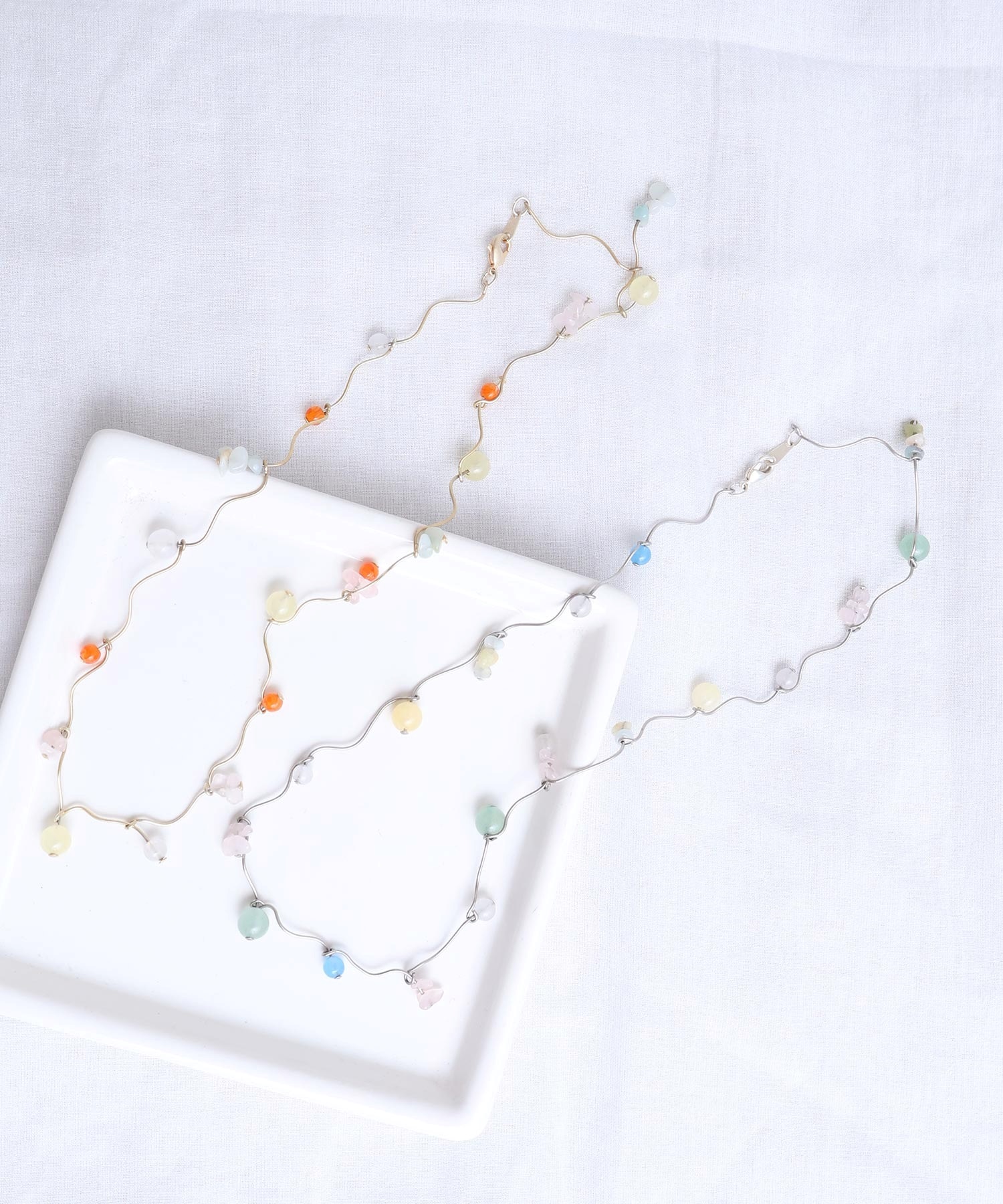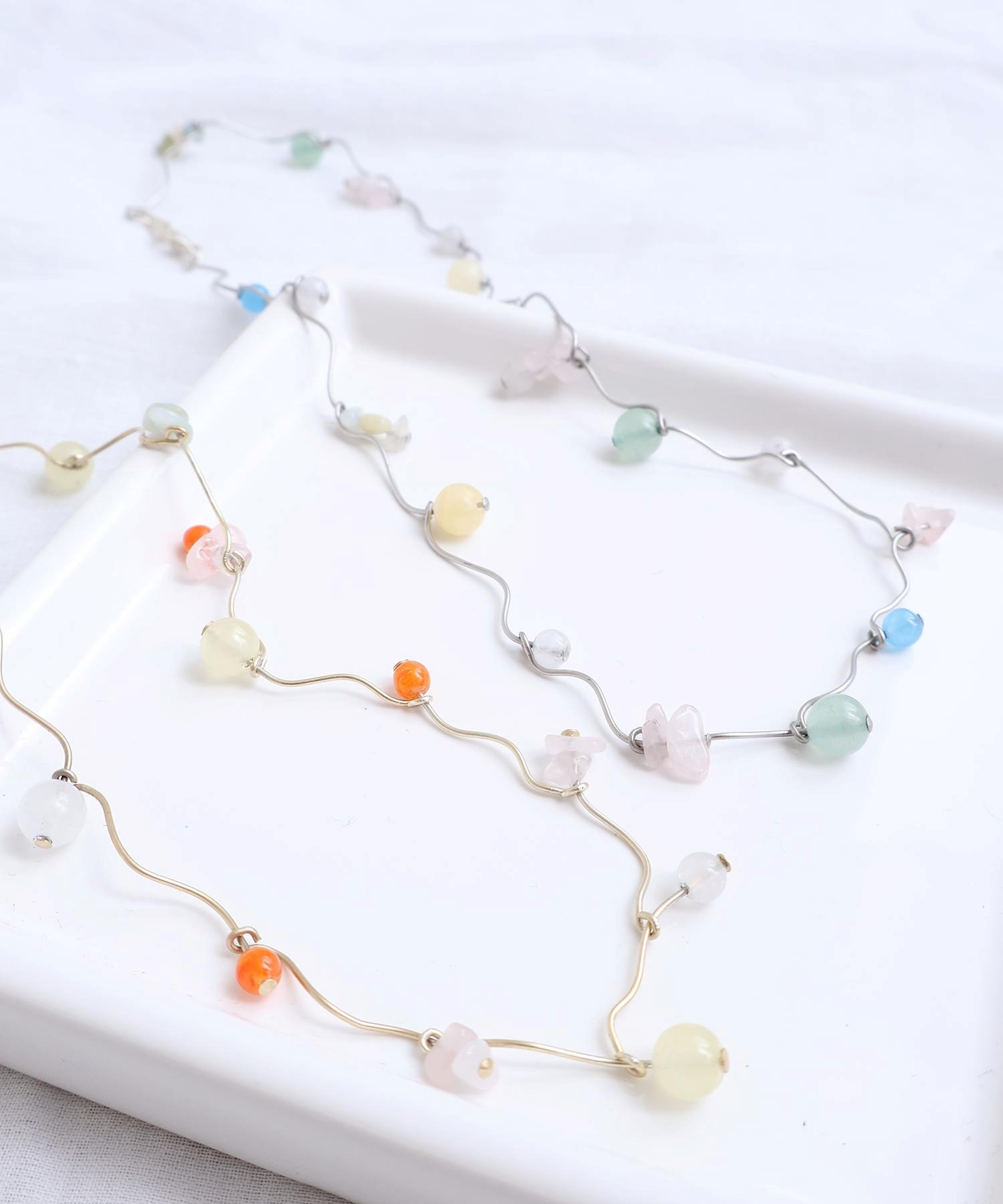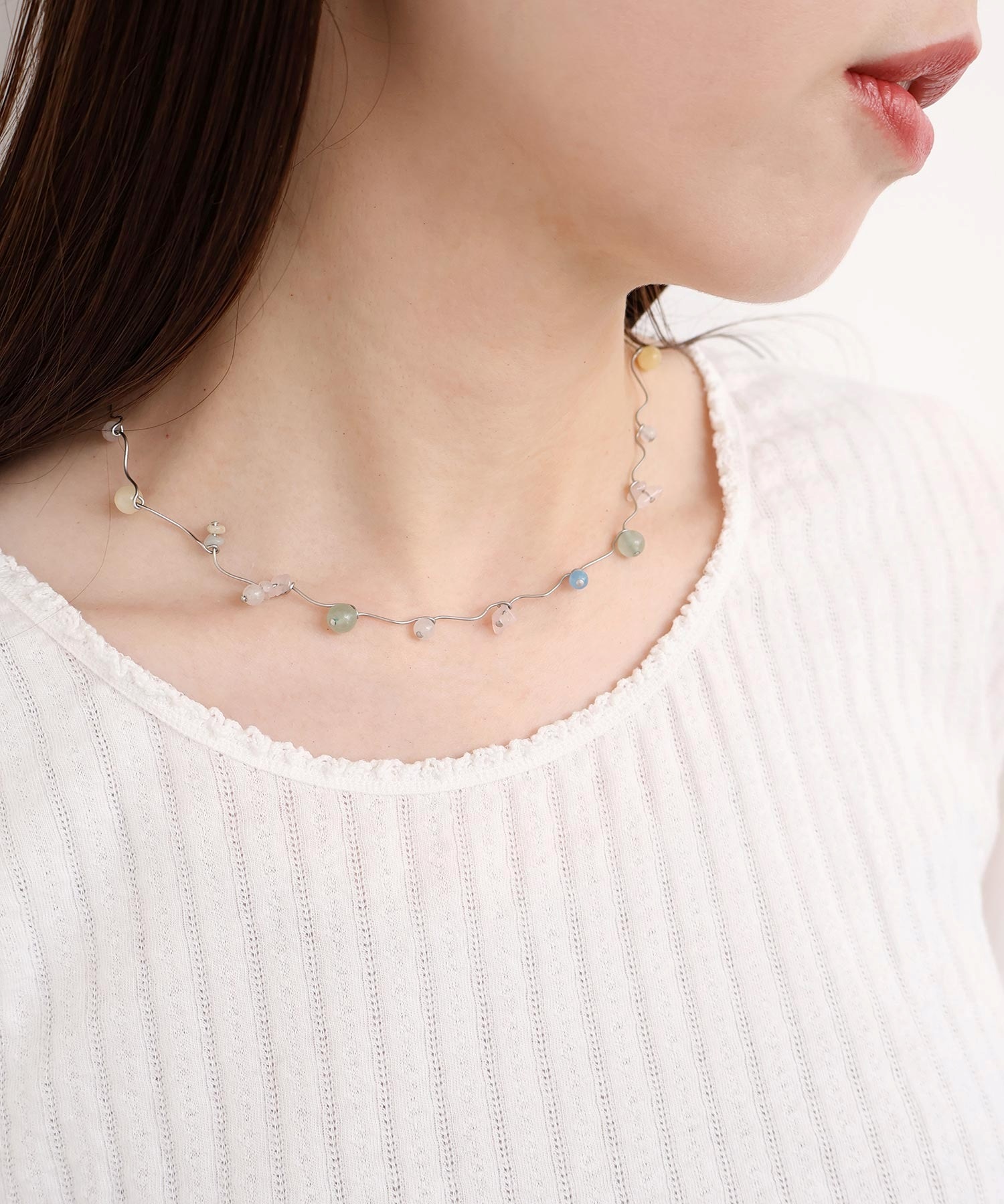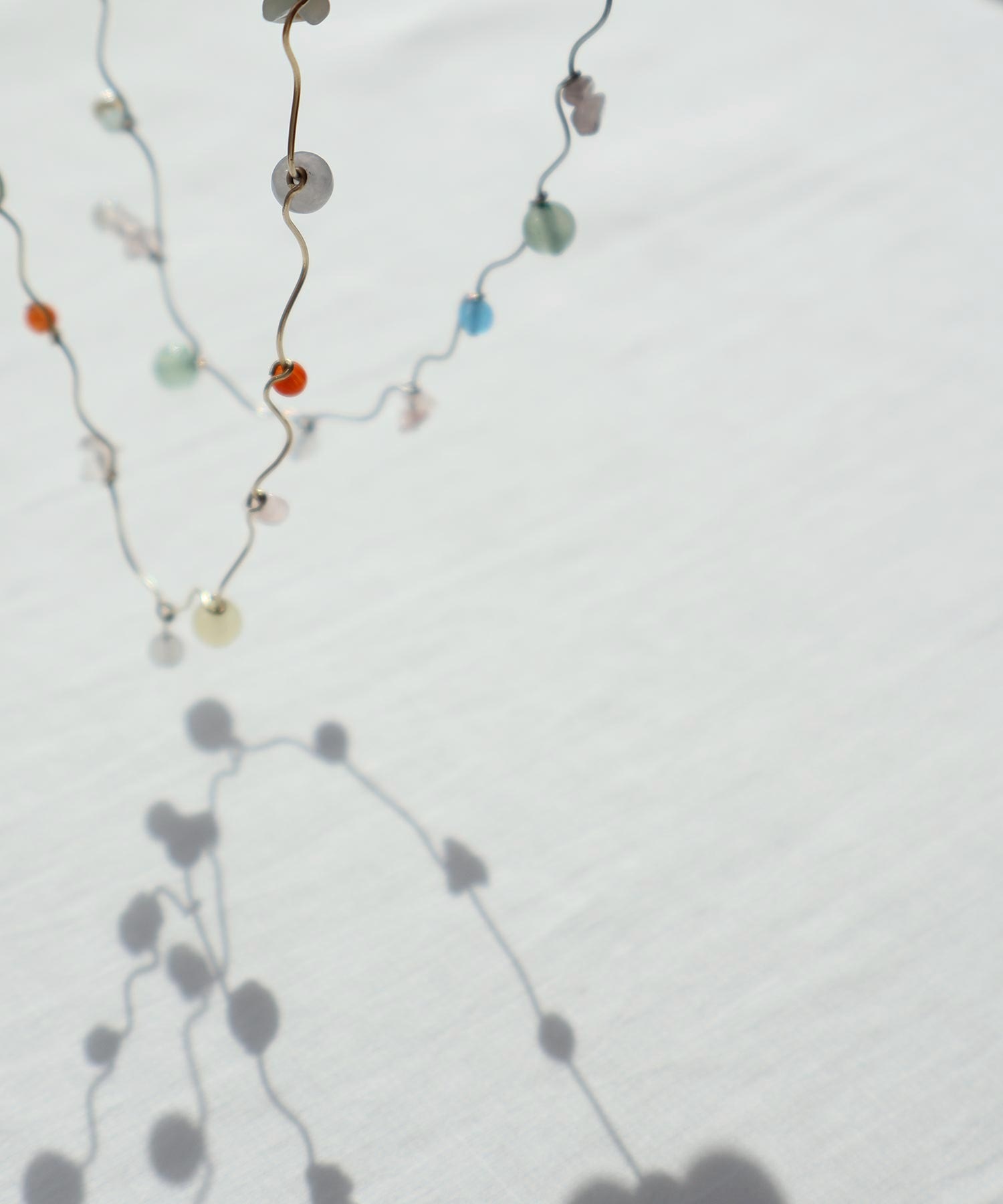 天然石とガラスビーズを組み合わせてくねくねとつながったネックレス。