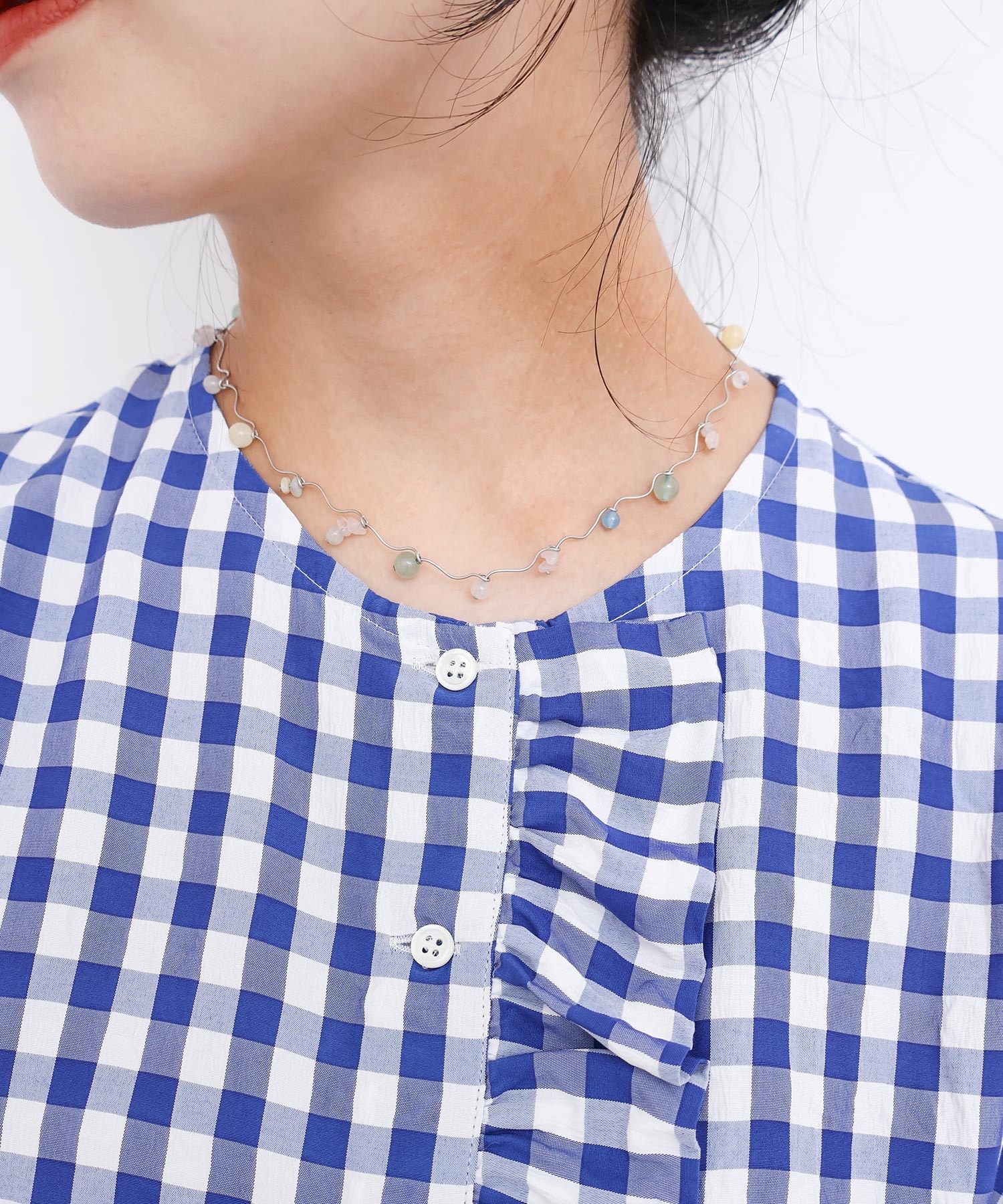 主張しすぎないけどほんのり首元に華やかな色合いは、天然石をつかっているのでカラフルだけどチープにならず