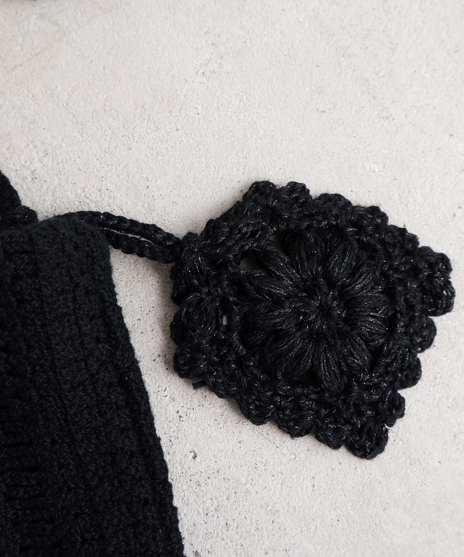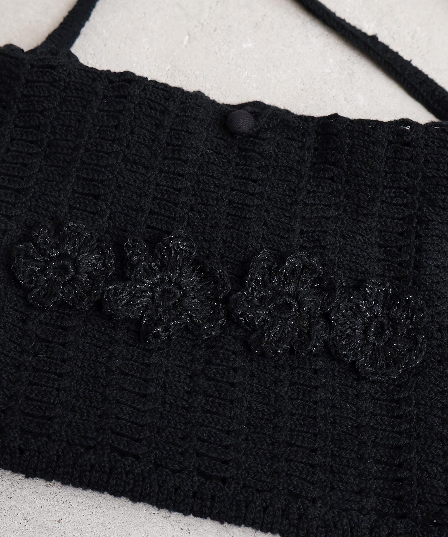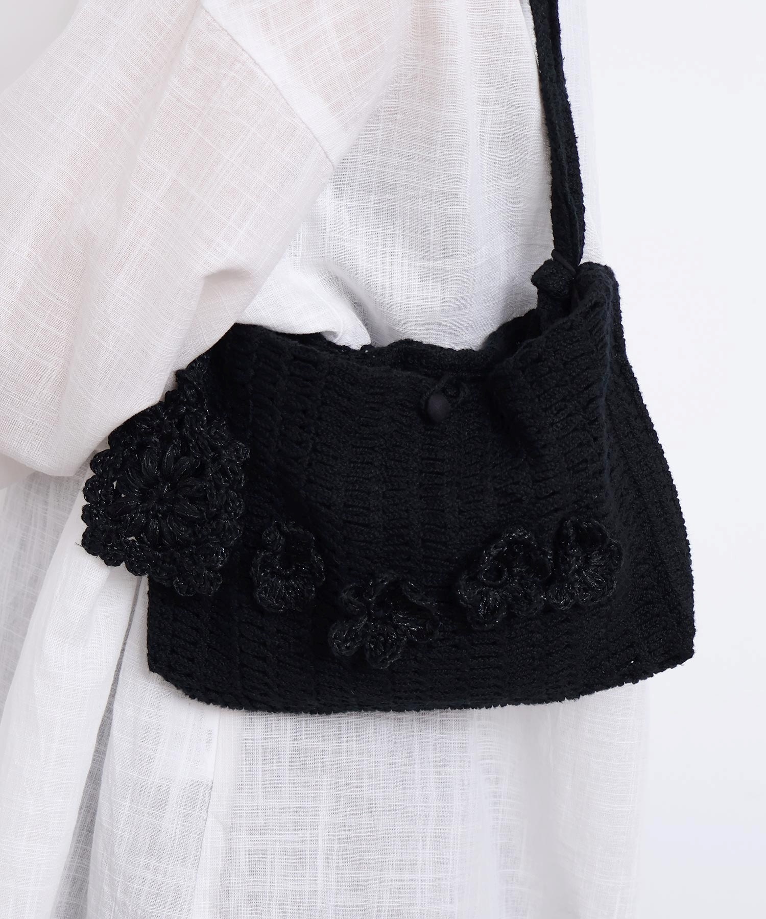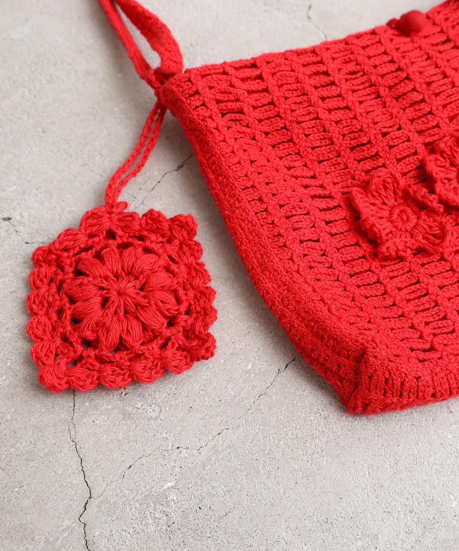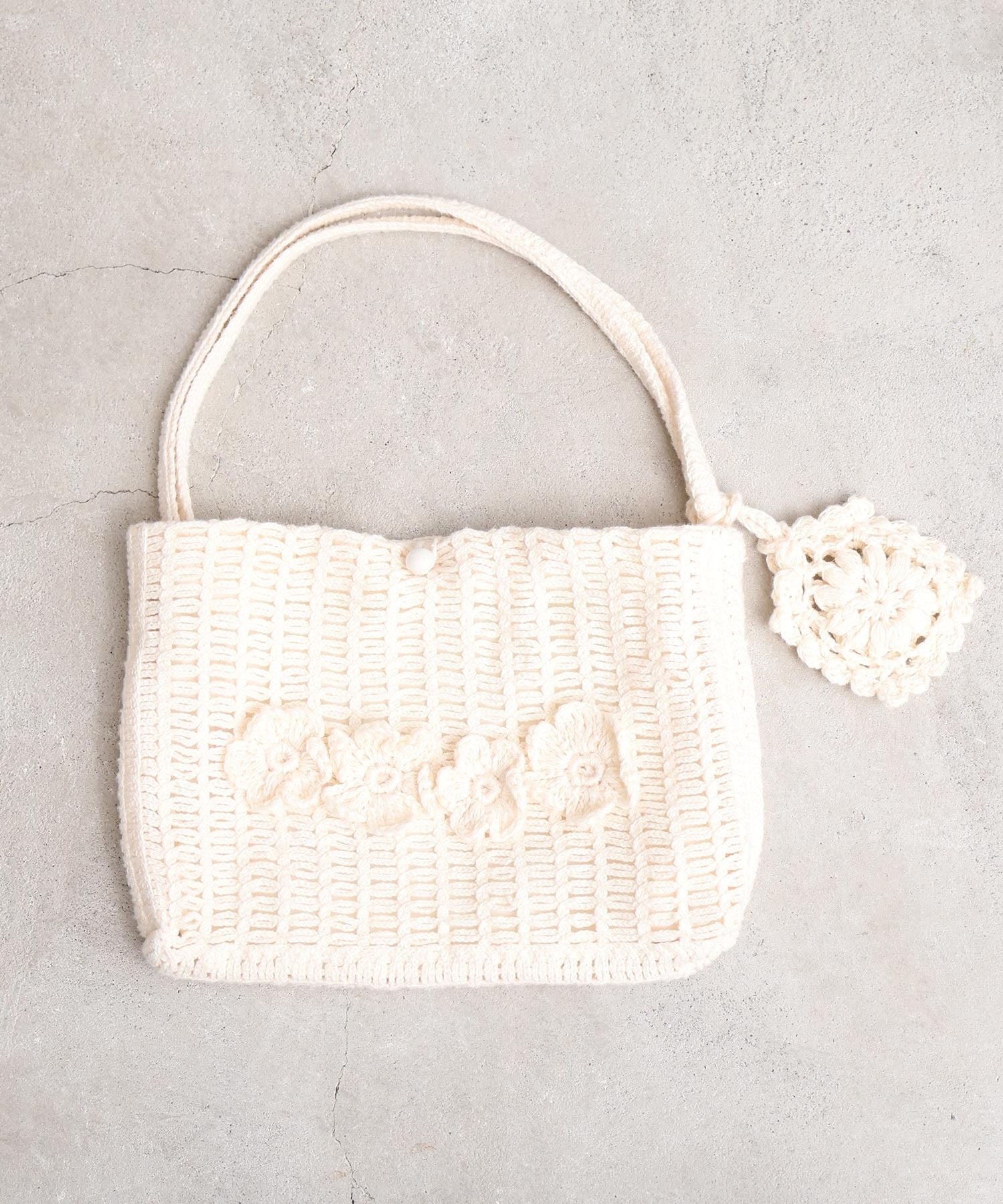手編みのお花モチーフがついたハンドメイドのようなミニバッグ。