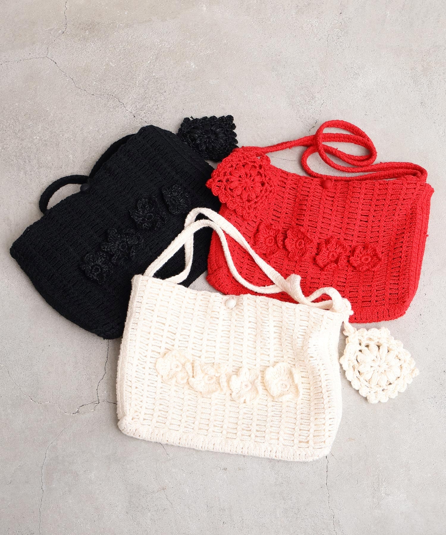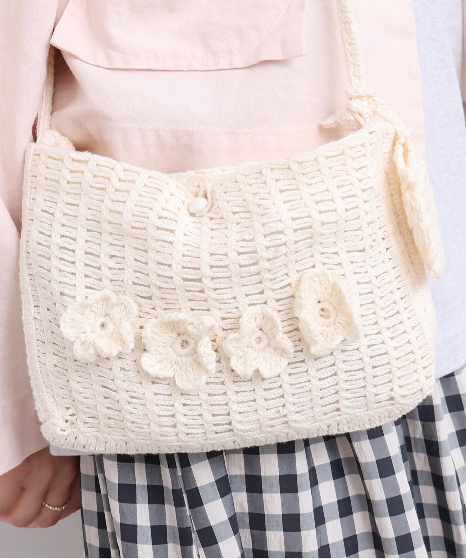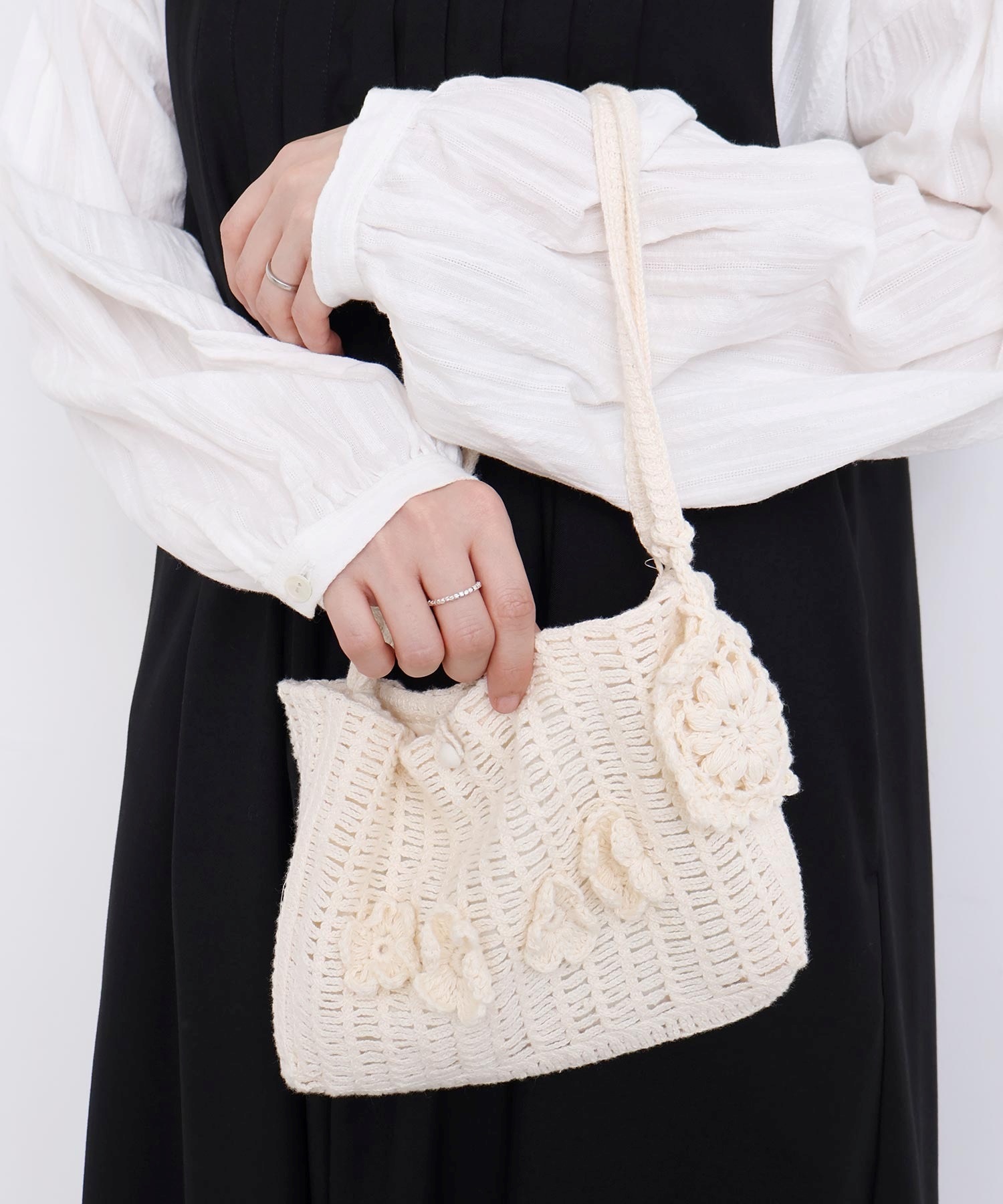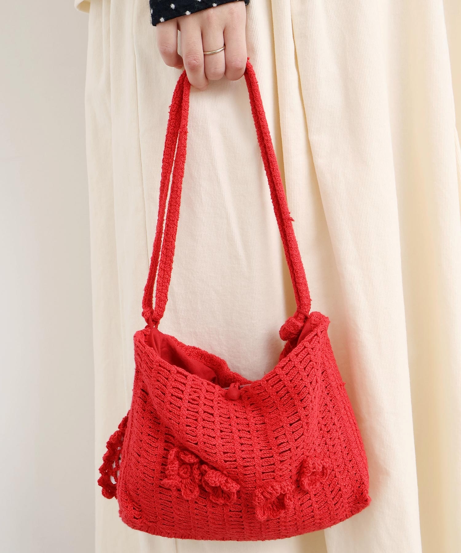 手編みのお花モチーフがついたハンドメイドのようなミニバッグ。