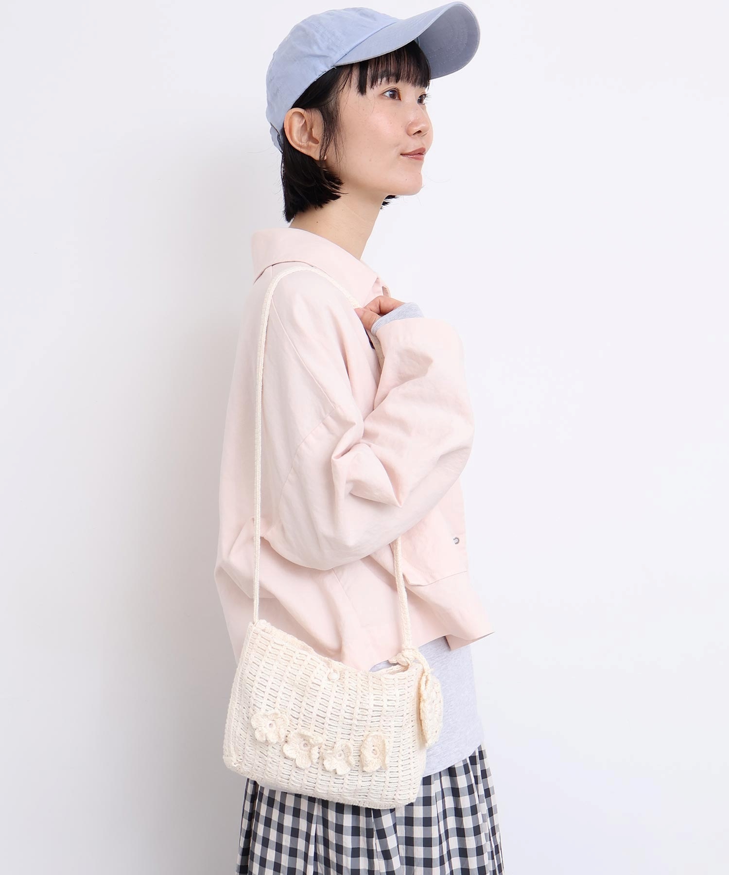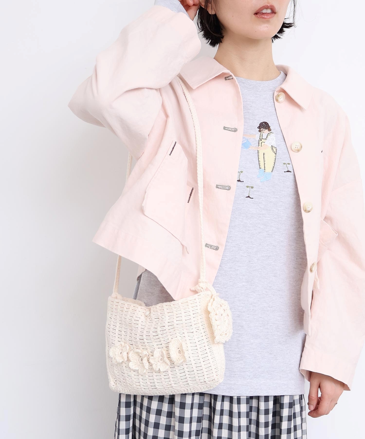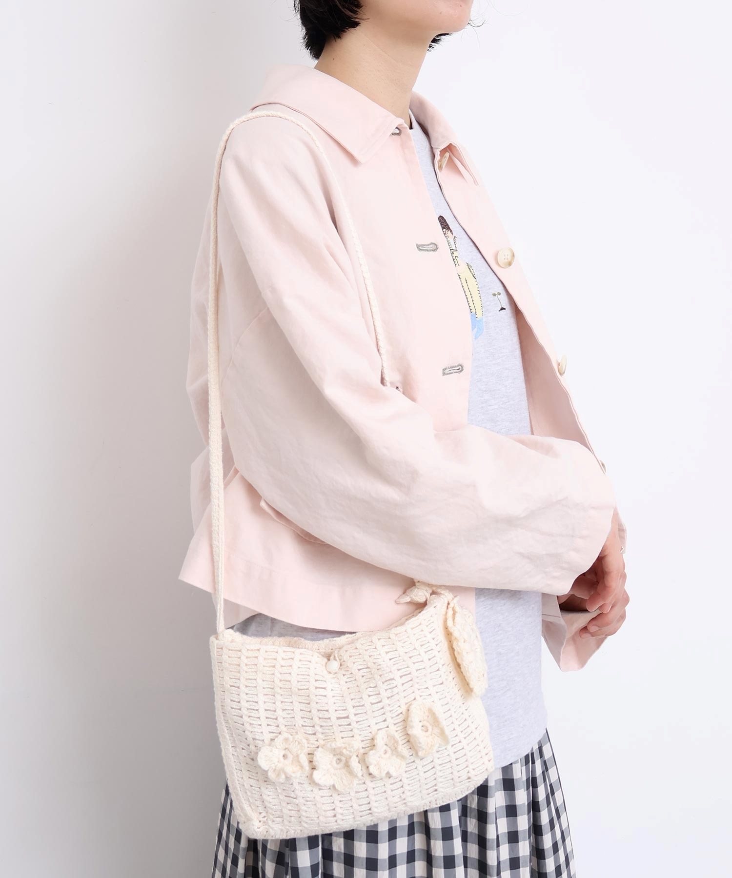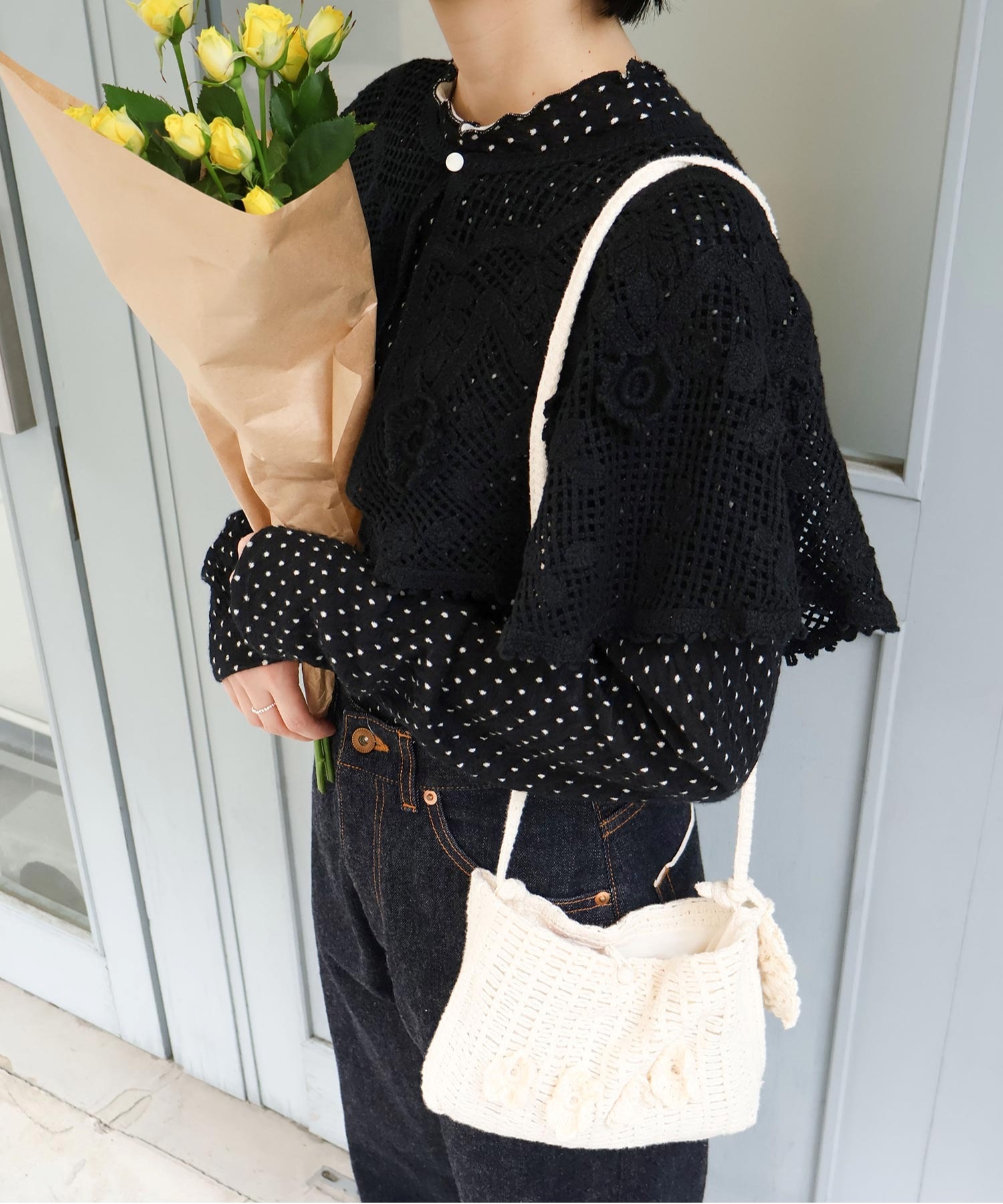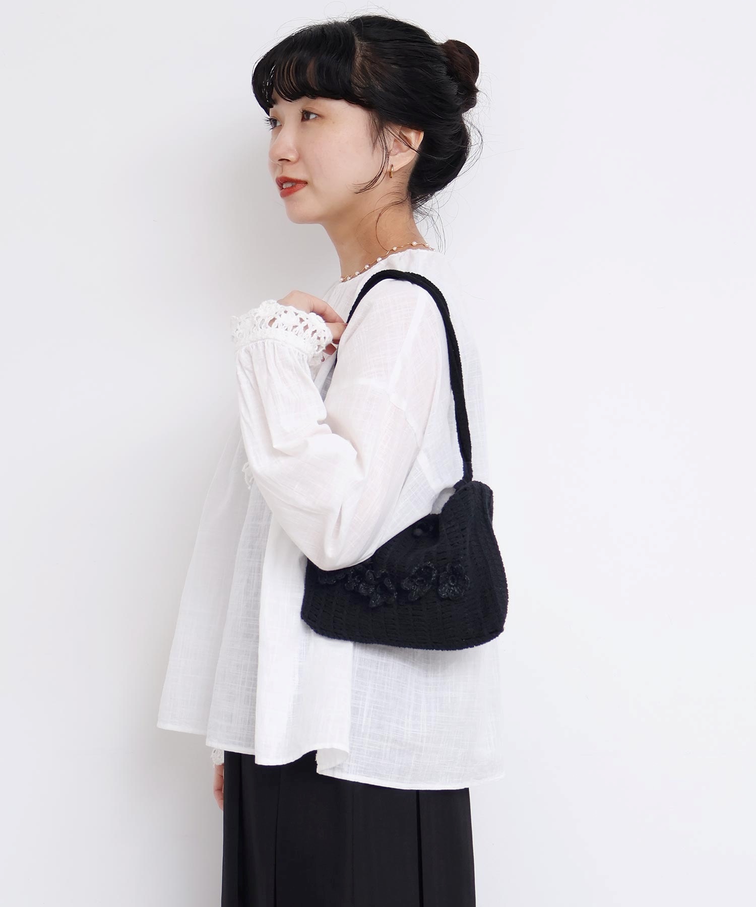 手編みのお花モチーフがついたハンドメイドのようなミニバッグ。