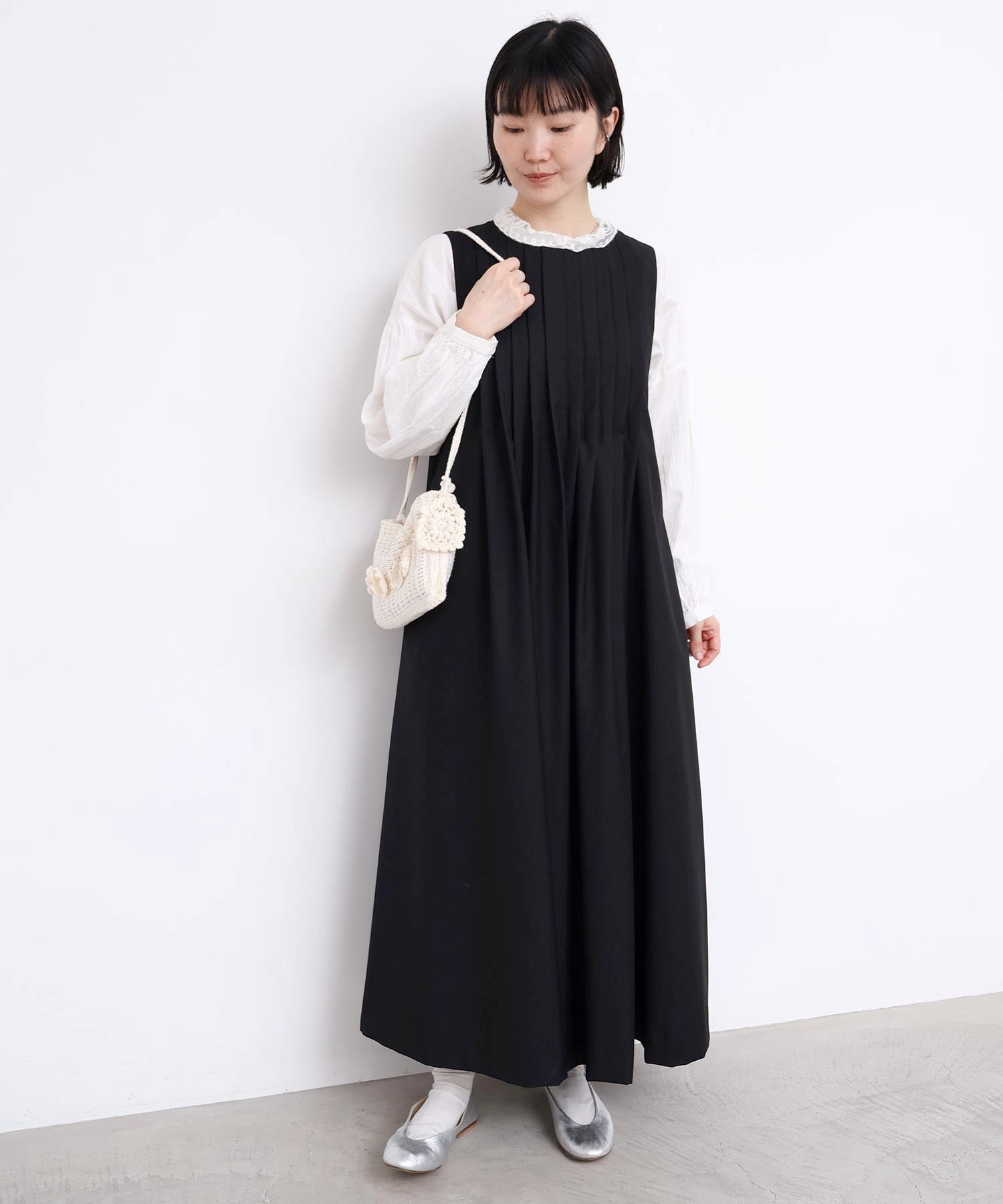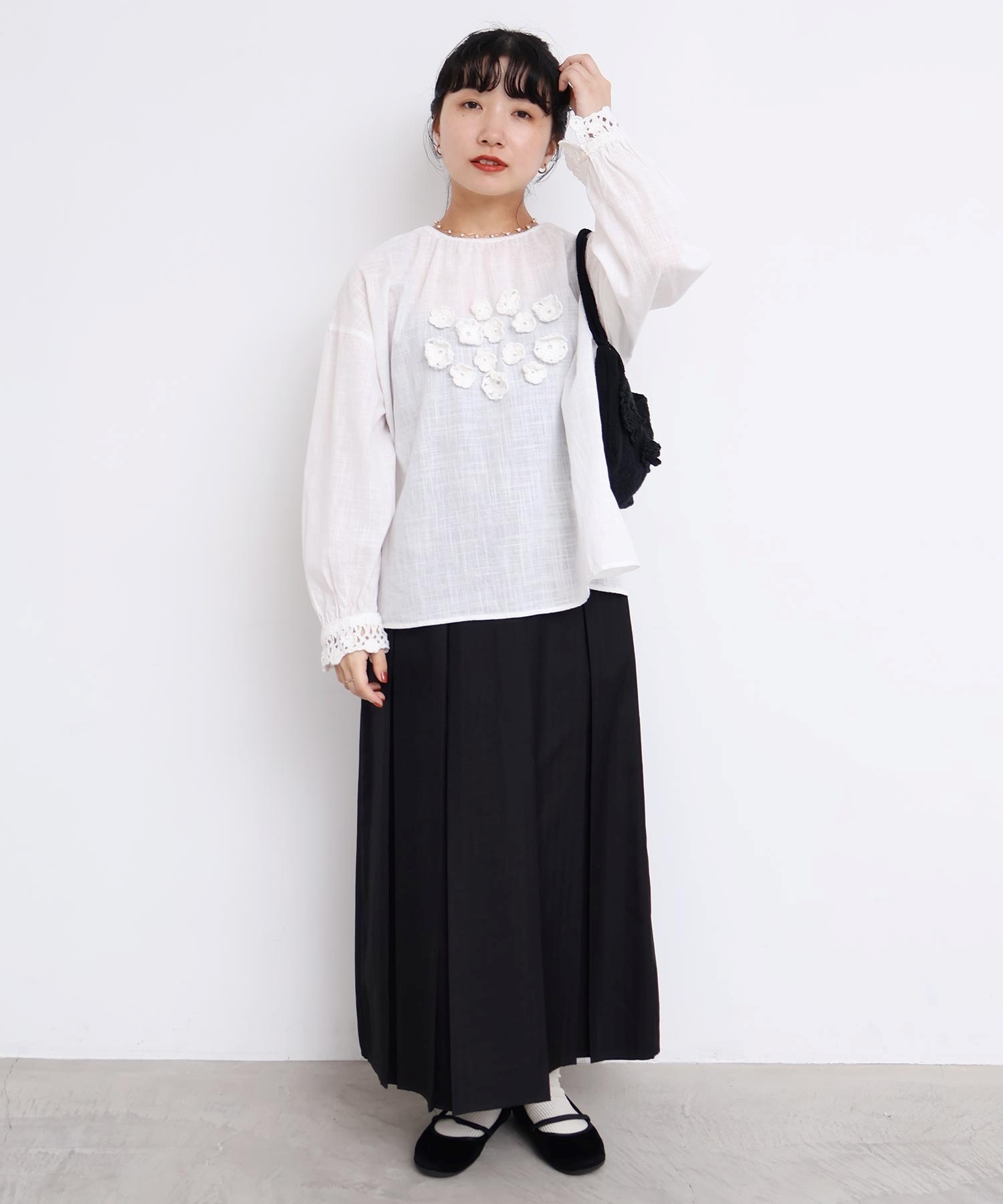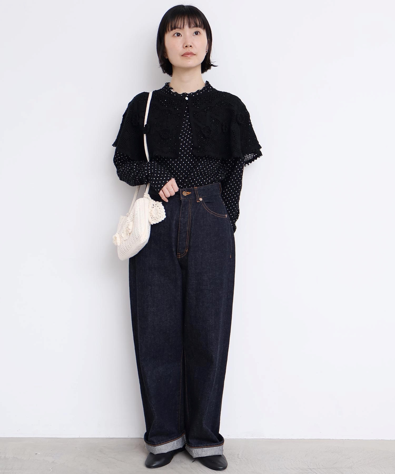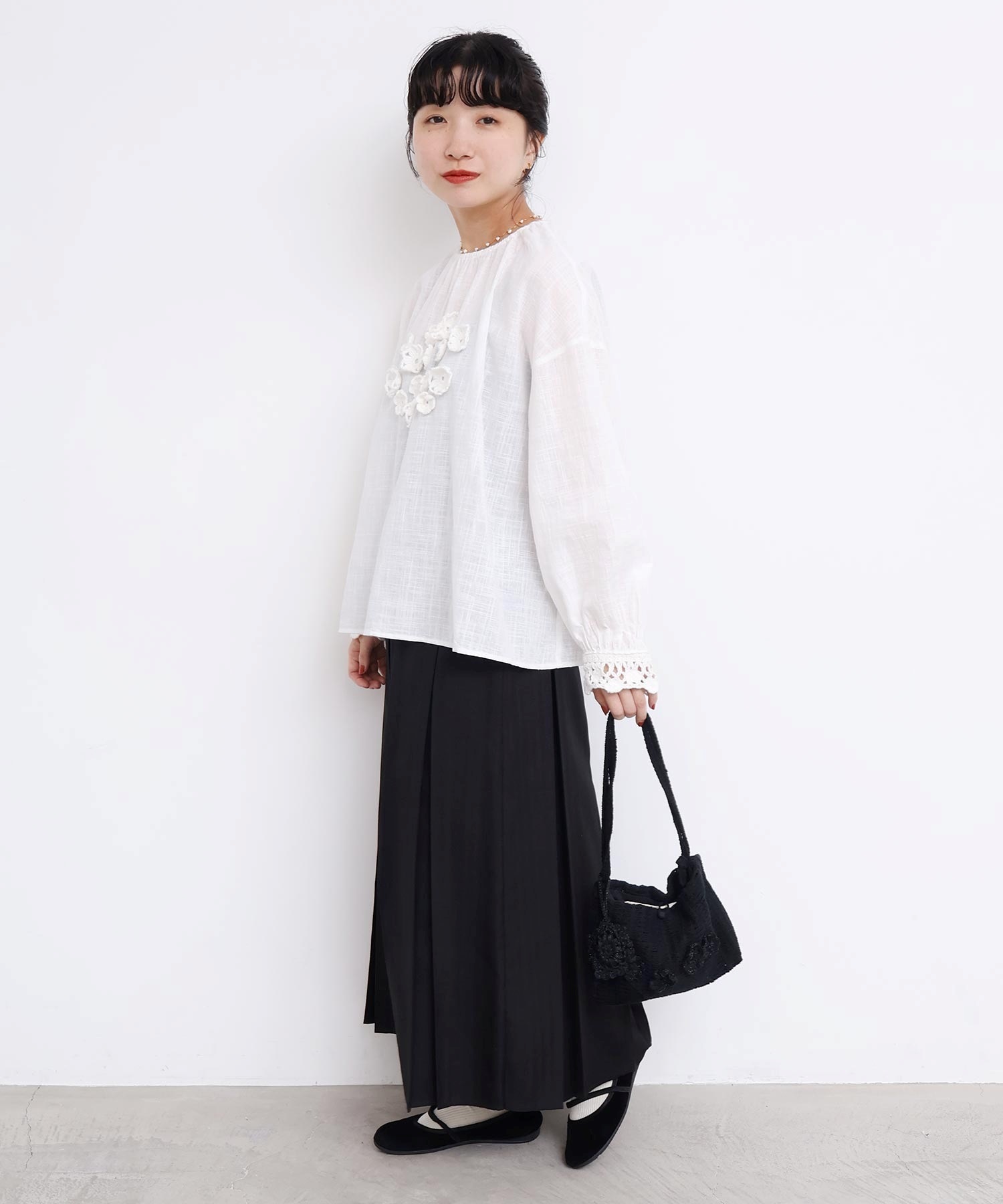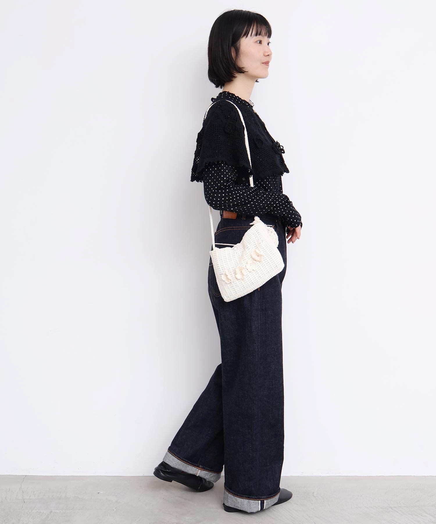 手編みのお花モチーフがついたハンドメイドのようなミニバッグ。