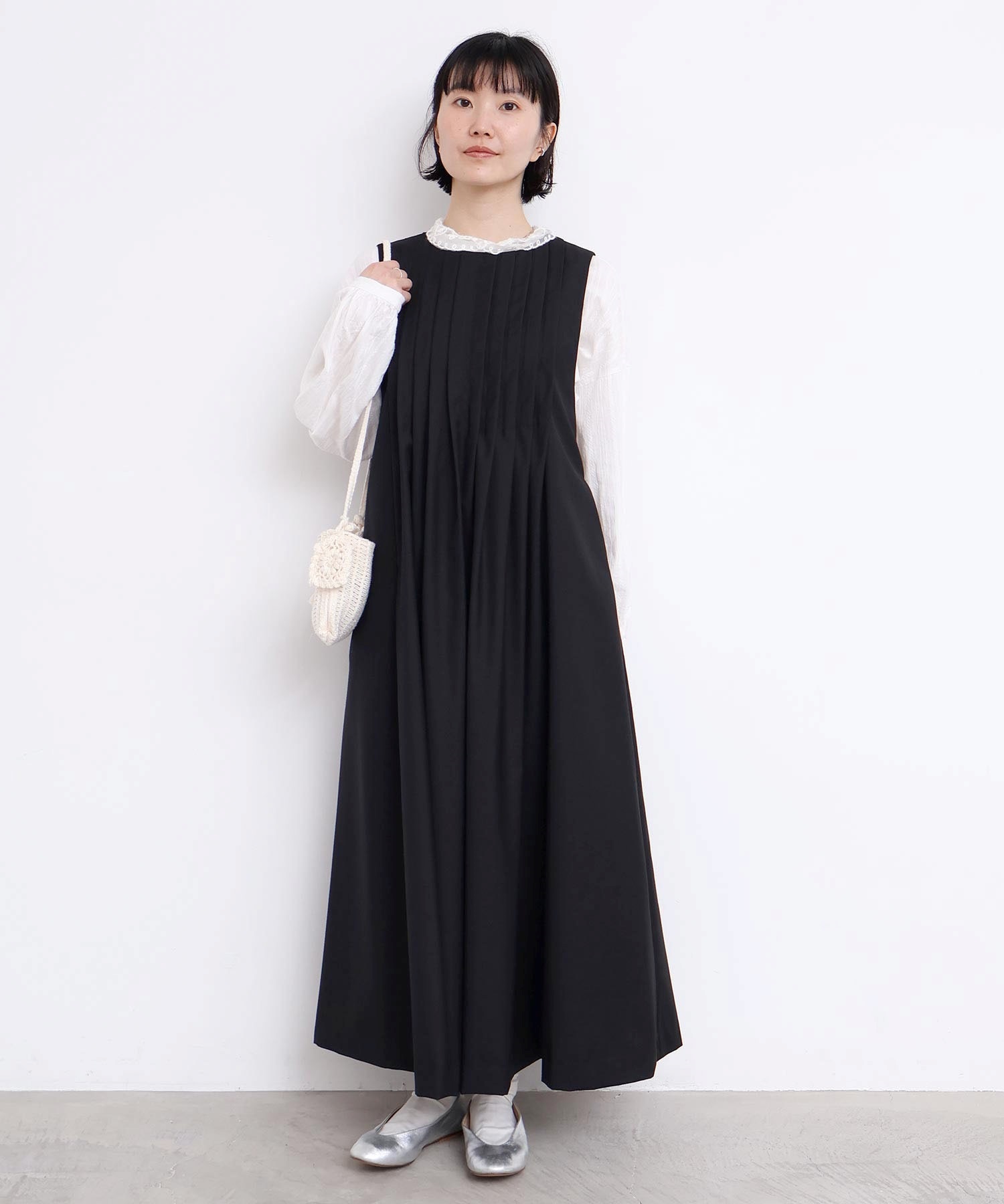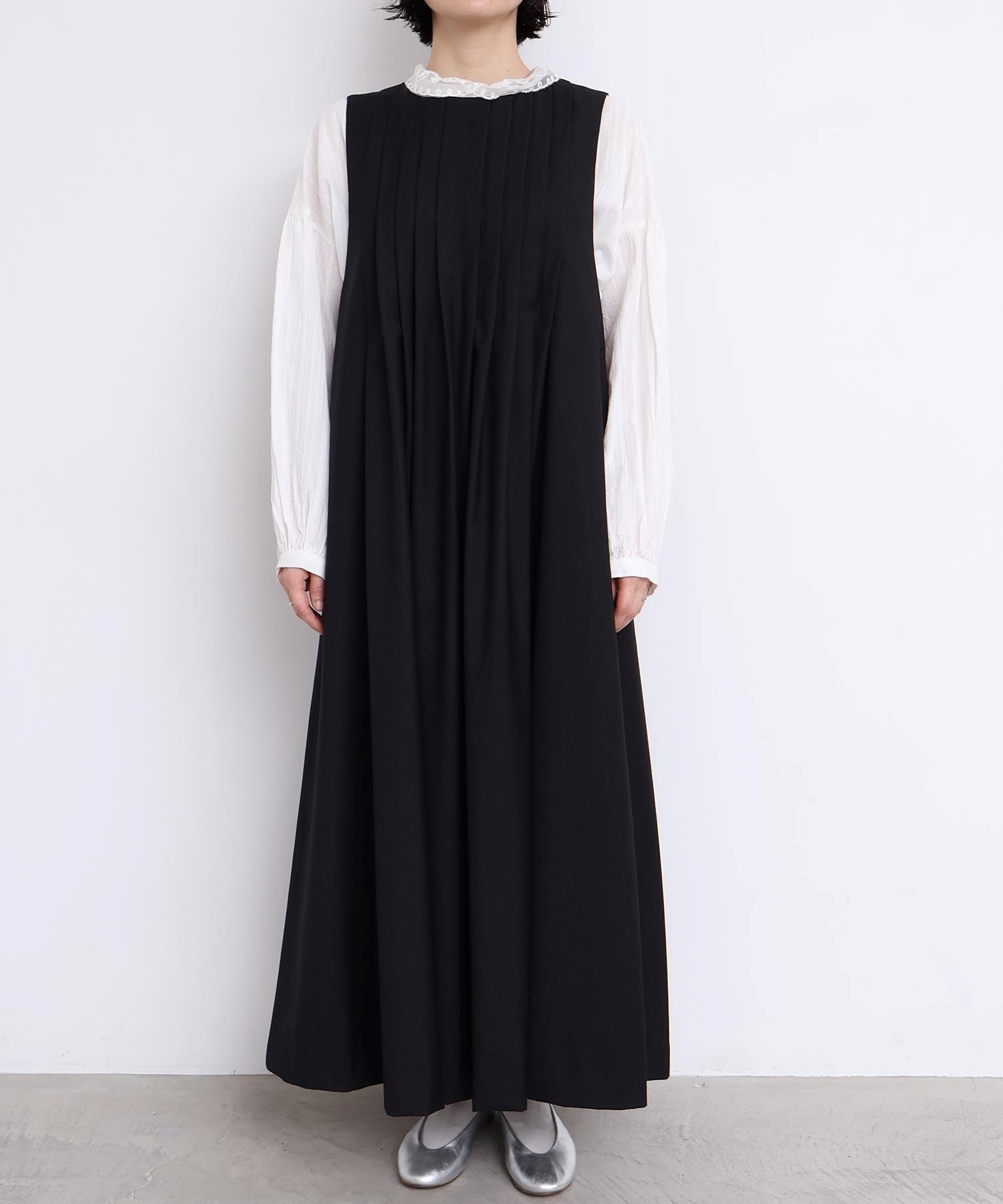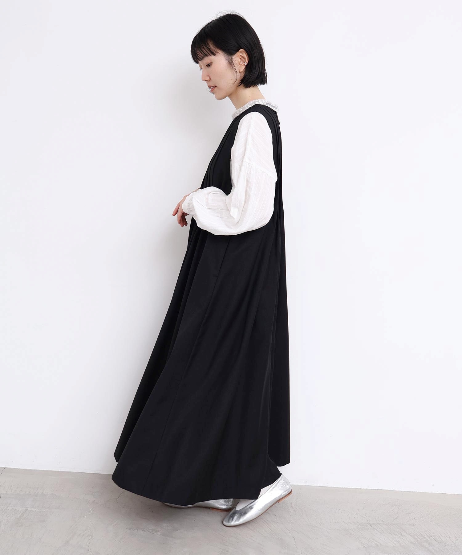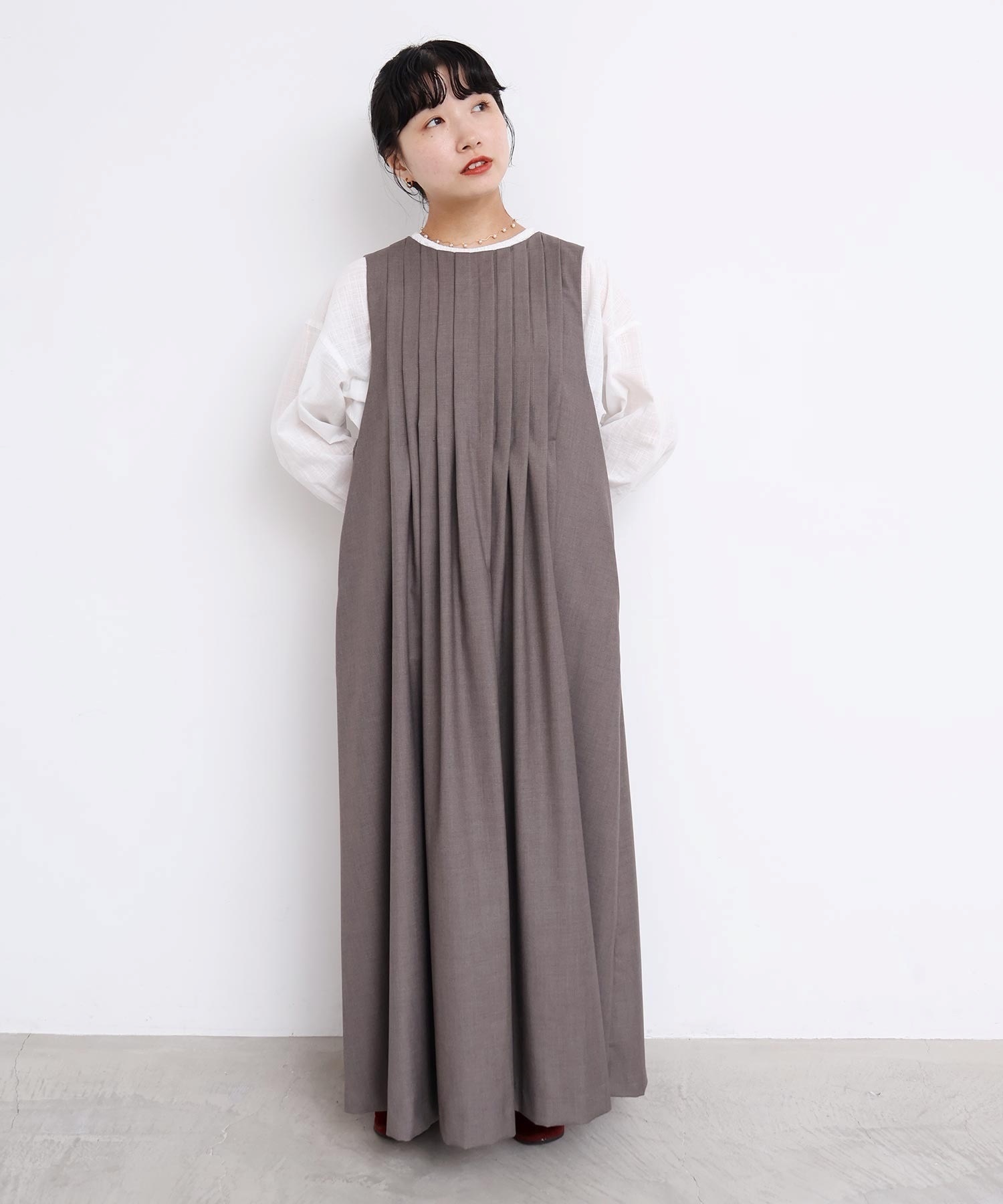 ぜいたくなタックのデザインでシルエットを出したワンピース。