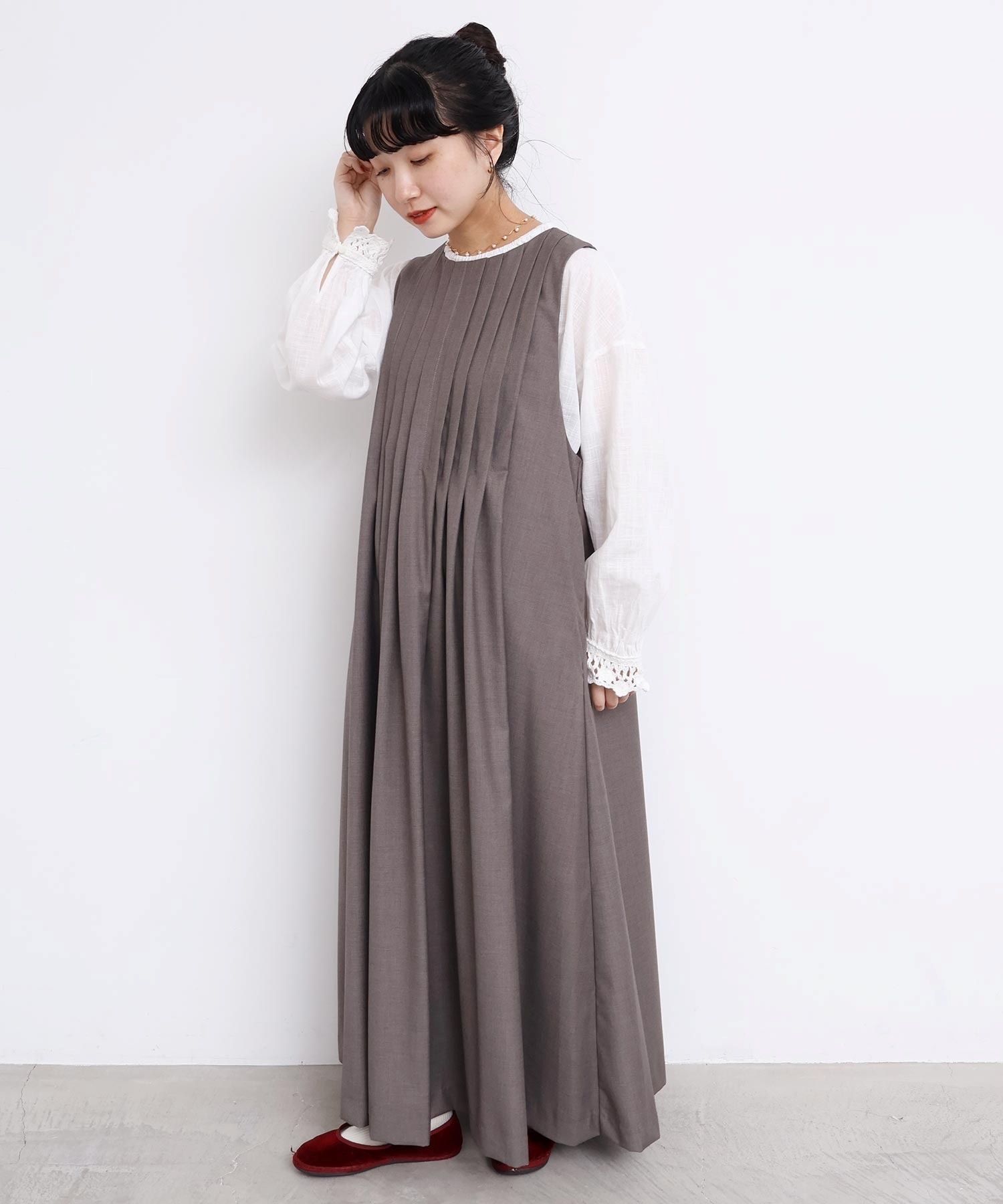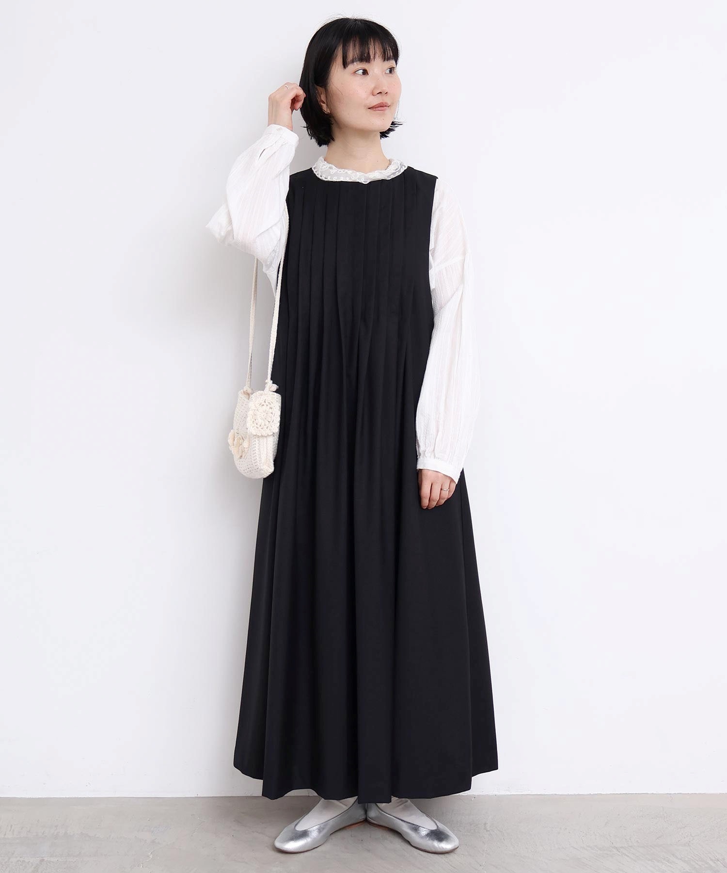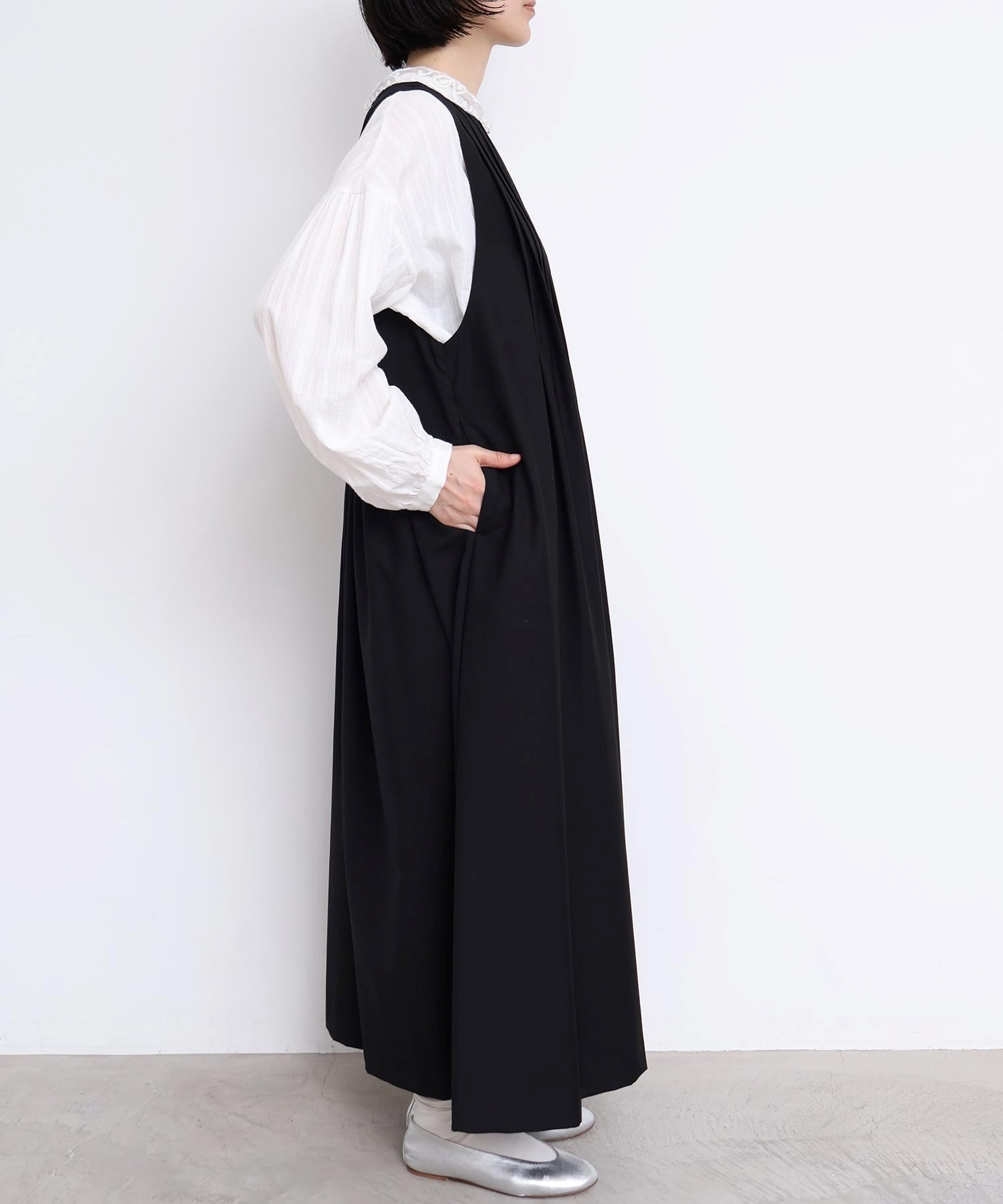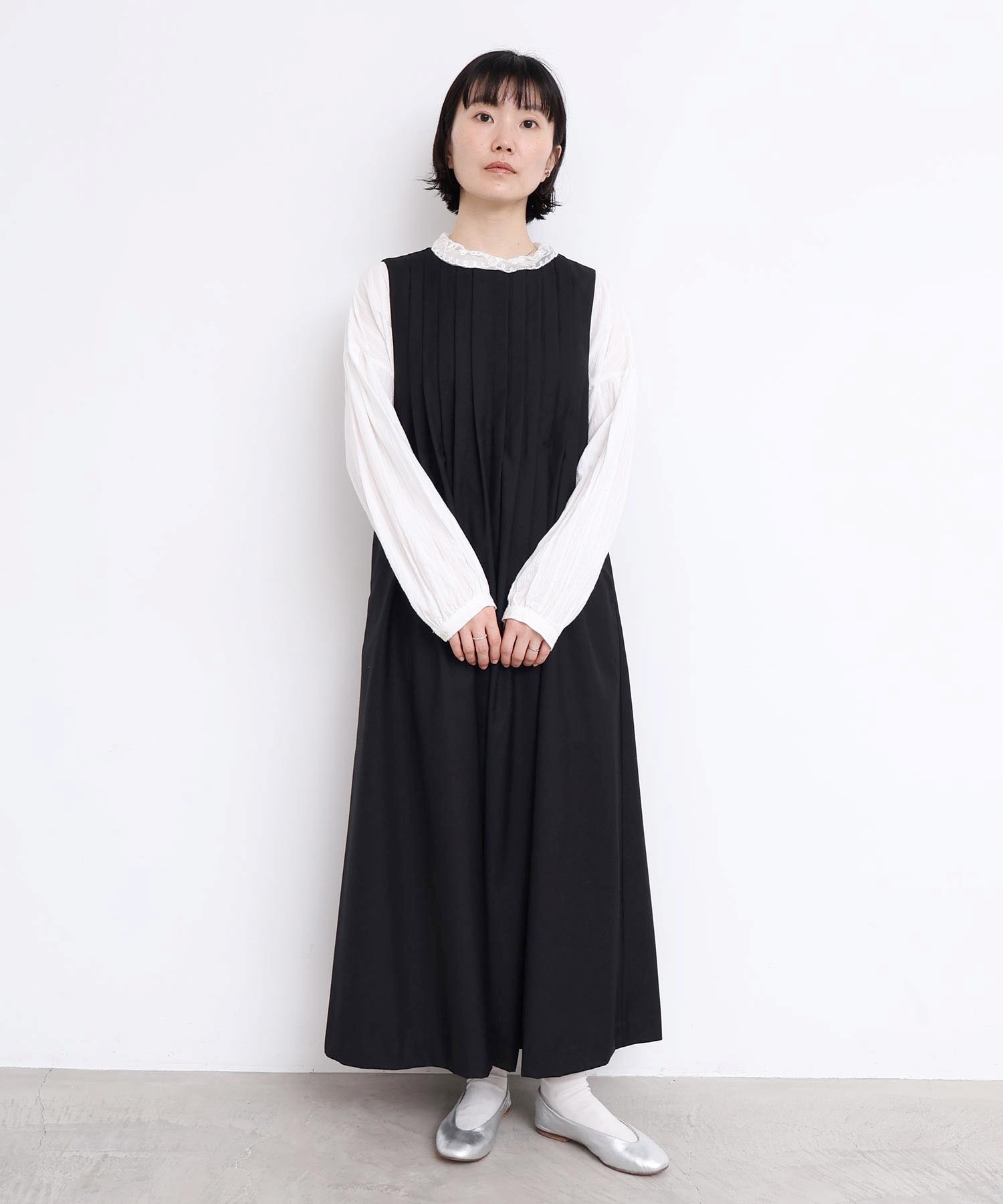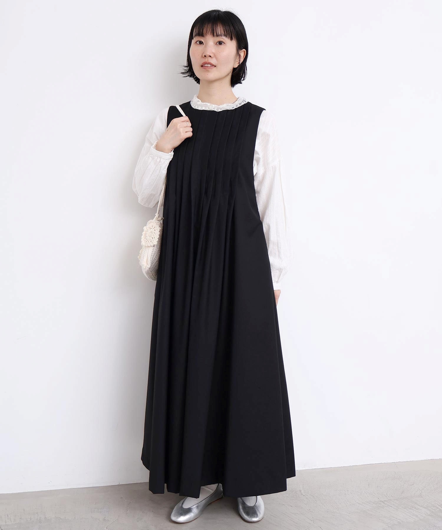 ぜいたくなタックのデザインでシルエットを出したワンピース。