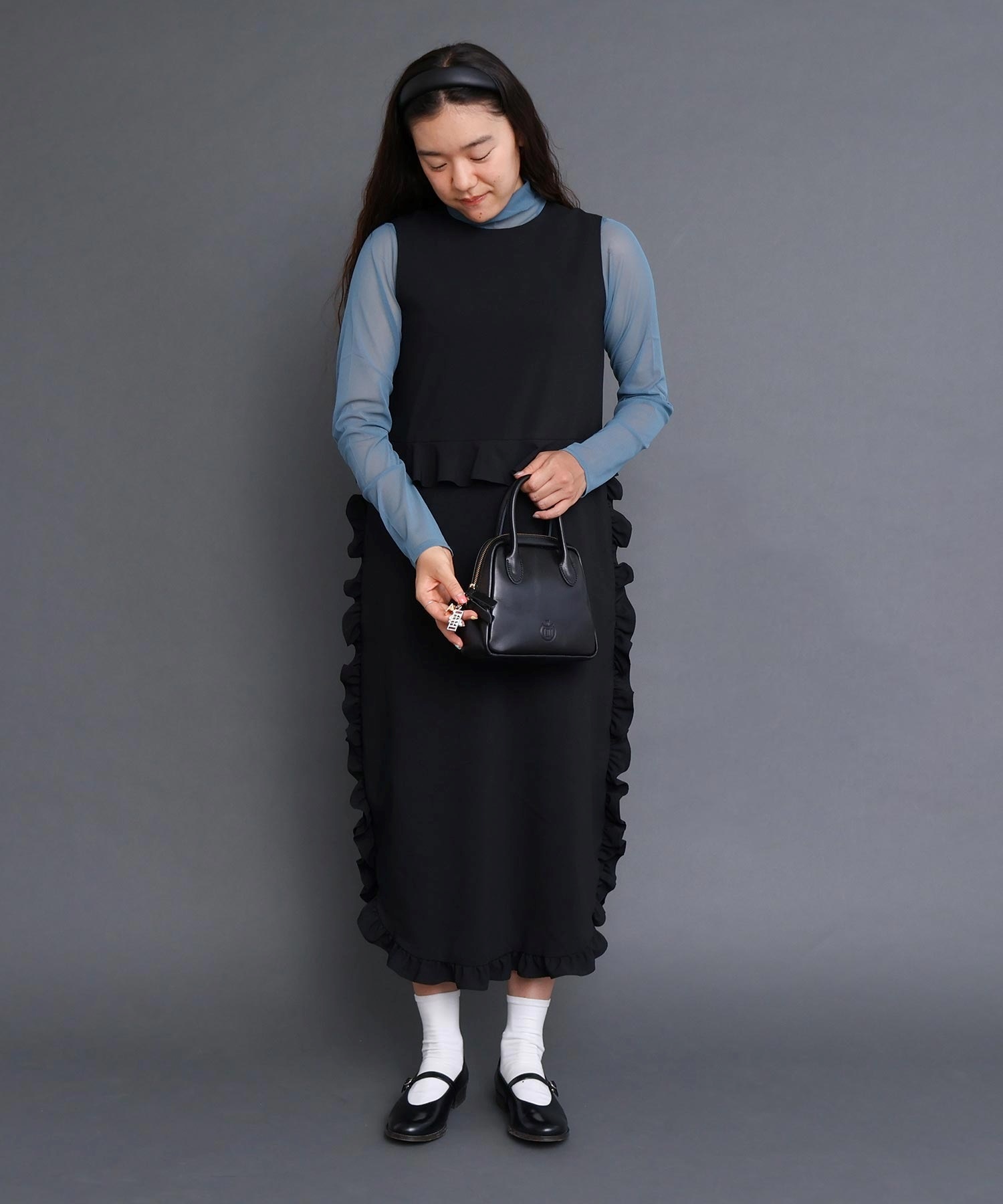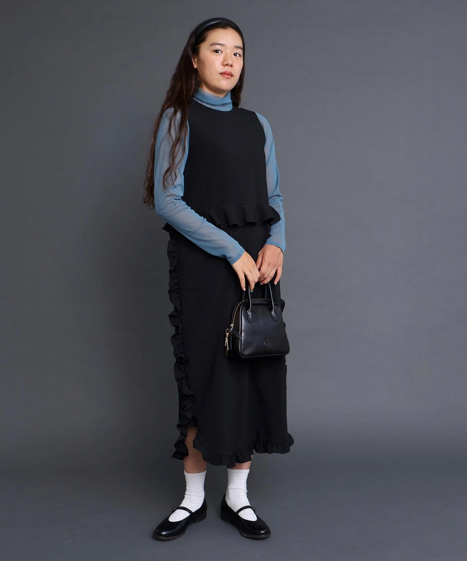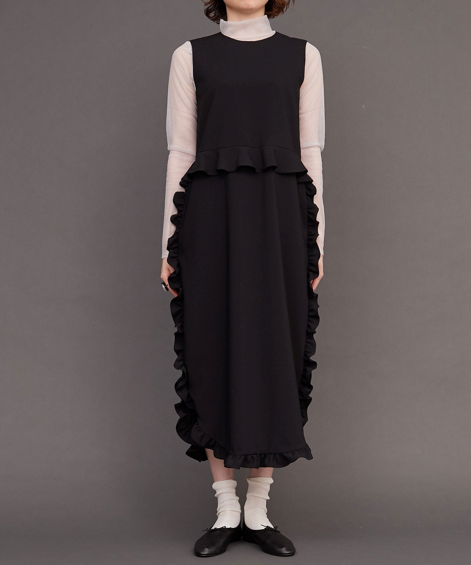 貝がらのような裾のフリルと腰のペプラムがポイントのワンピース。