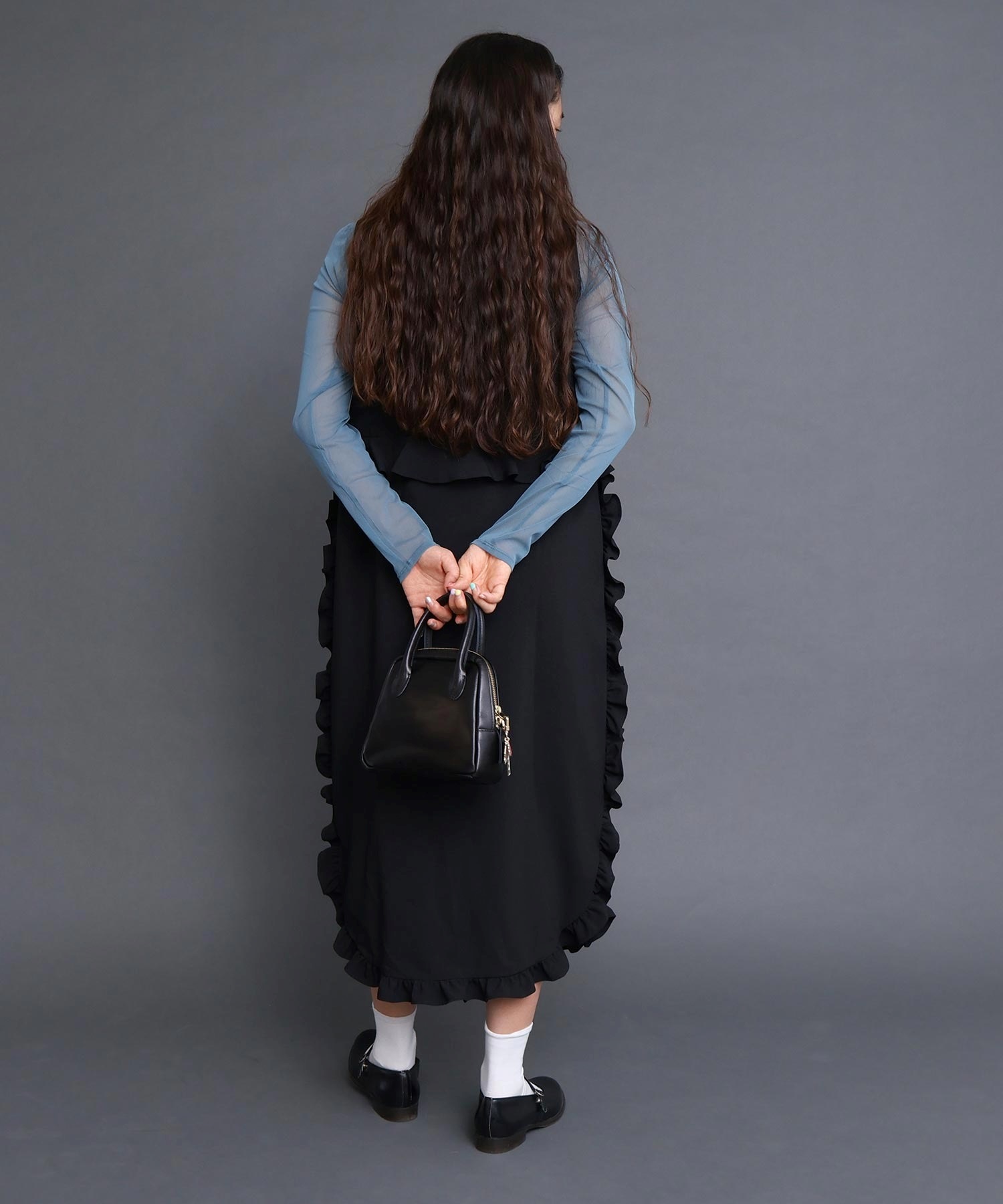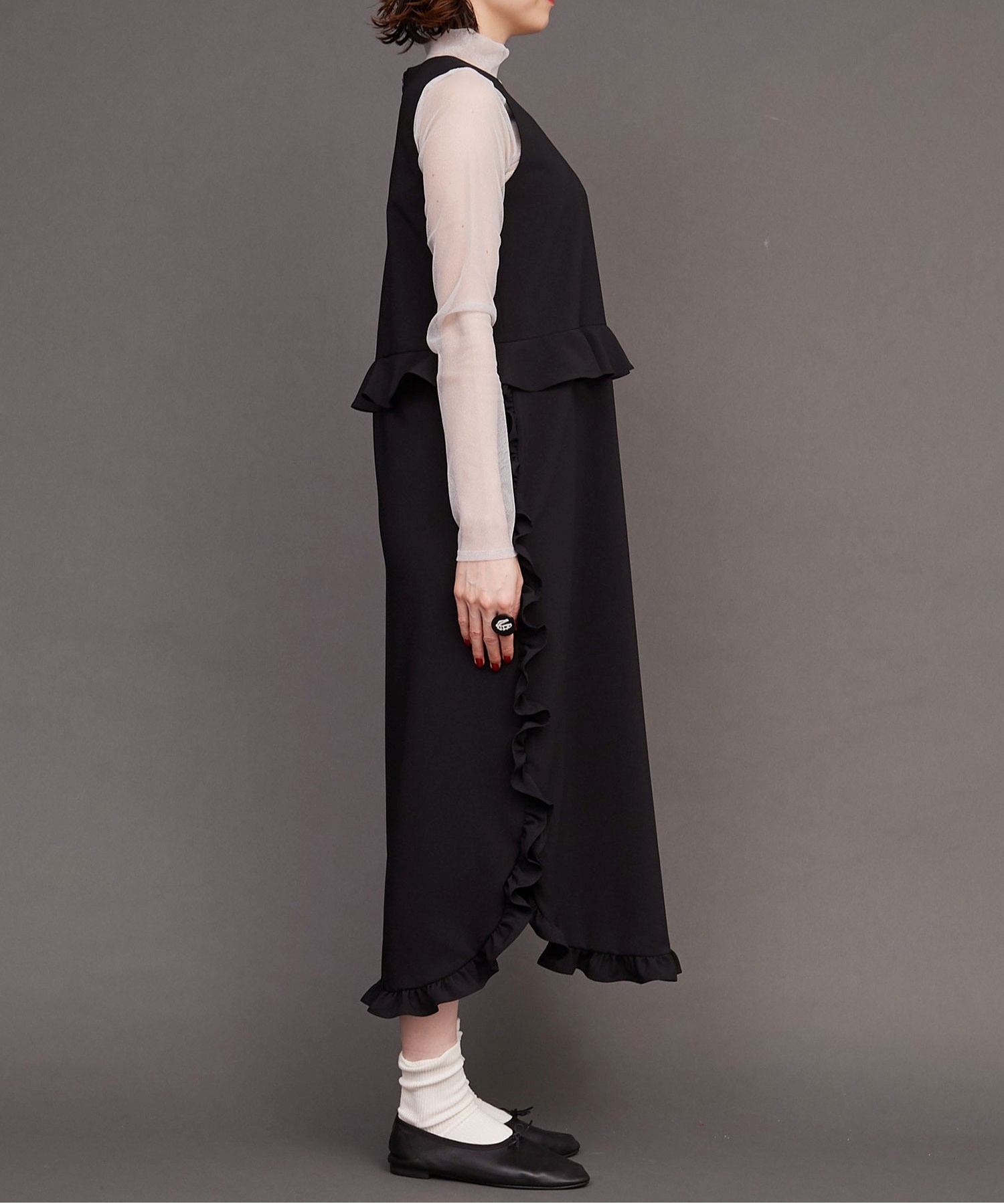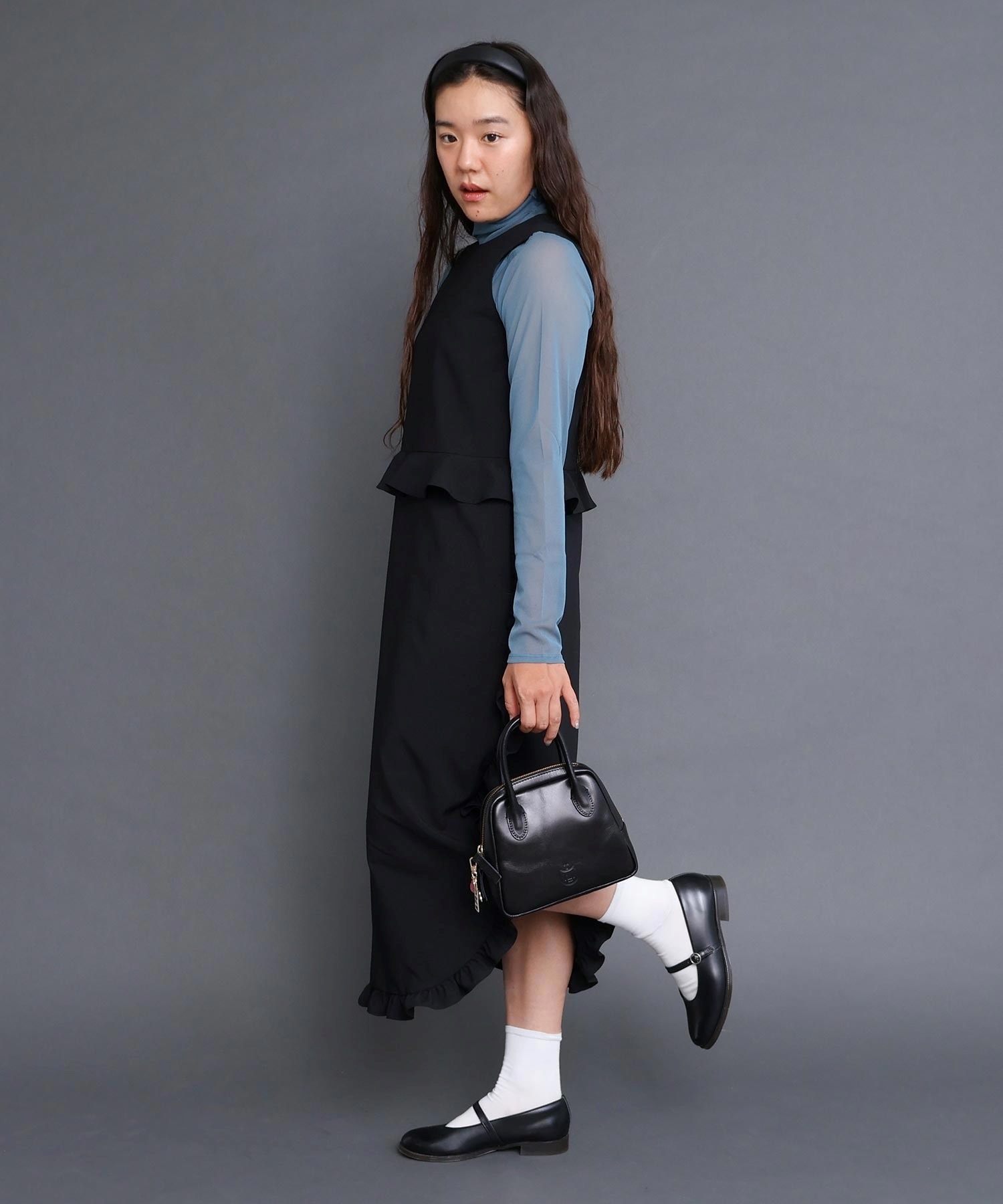 貝がらのような裾のフリルと腰のペプラムがポイントのワンピース。