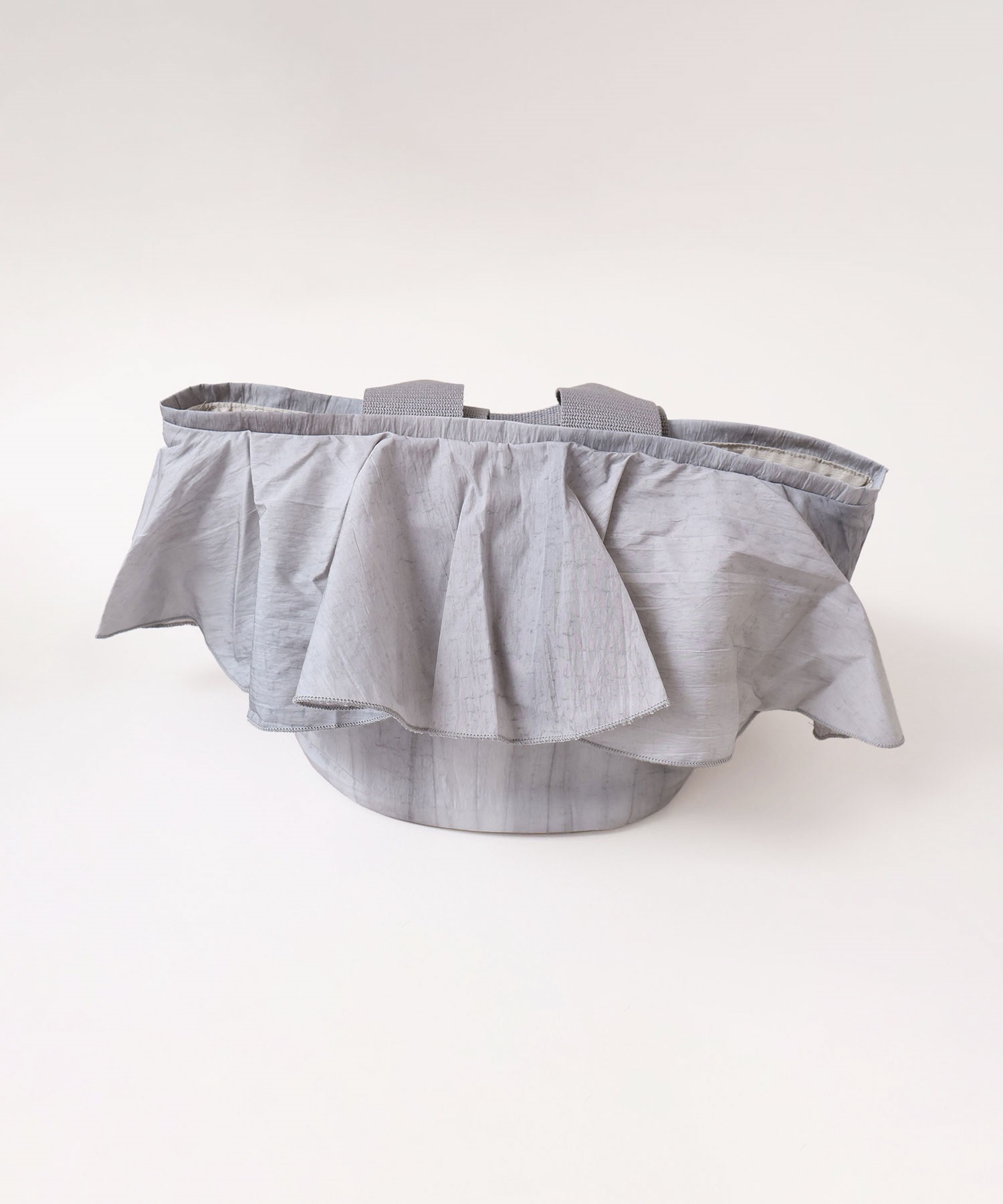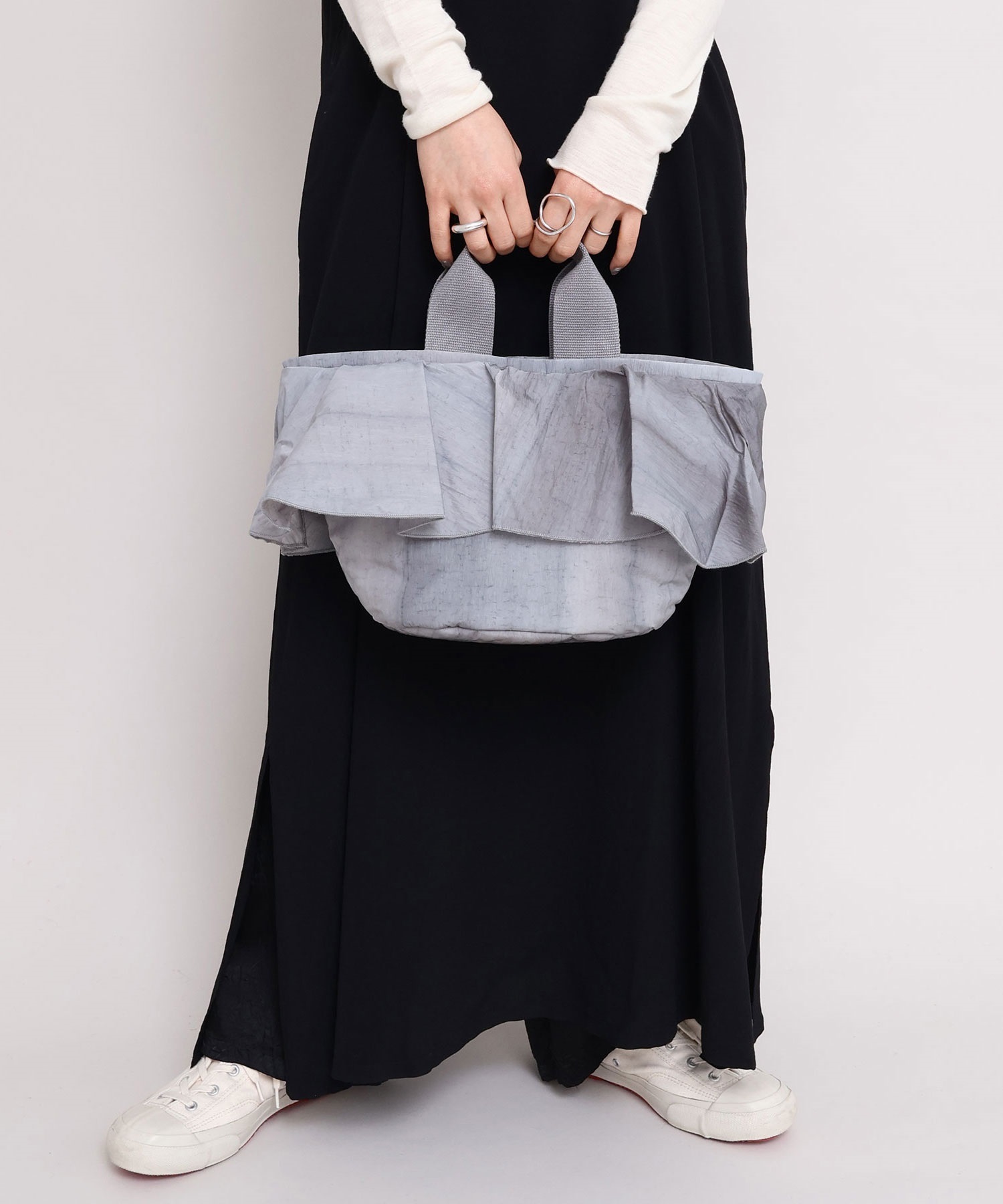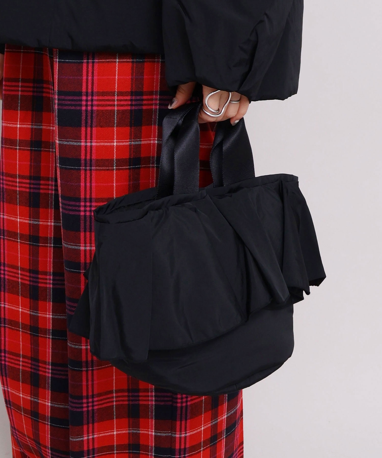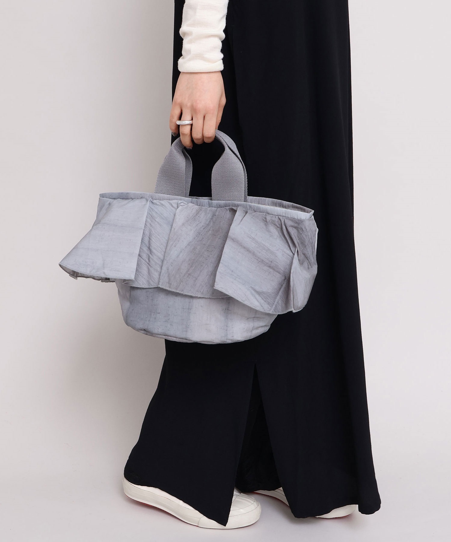 高密度ナイロンを使用したたっぷりボリュームのラッフルデザインバッグ。
