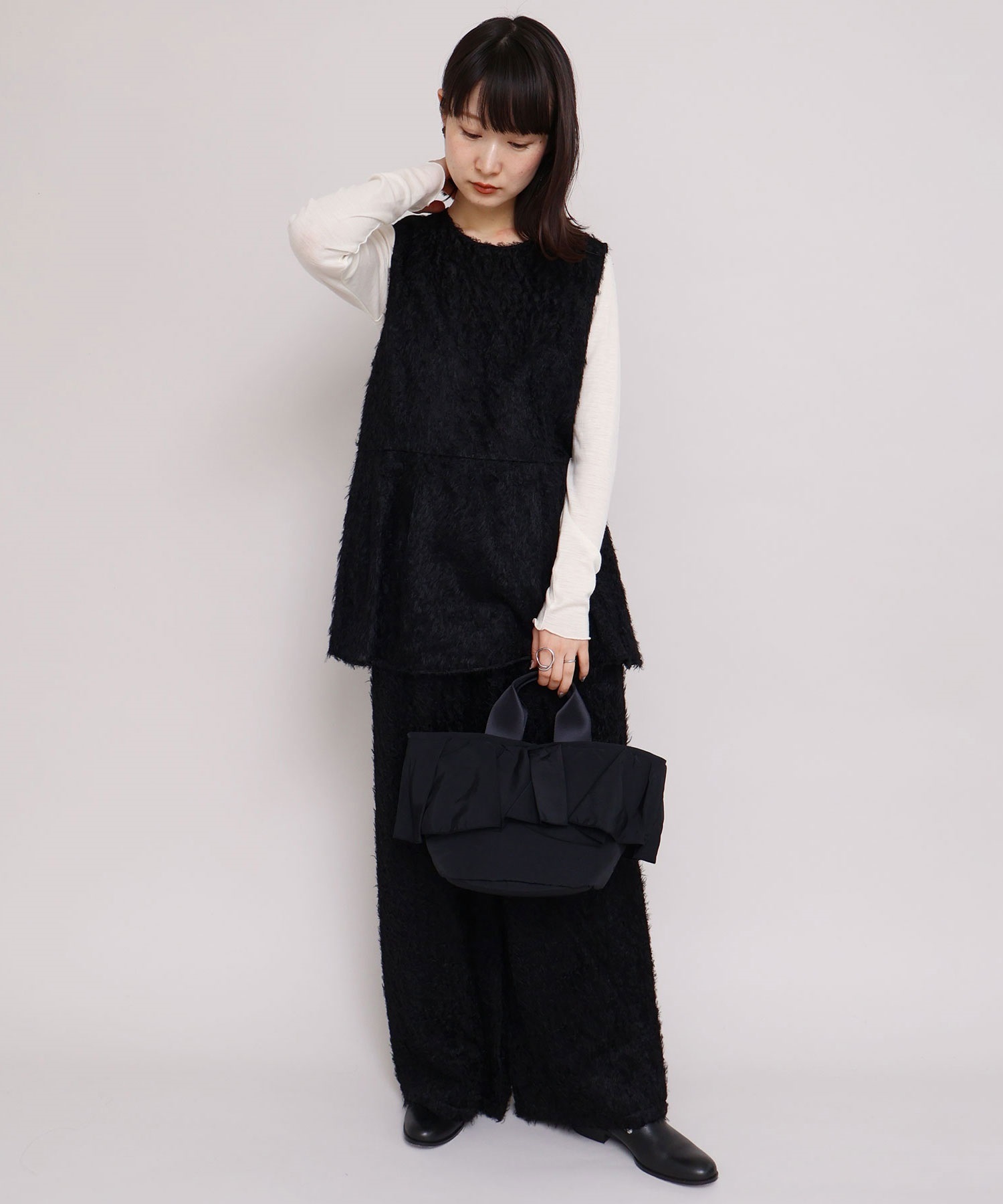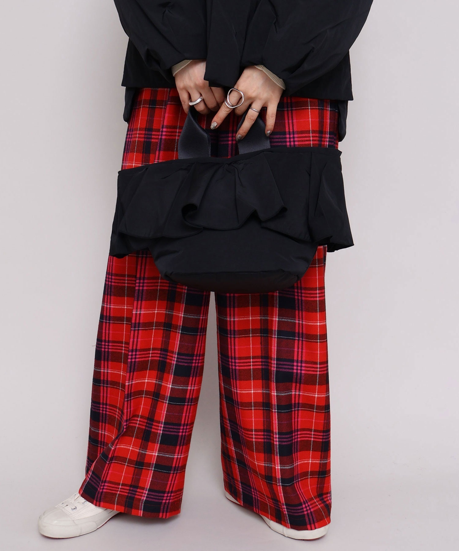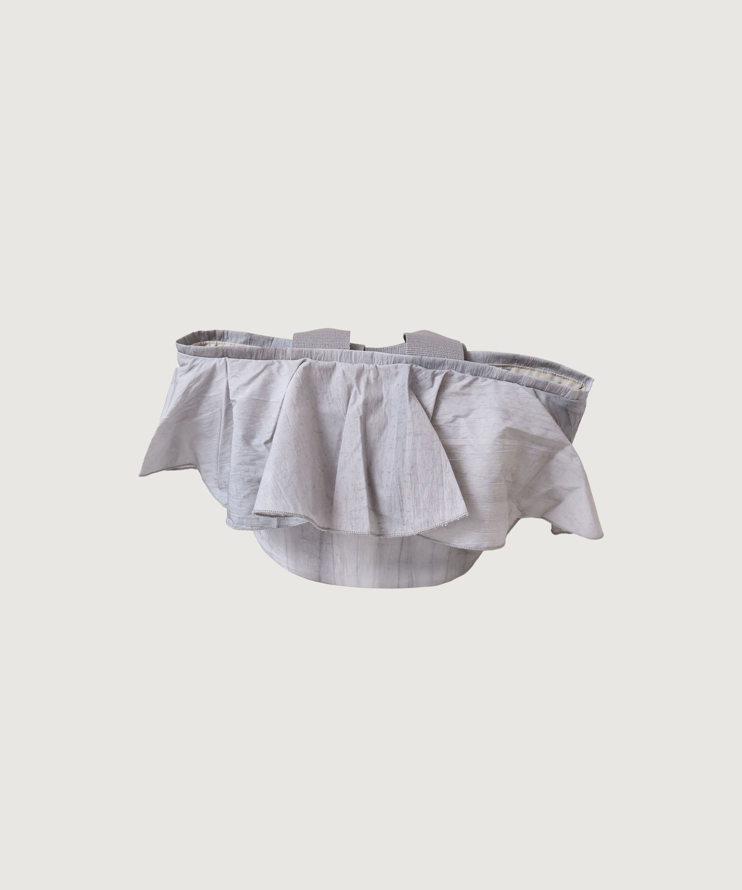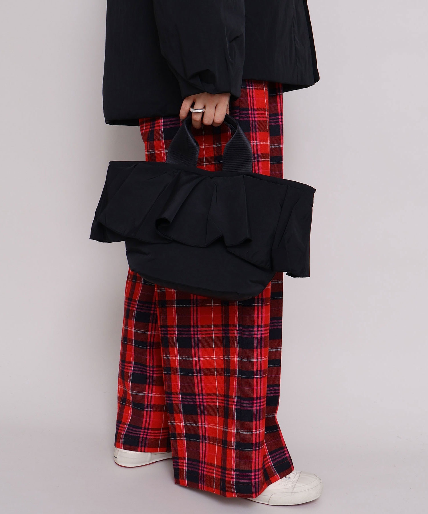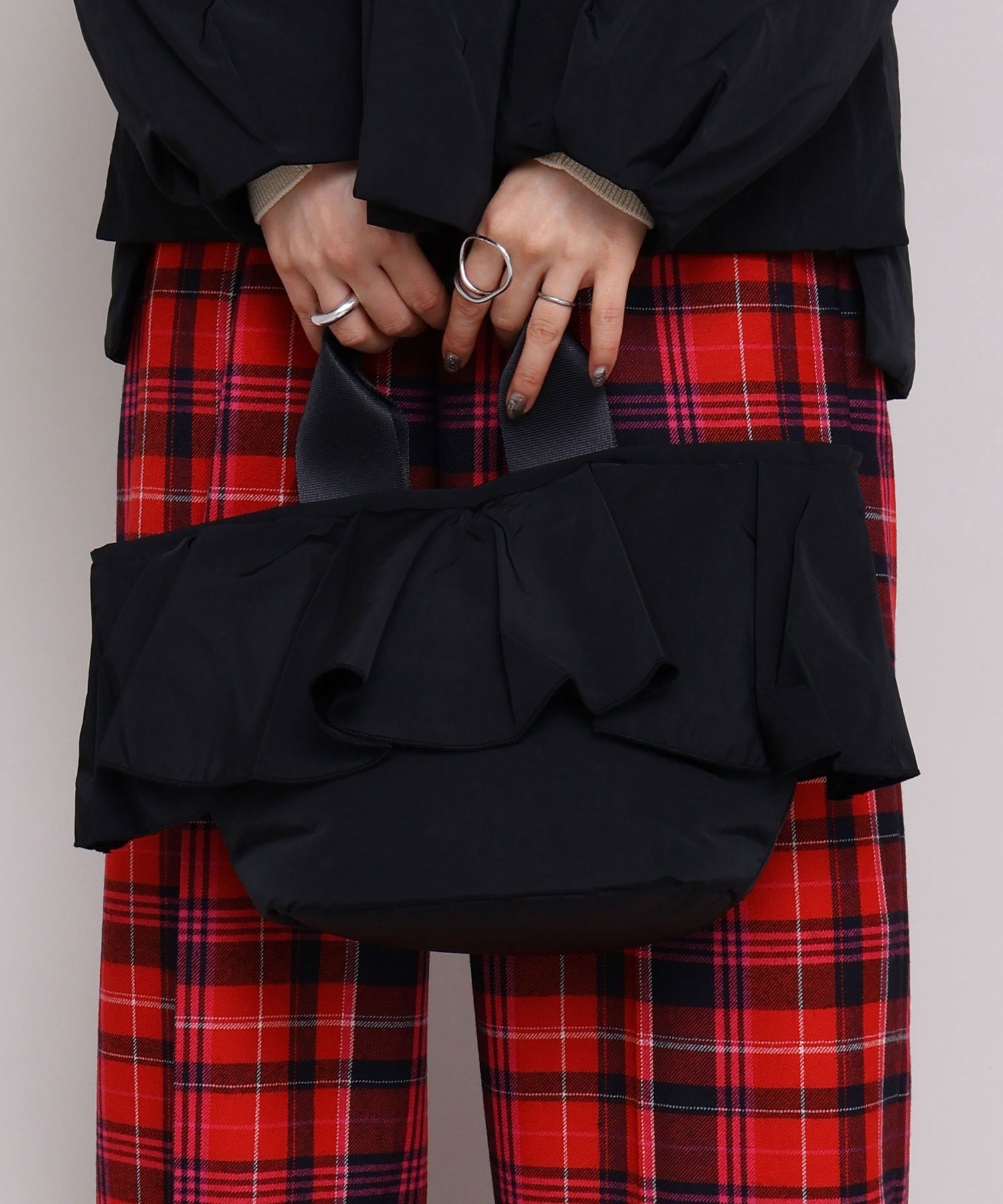 高密度ナイロンを使用したたっぷりボリュームのラッフルデザインバッグ。