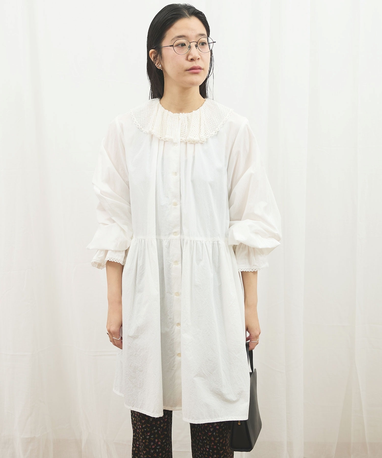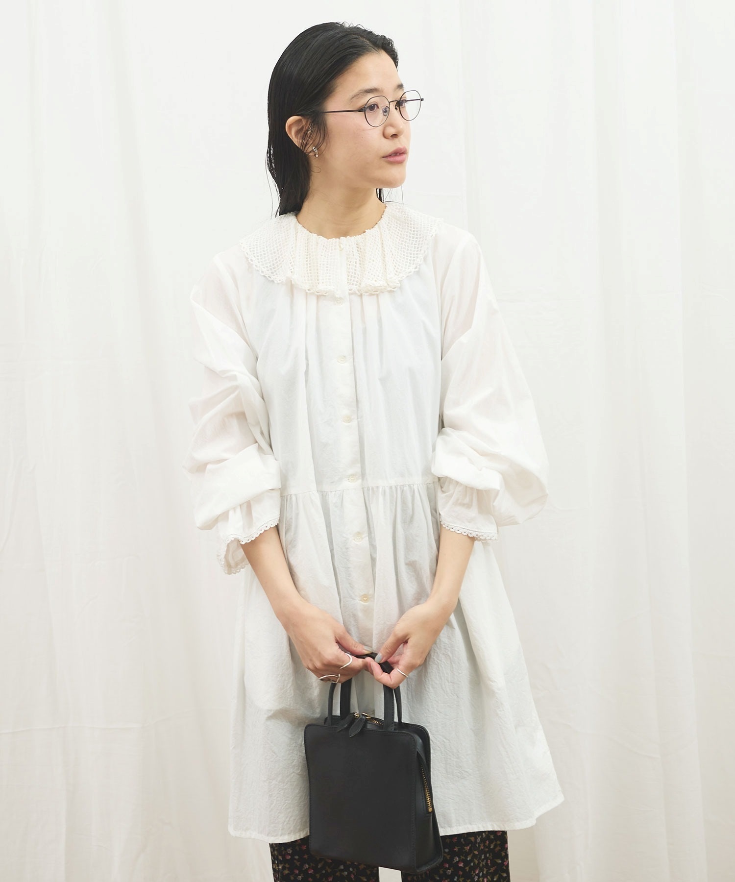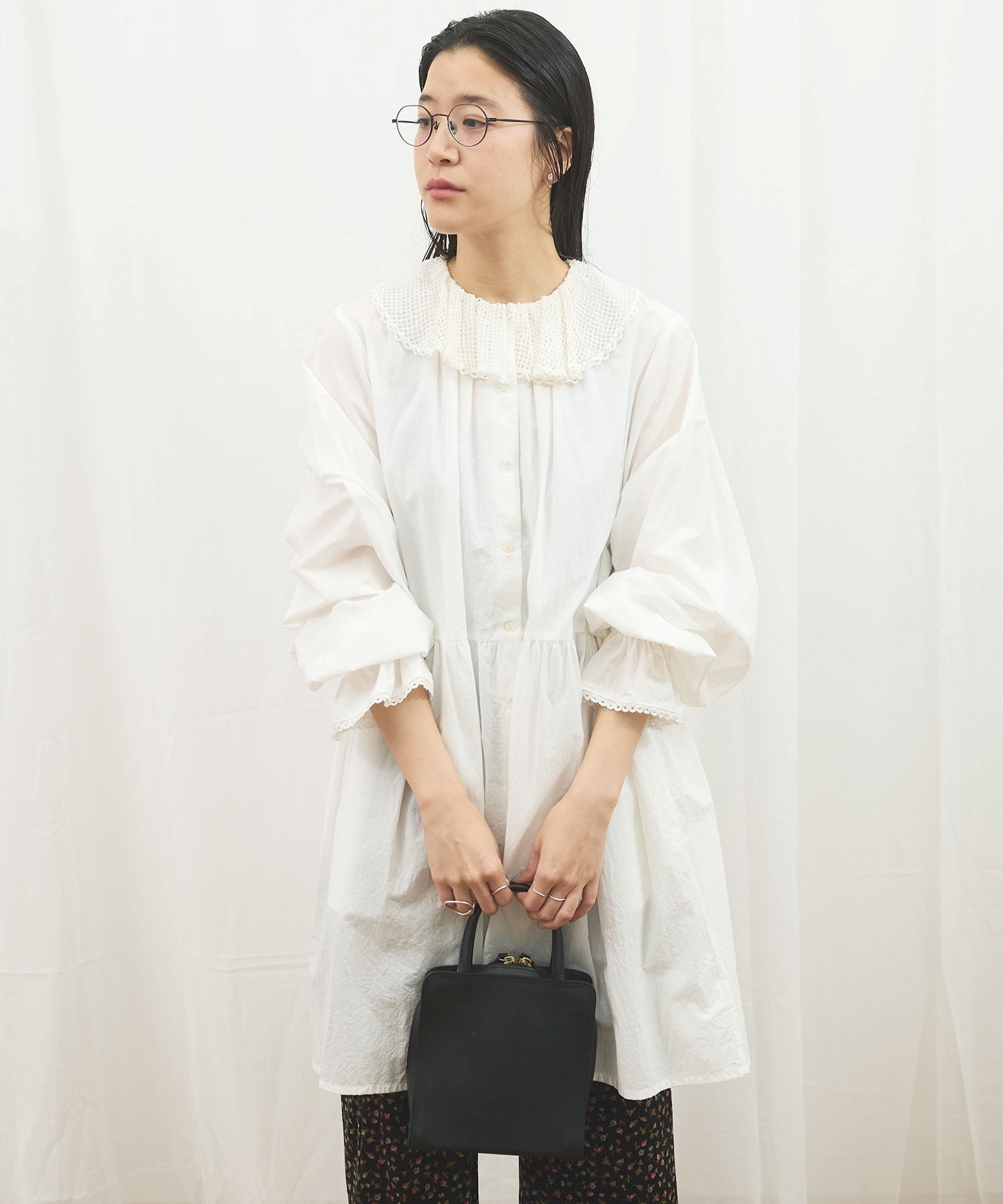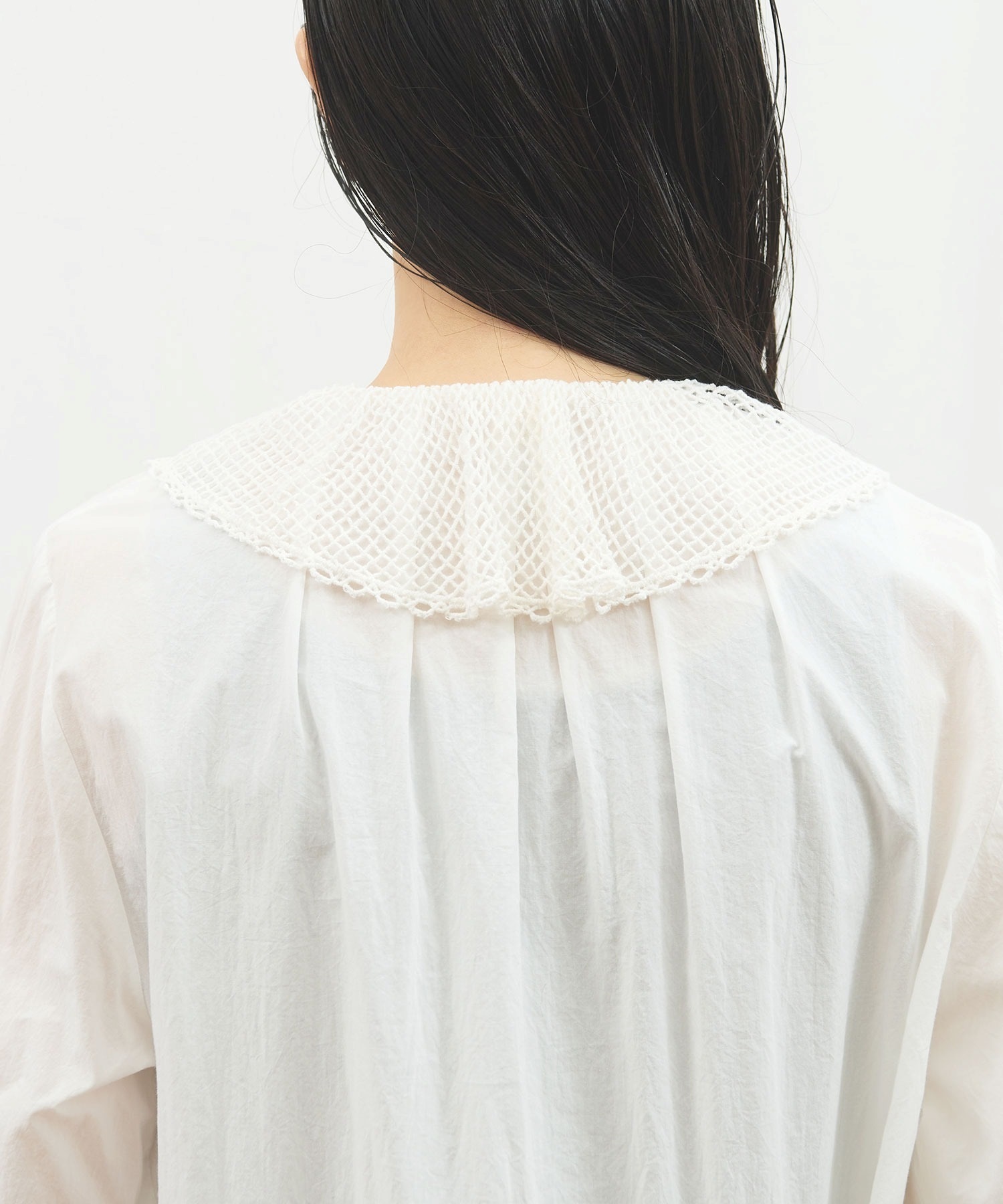 オリジナルで編み立てた格子柄のレースを衿にしたシリーズ。