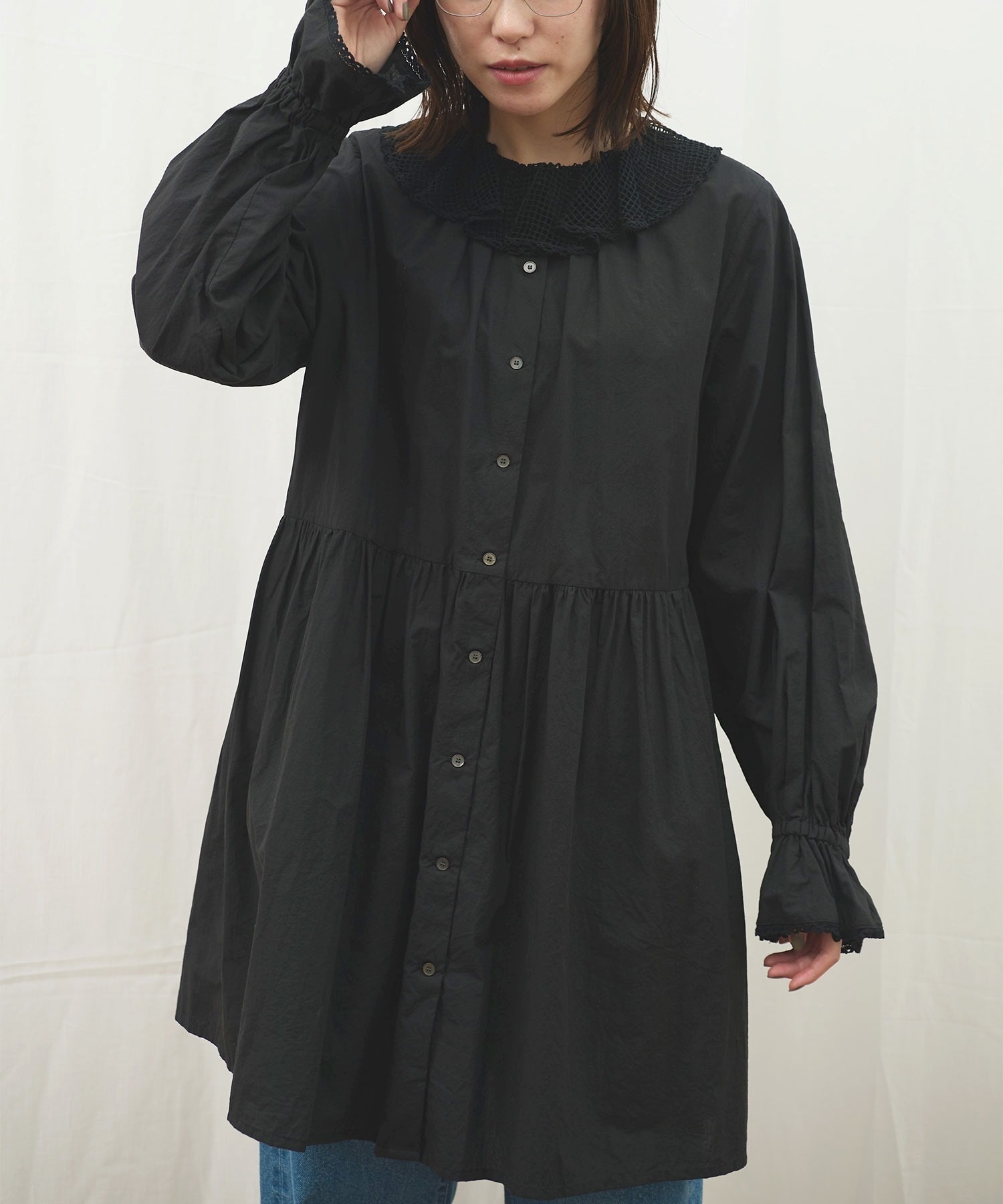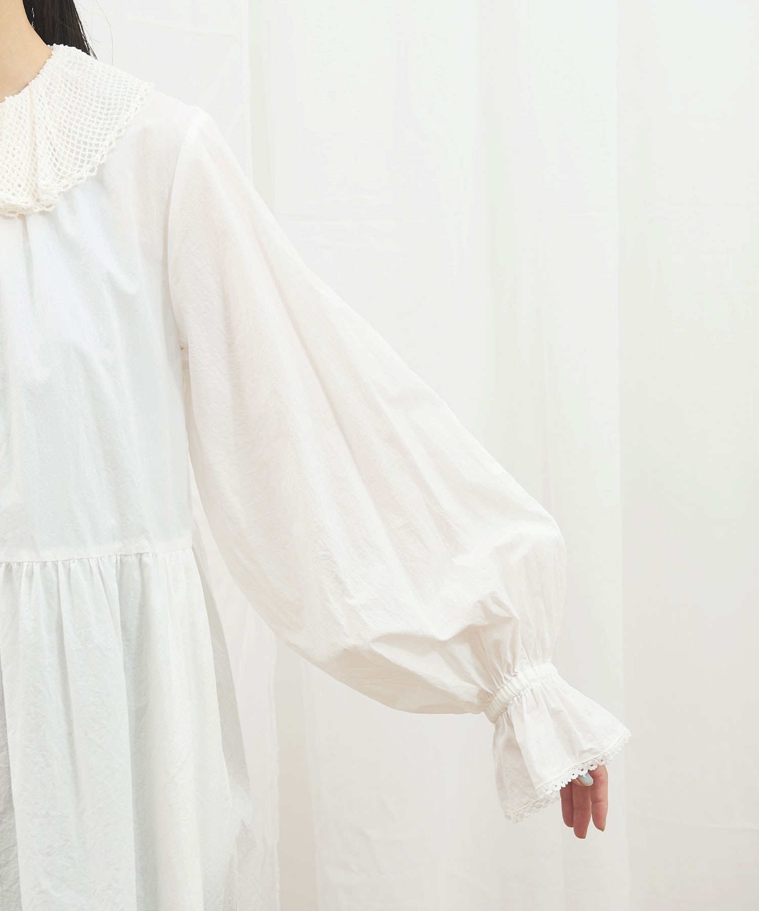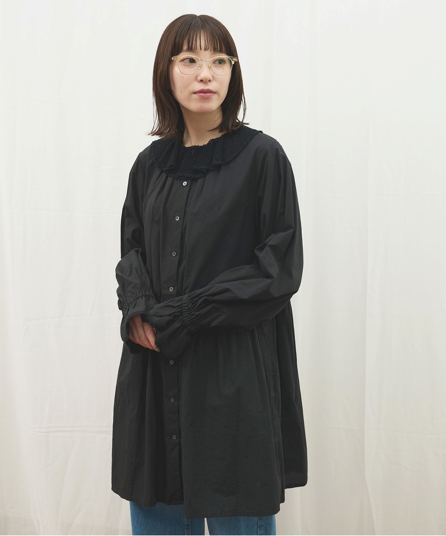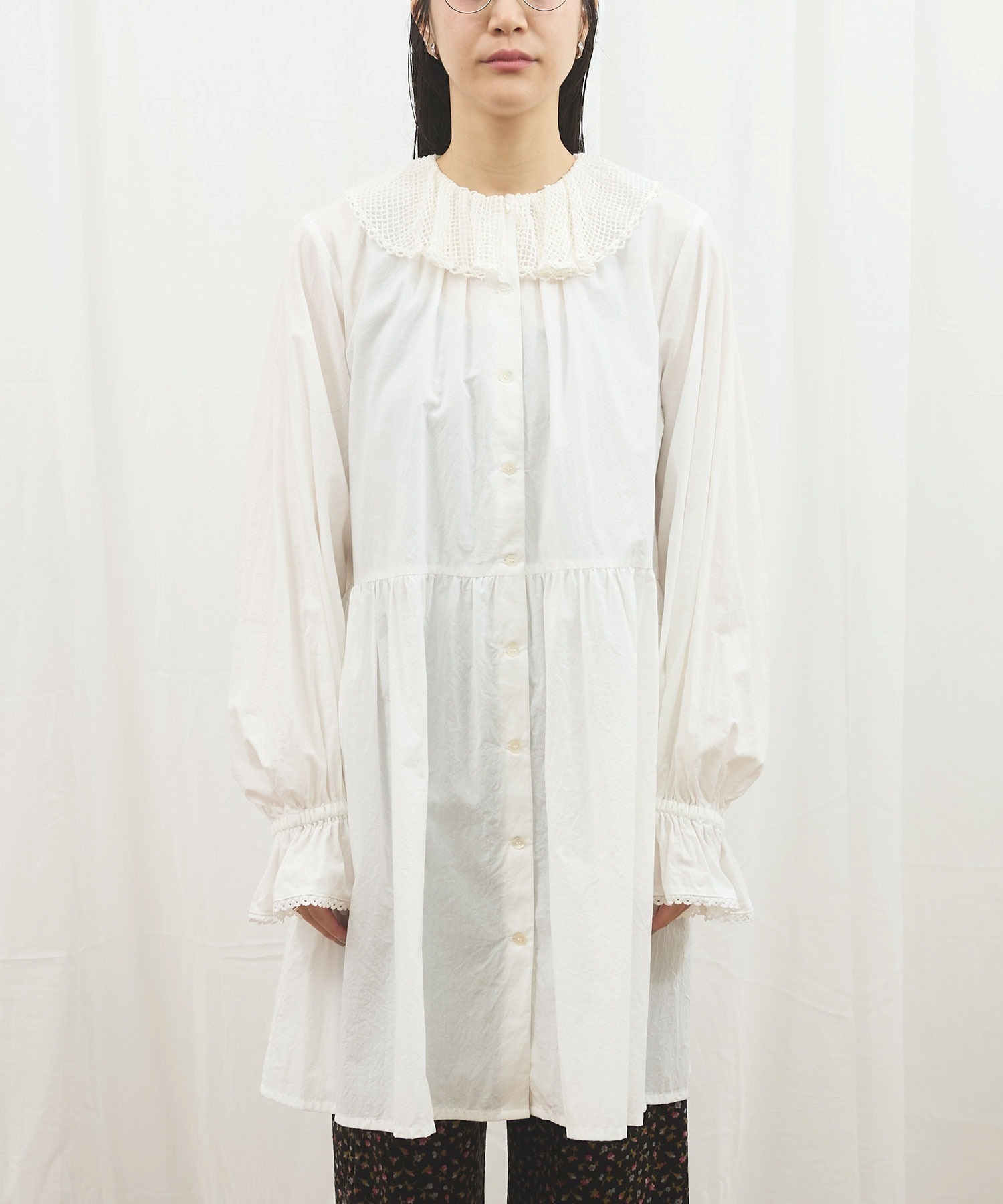 オリジナルで編み立てた格子柄のレースを衿にしたシリーズ。
