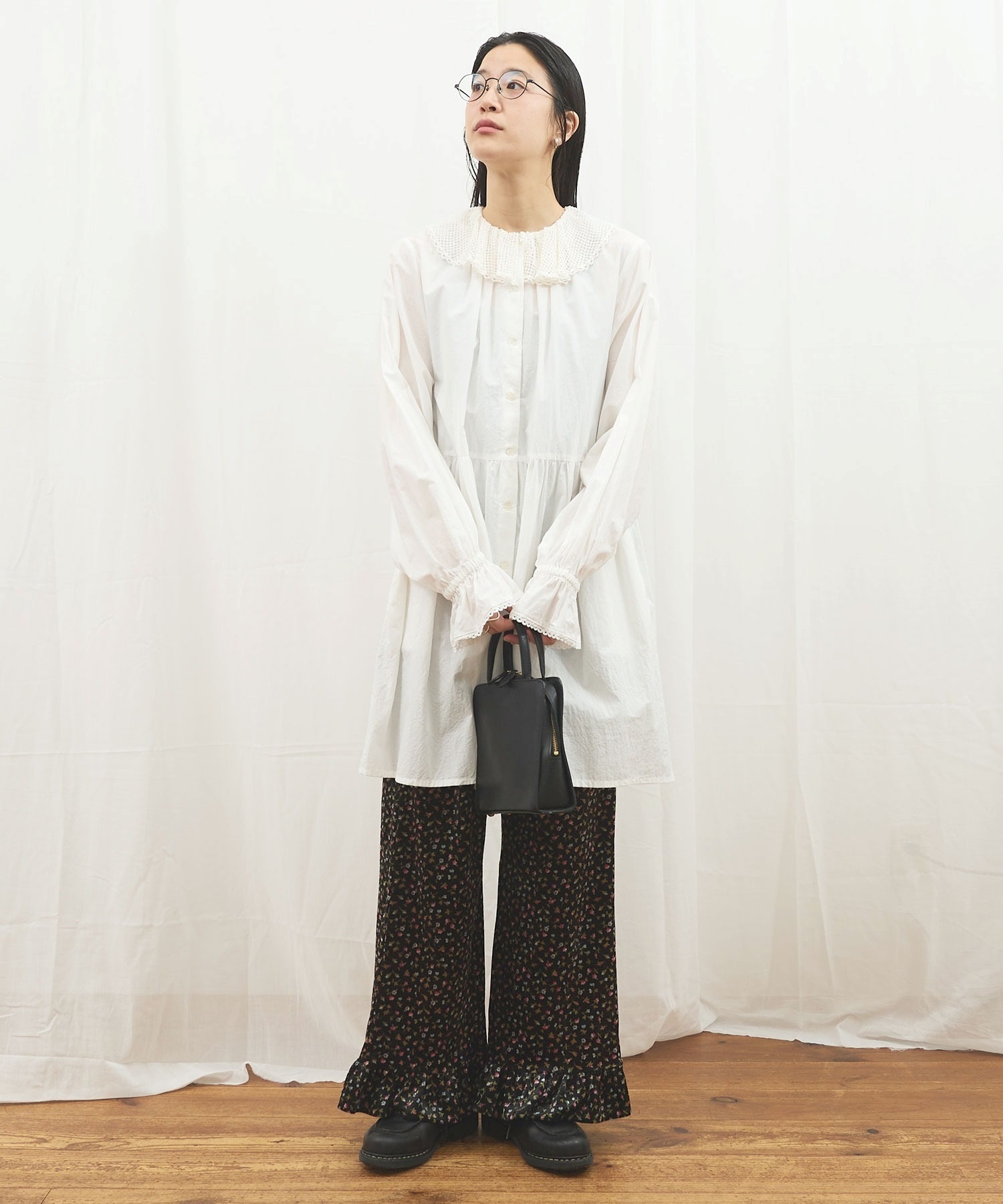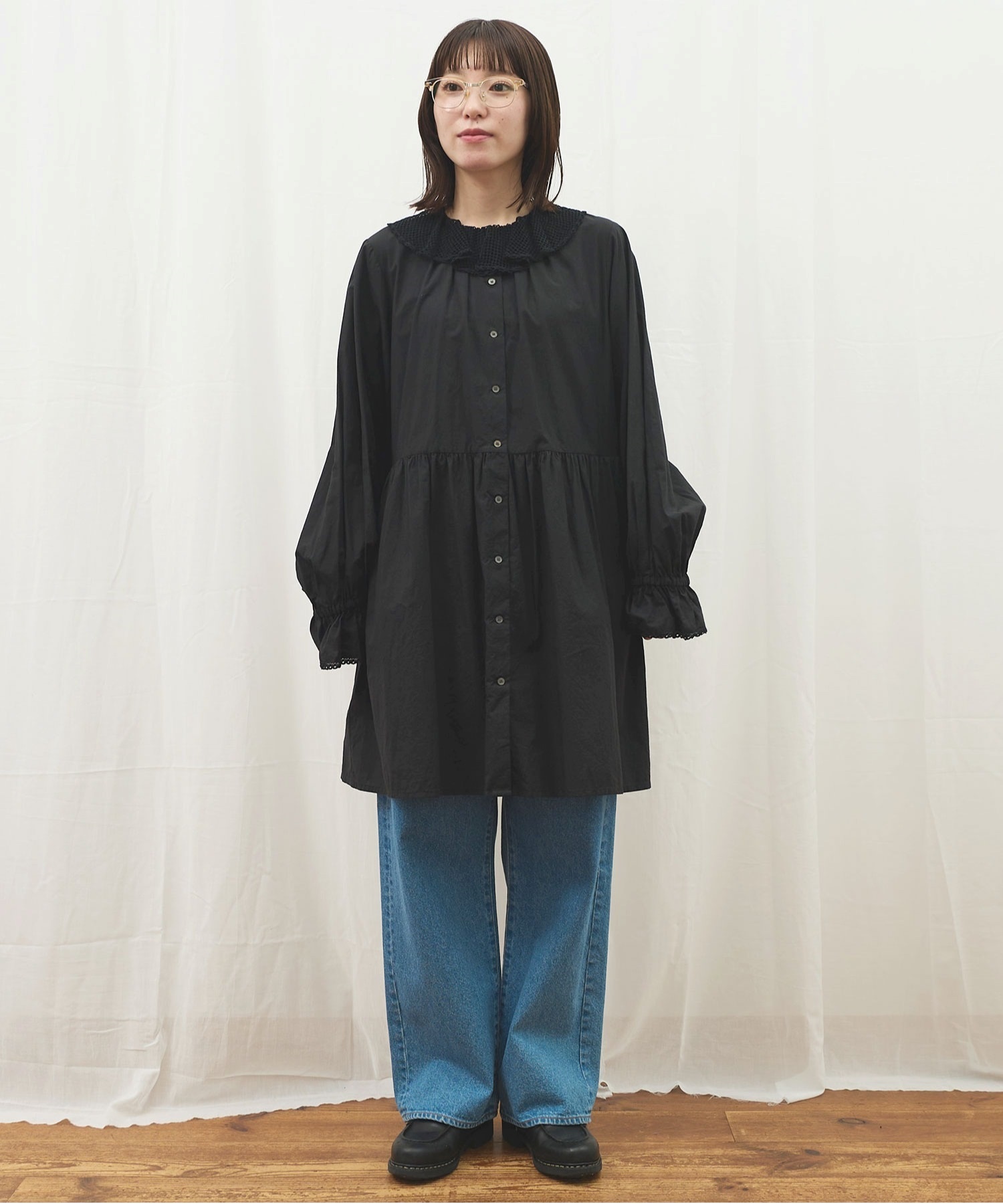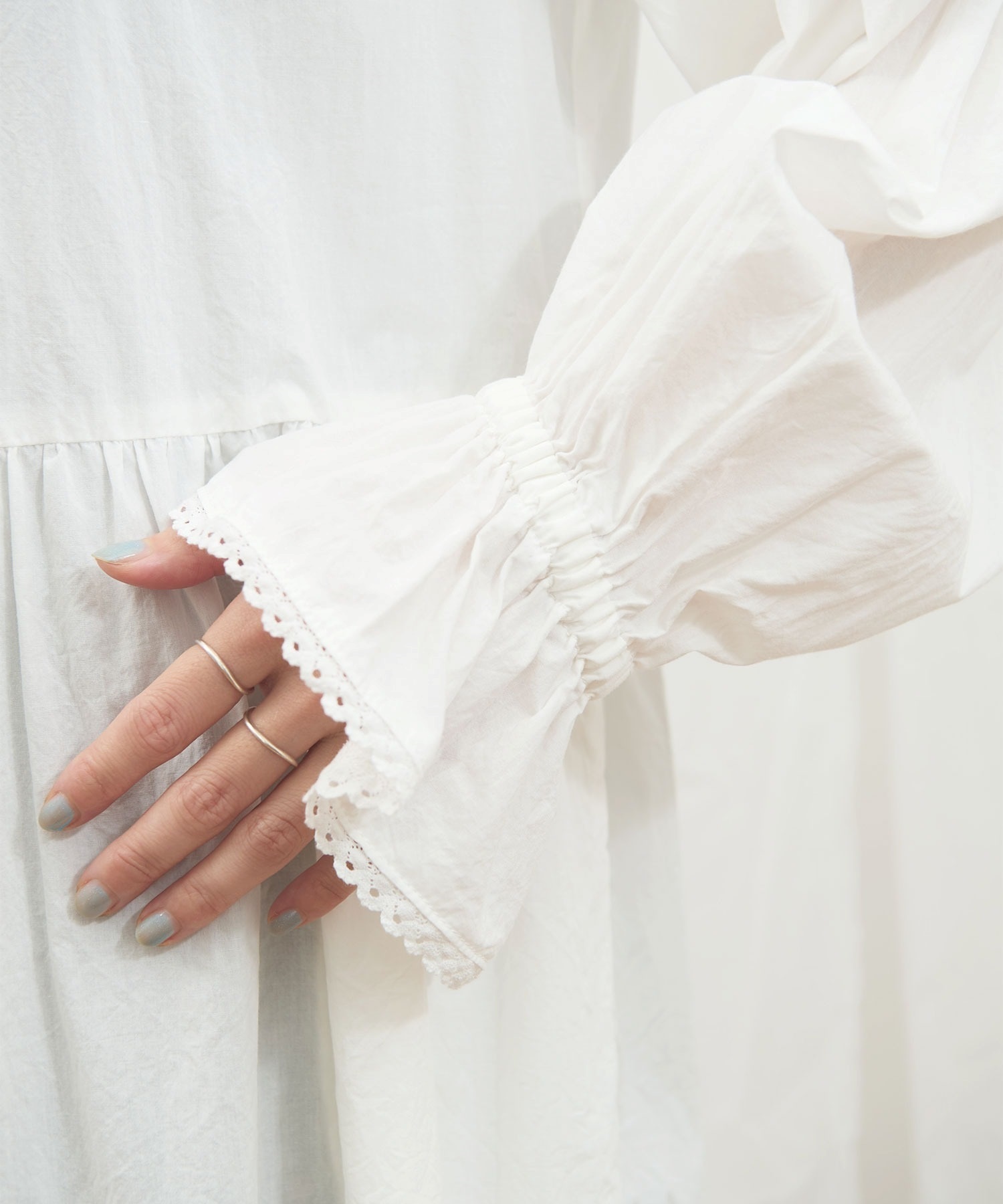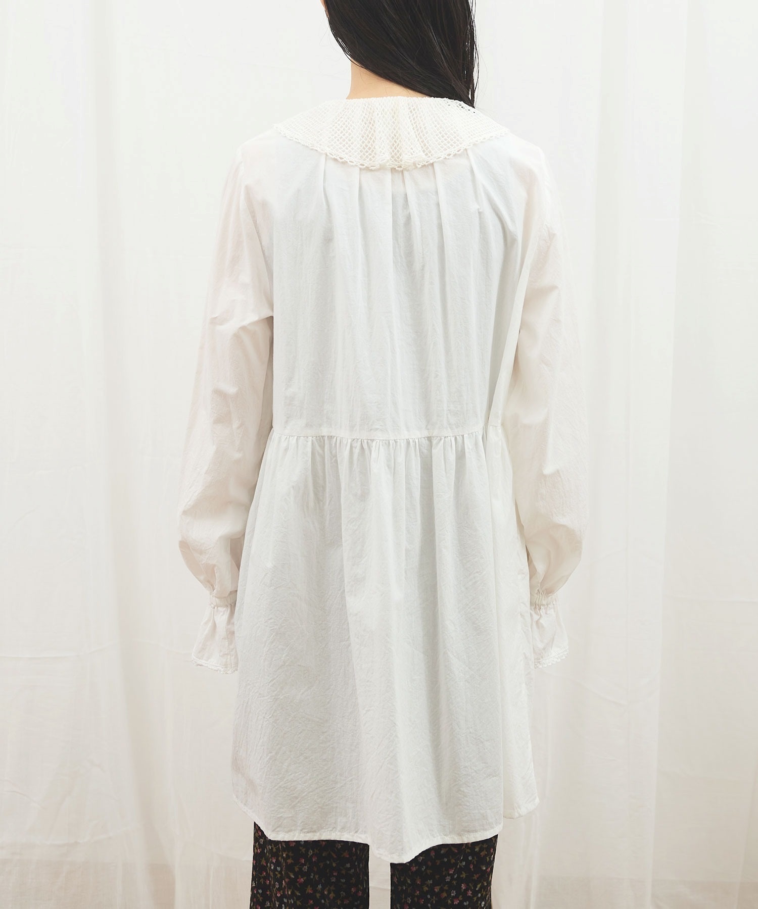 オリジナルで編み立てた格子柄のレースを衿にしたシリーズ。