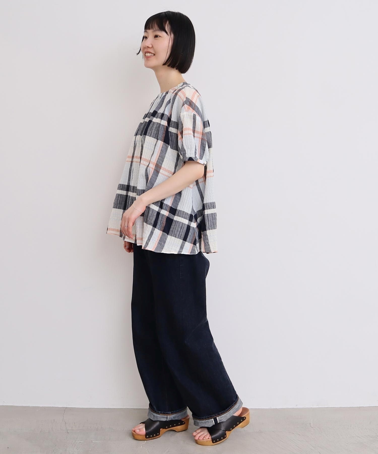 ”高島ちぢみ”という近江産地ならではの生地はノーマルの糸と強撚の糸を組み合わせ、収縮差から生まれる表面のシボ感が特徴。